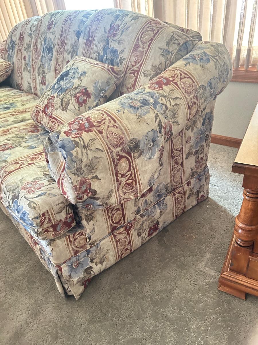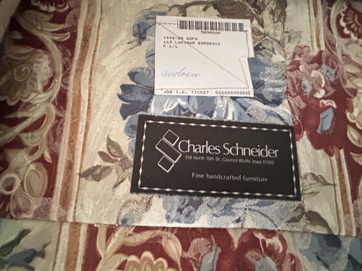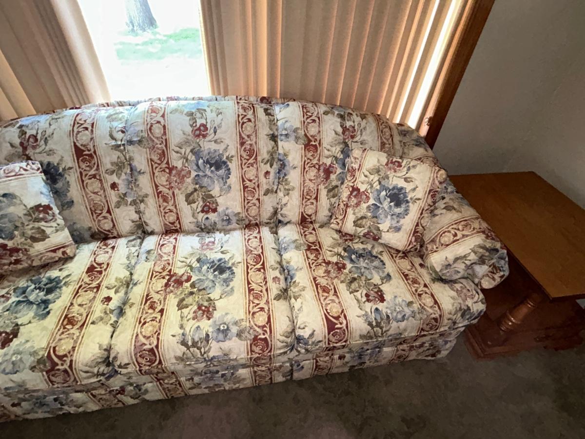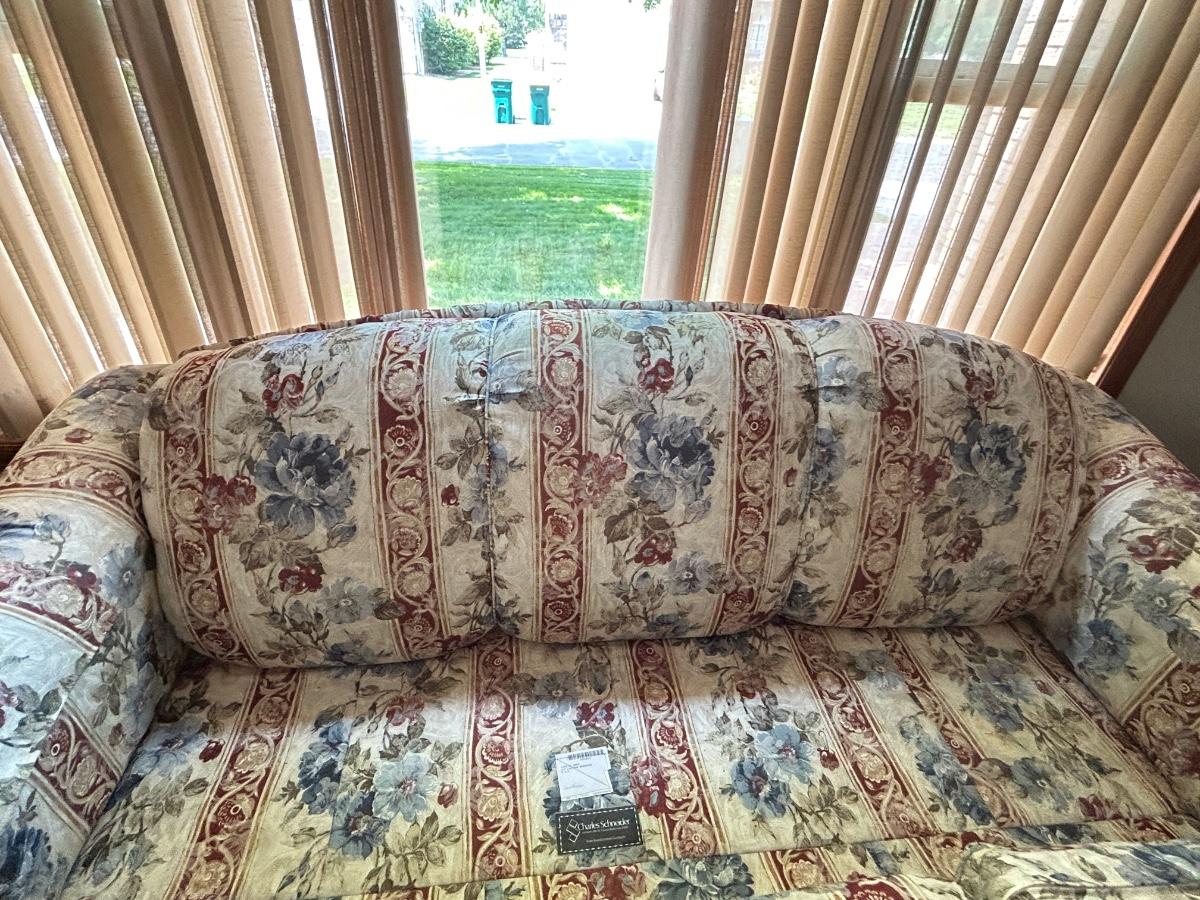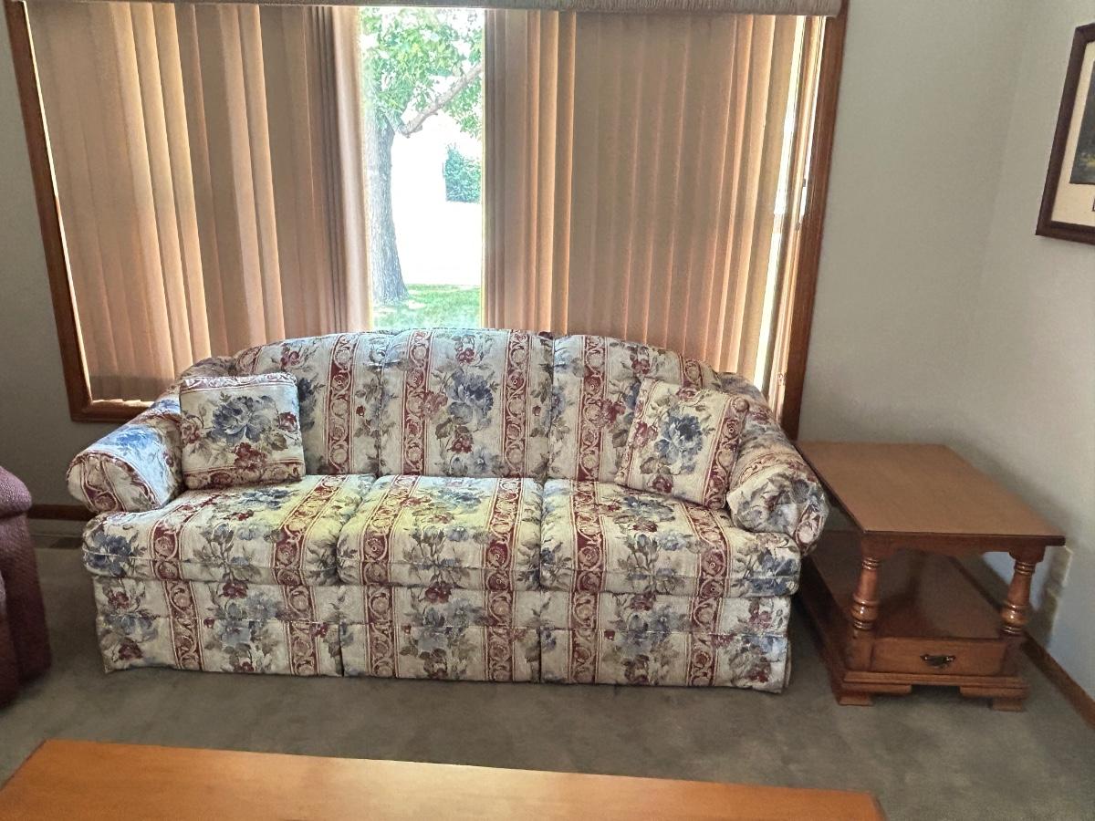 CHARLES SCHNEIDER SOFA AND COLONIAL EARLY AMERICAN ACCENT TABLE