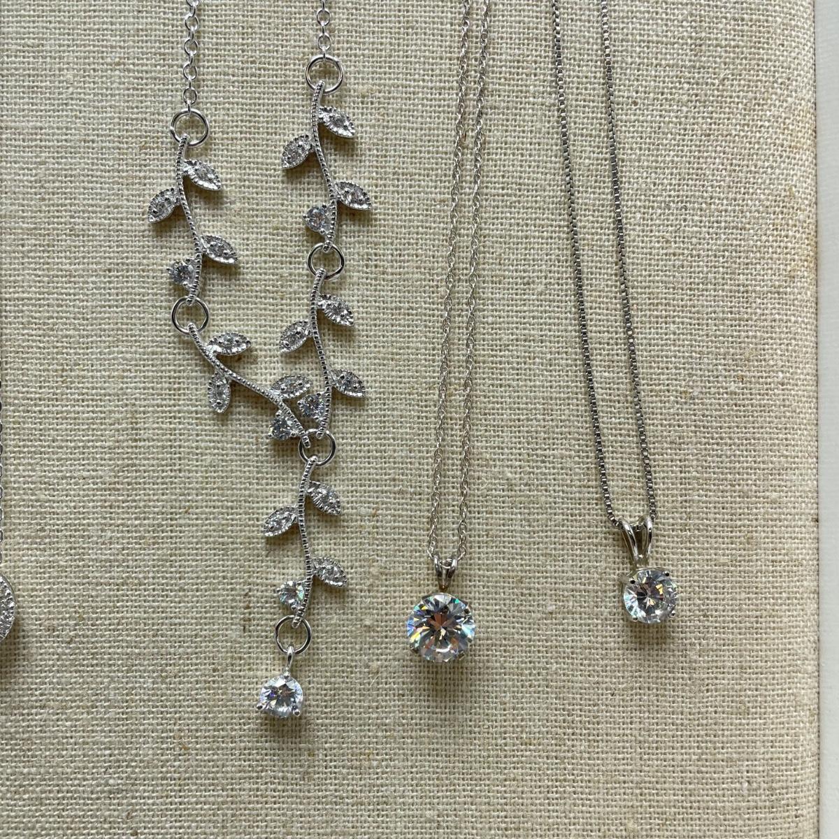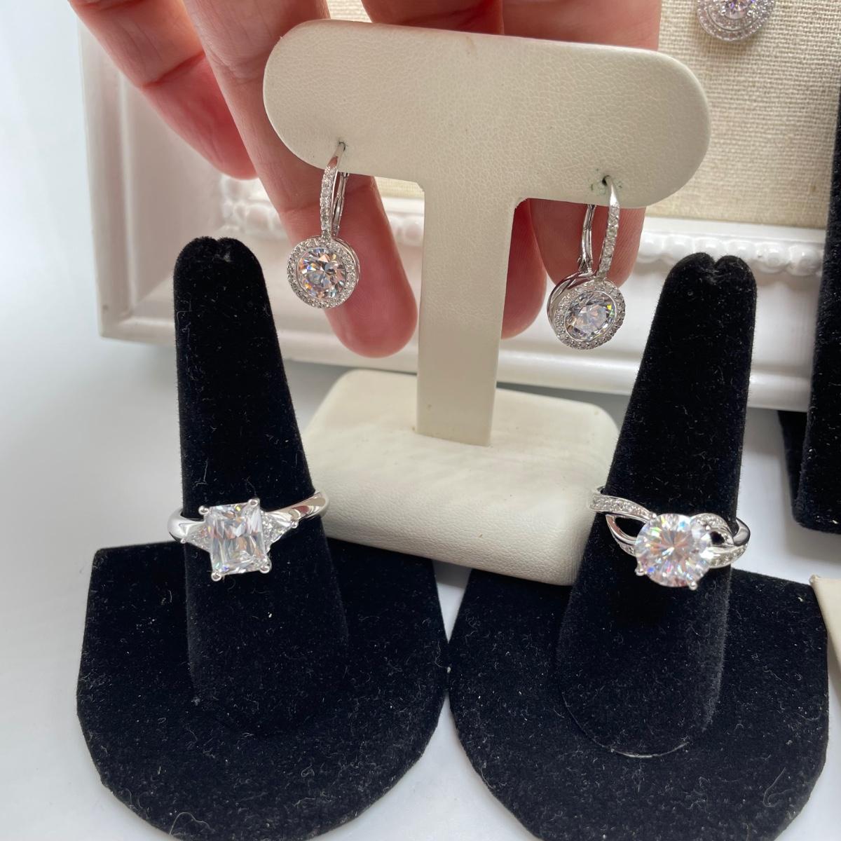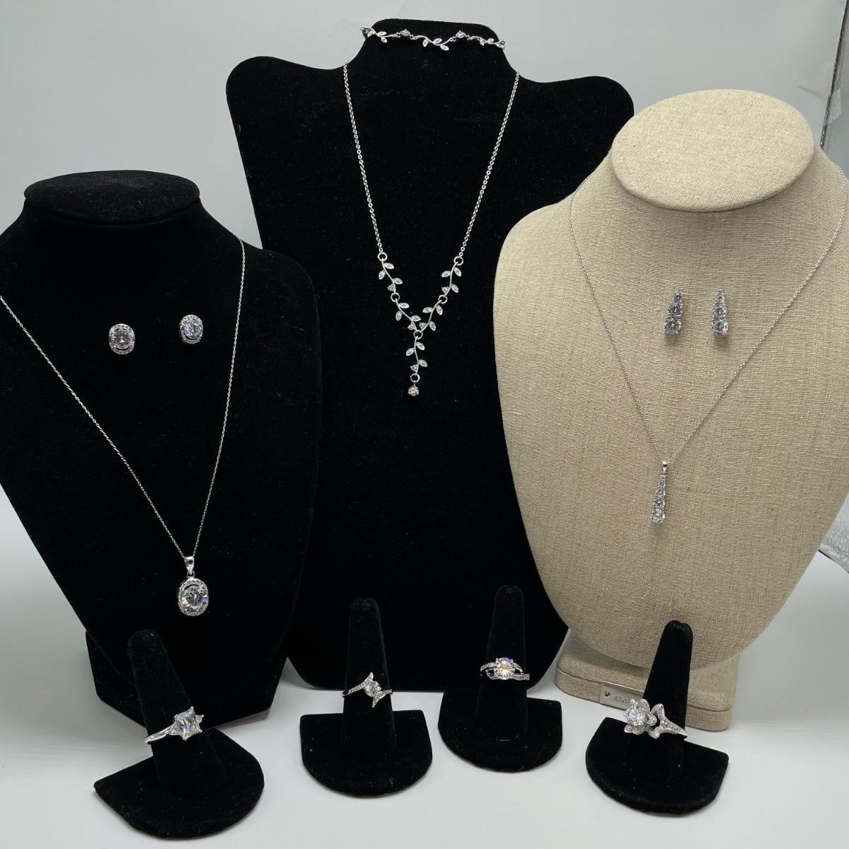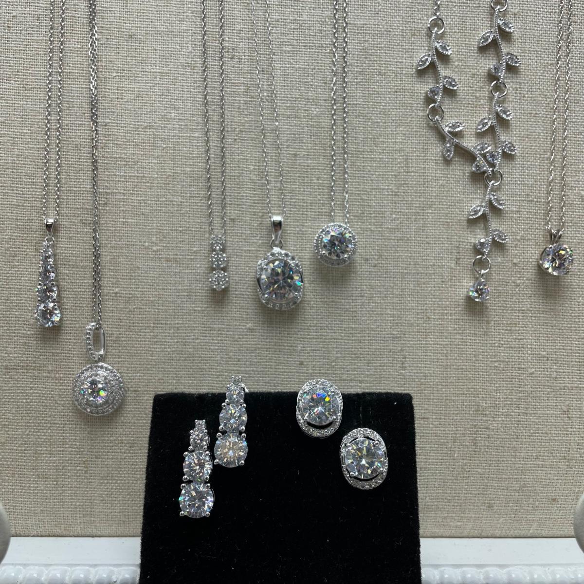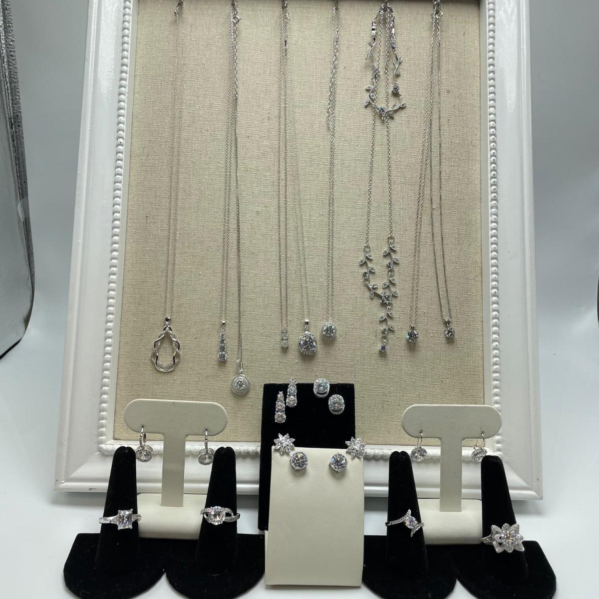 Large collection of jewelry stamped 925. The pendant shown with our diamond tester shows the gem as moissanite, most of the others are likely cubic zirconia (see cz stamps). Lot includes six pairs of earrings for pierced ears, four rings, nine necklaces and one 6” bracelet. The longest chain is about 20”. Please see photos for all markings found. We cannot guarantee the authenticity of the gemstones. All sales are final. No returns or refunds. Please bid accordingly.