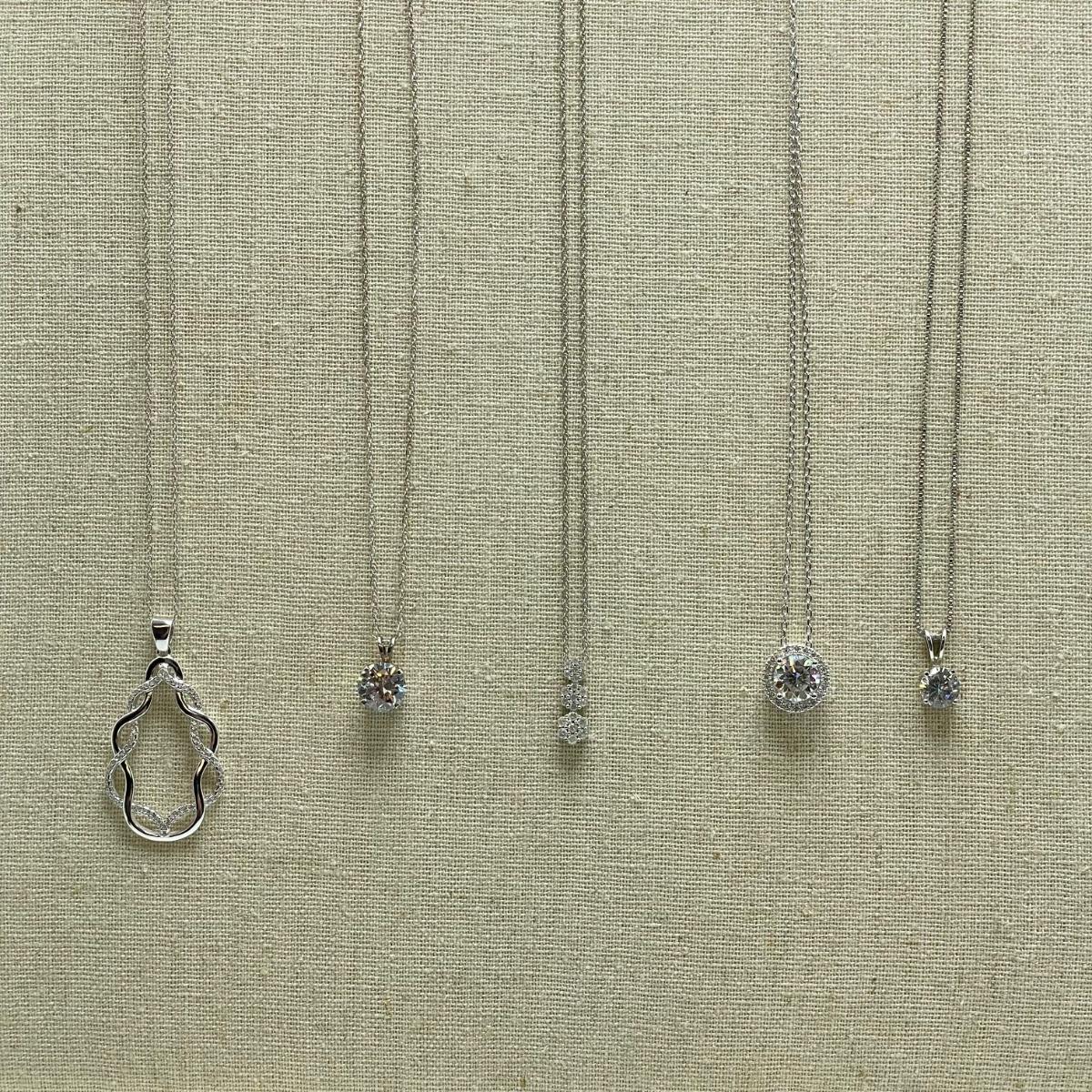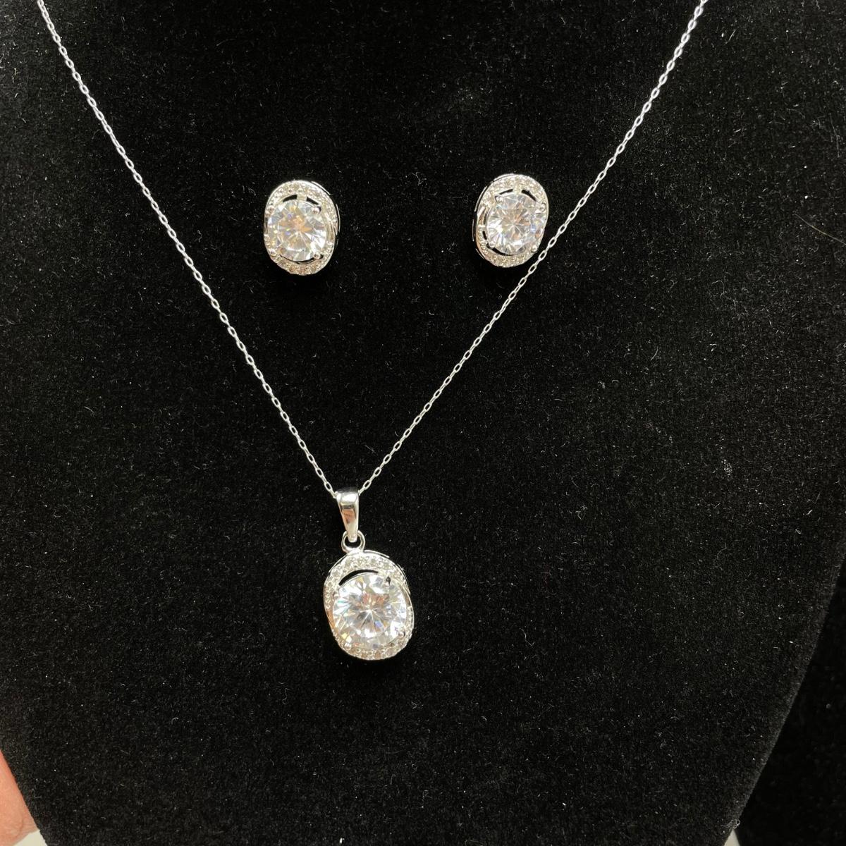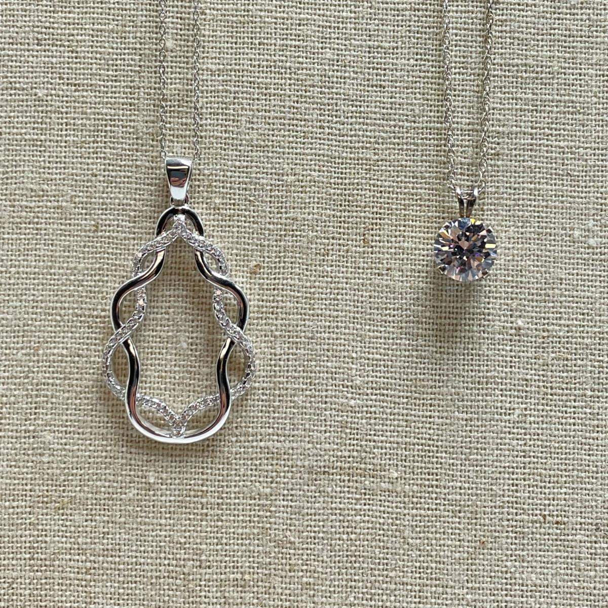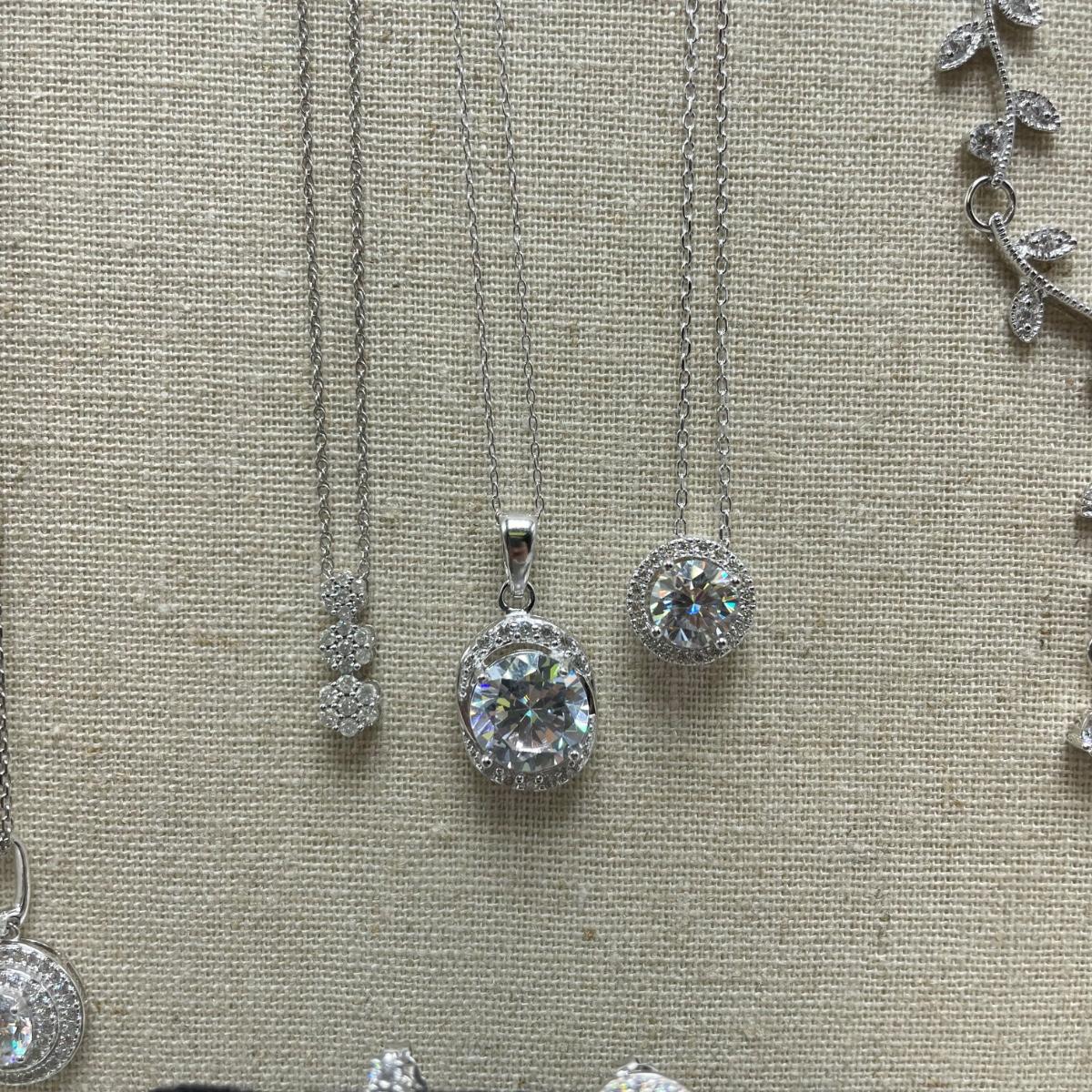 Large collection of jewelry stamped 925. The pendant shown with our diamond tester shows the gem as moissanite, most of the others are likely cubic zirconia (see cz stamps). Lot includes six pairs of earrings for pierced ears, four rings, nine necklaces and one 6” bracelet. The longest chain is about 20”. Please see photos for all markings found. We cannot guarantee the authenticity of the gemstones. All sales are final. No returns or refunds. Please bid accordingly.