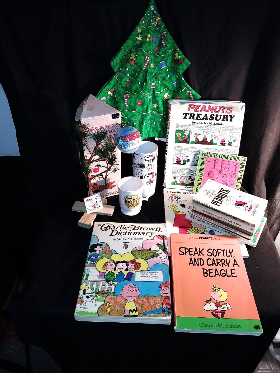 TREE APPROX. 12" TALL, HARDBACK AND SOFTBACK BOOKS, CUPS AND MAGNET, ORNAMENT AND MORE