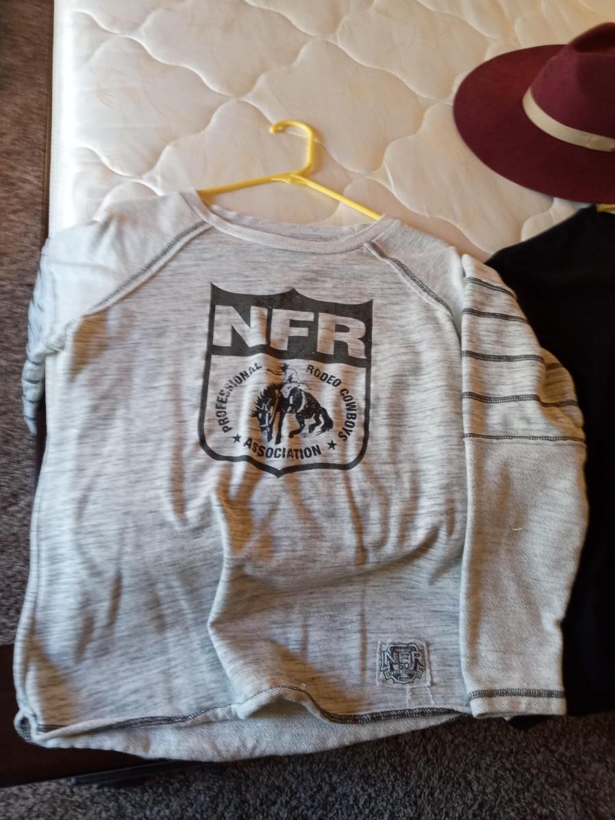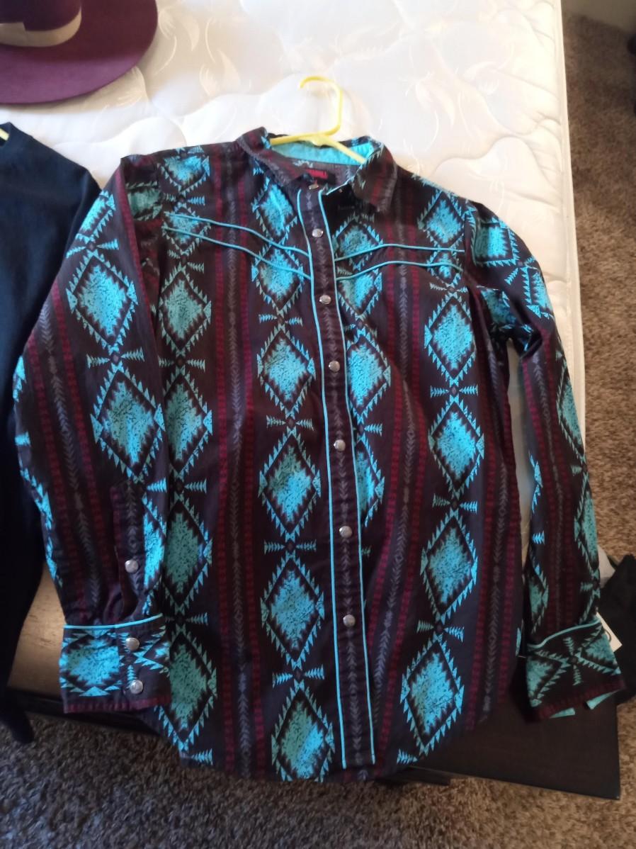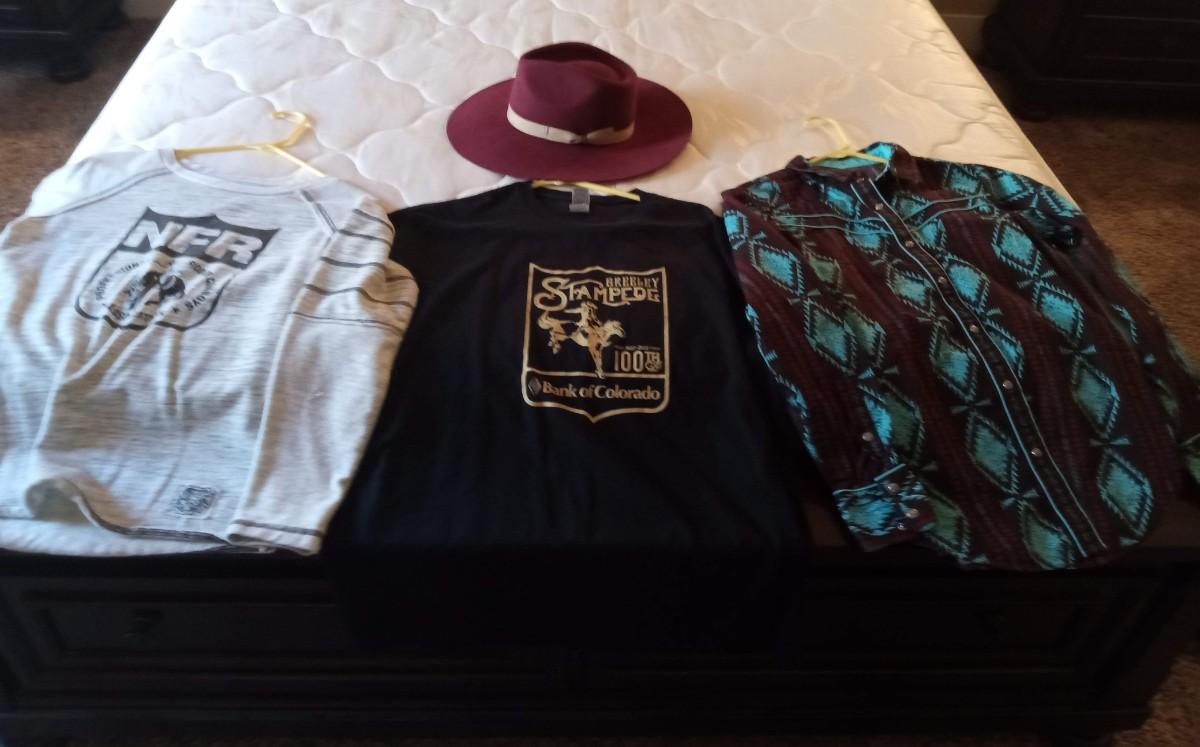 BURGUNDY HAT IS SMALL, THE 2 SHIRTS ON THE OUTSIDES ARE MEDIUM AND THE STAMPEDE SHIRT IS XL