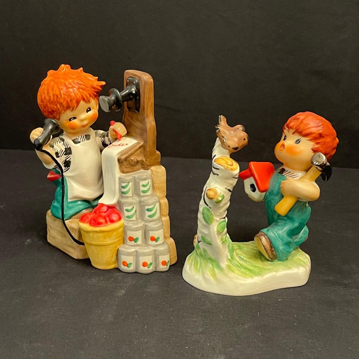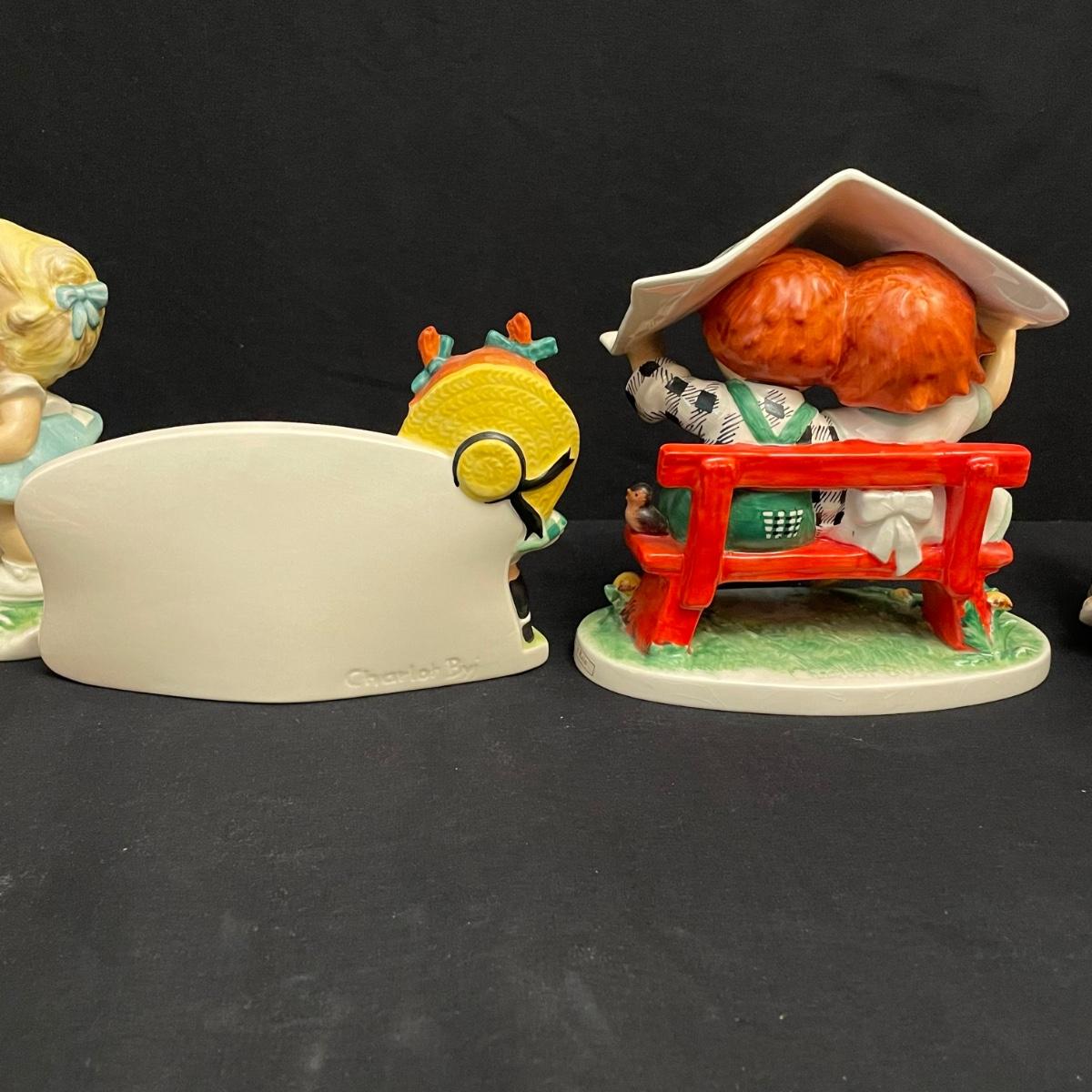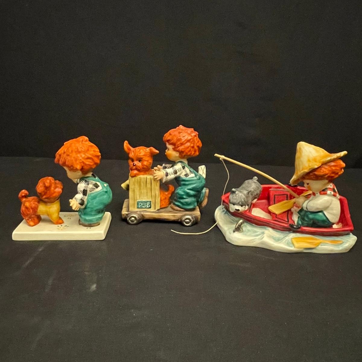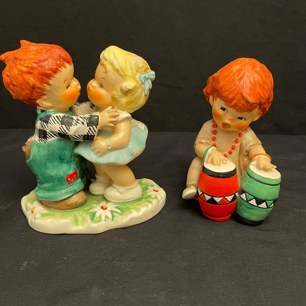 A large selection of Charlot Byj The Red Heads Figurines by Goebel. Lot includes five pieces with a boy/girl duo, 15 single children (some with pets) and one Goebel porcelain sign. The largest piece is the two kids on a bench titled “Let it Rain”, it measures 6.25” x 3” x 6.25”H. See images, there is crazing present on some items. No known blemishes, please come to preview to inspect in person. Shipping available.