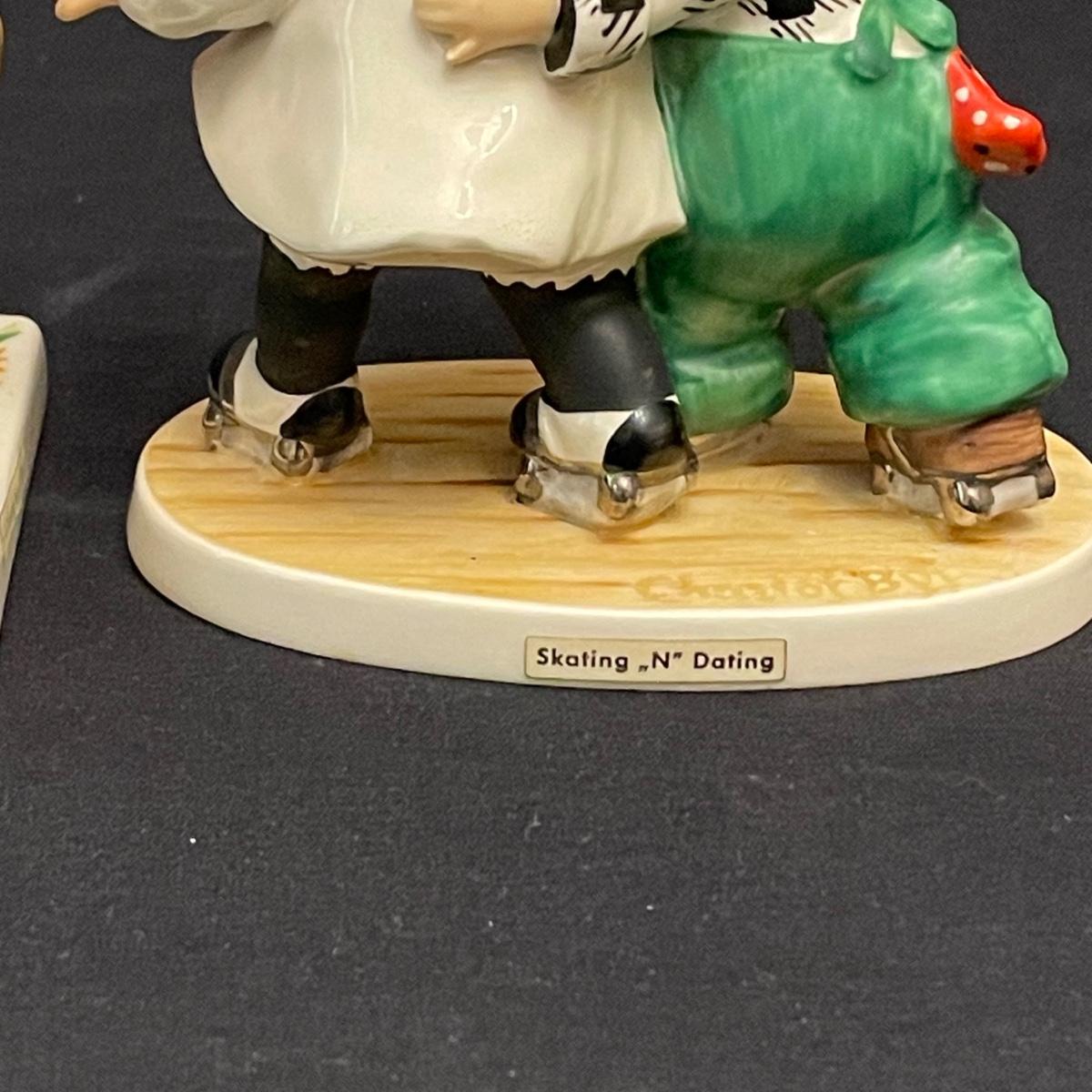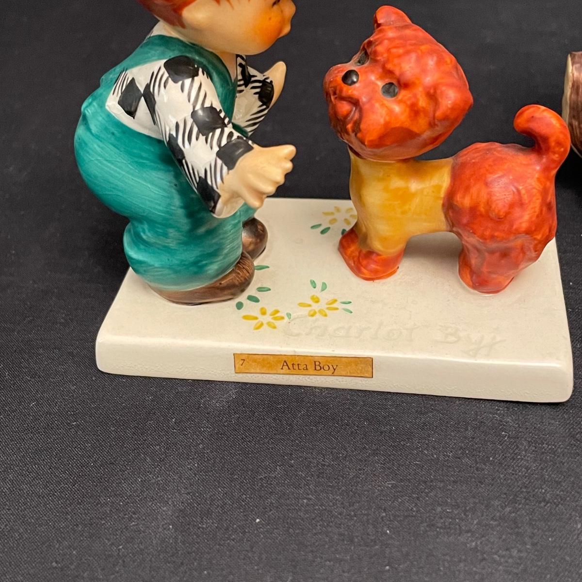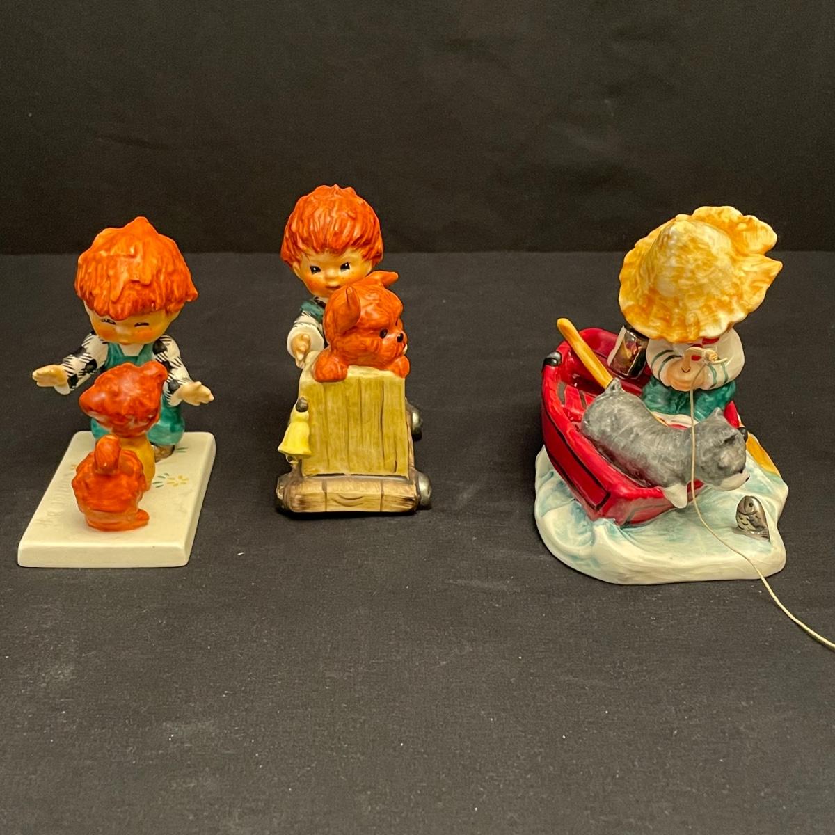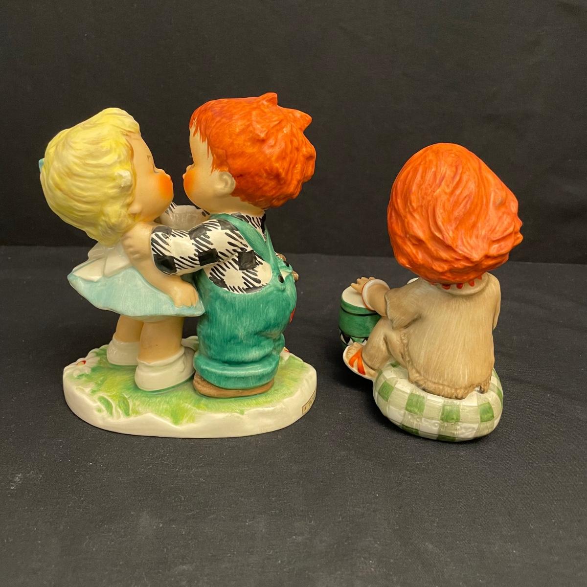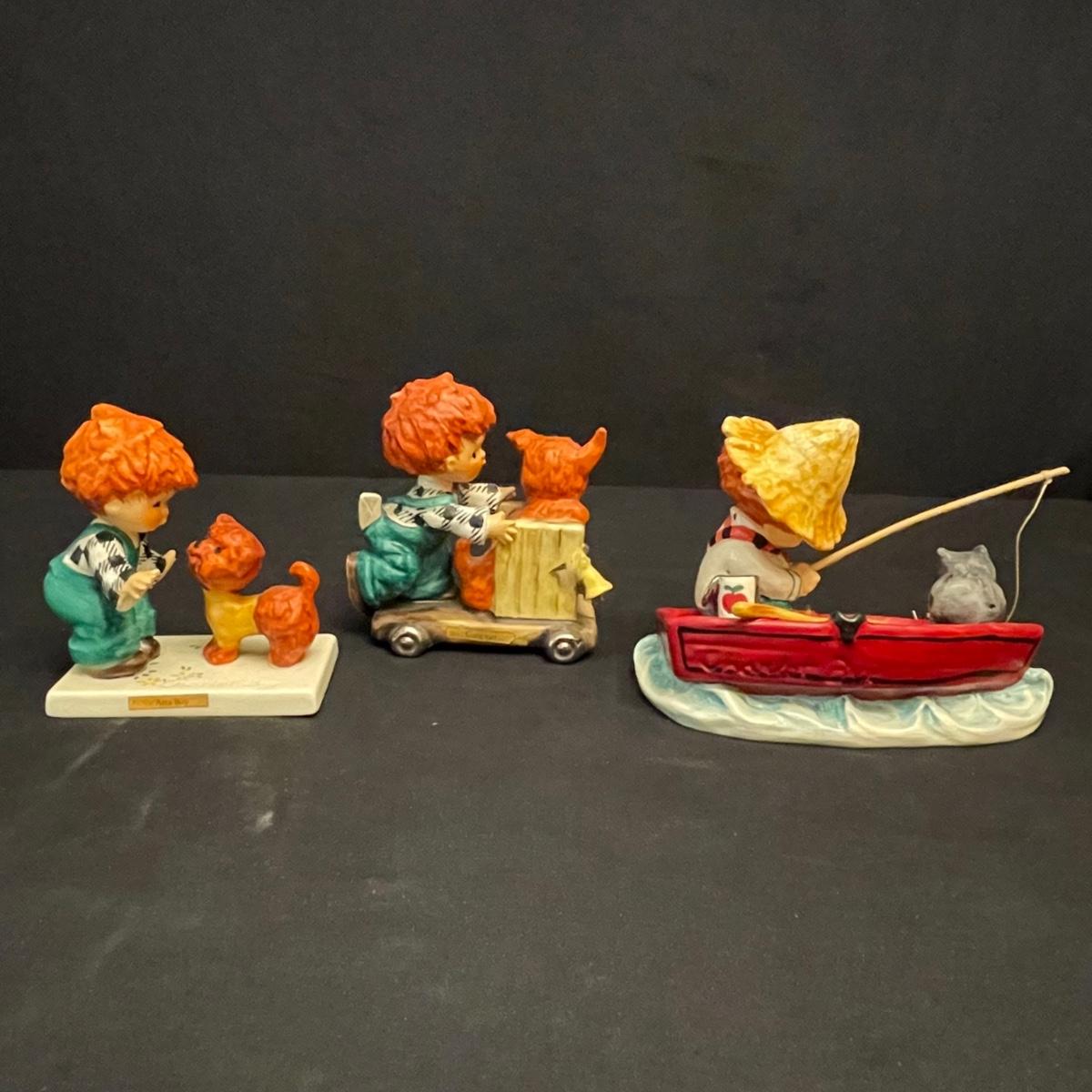 A large selection of Charlot Byj The Red Heads Figurines by Goebel. Lot includes five pieces with a boy/girl duo, 15 single children (some with pets) and one Goebel porcelain sign. The largest piece is the two kids on a bench titled “Let it Rain”, it measures 6.25” x 3” x 6.25”H. See images, there is crazing present on some items. No known blemishes, please come to preview to inspect in person. Shipping available.