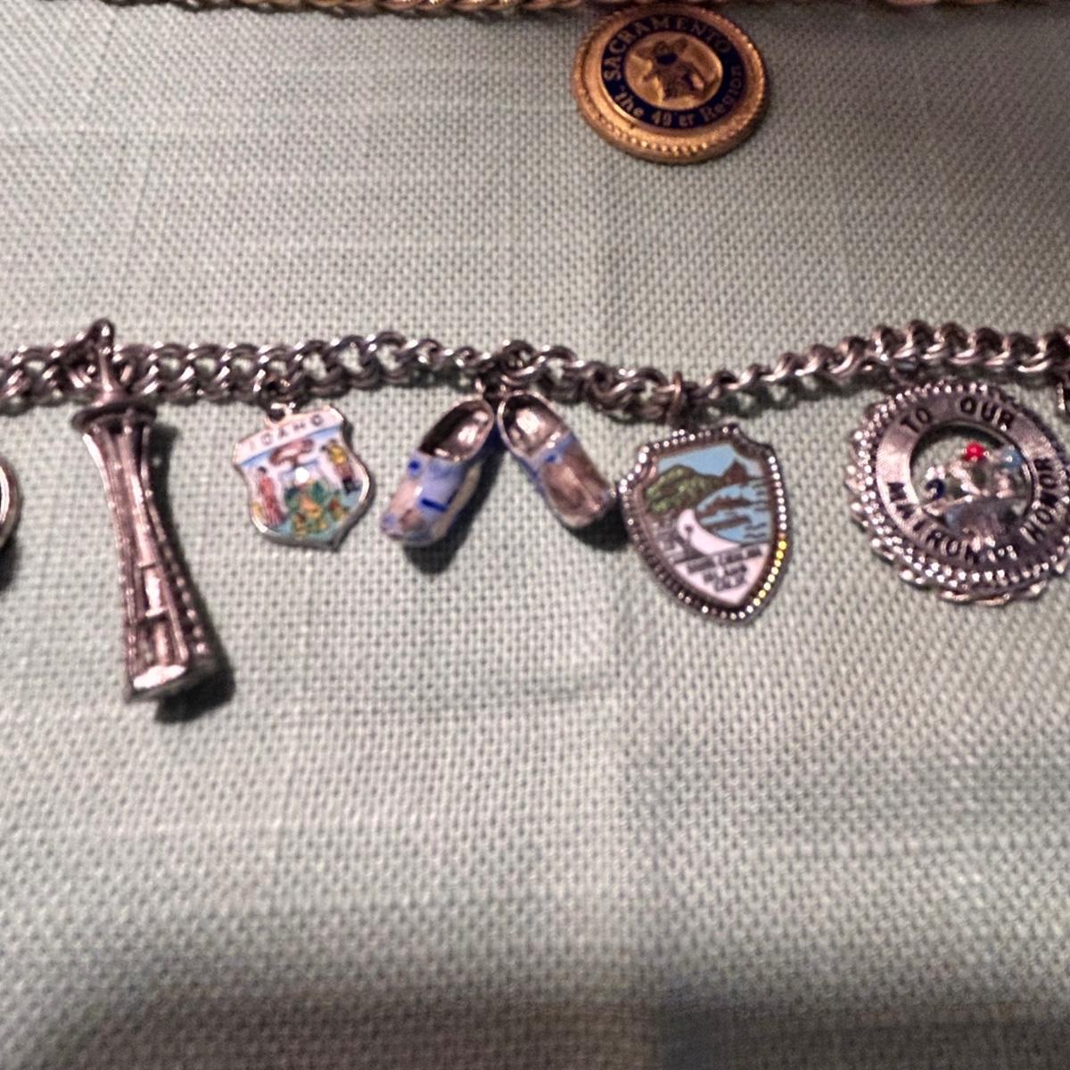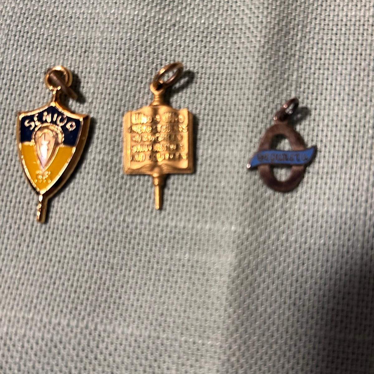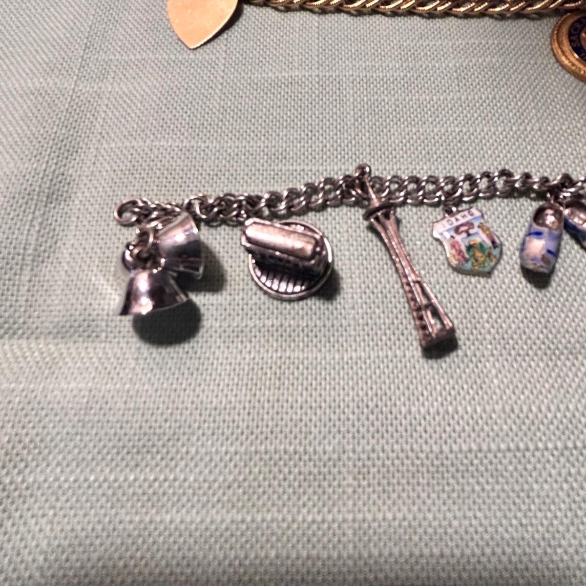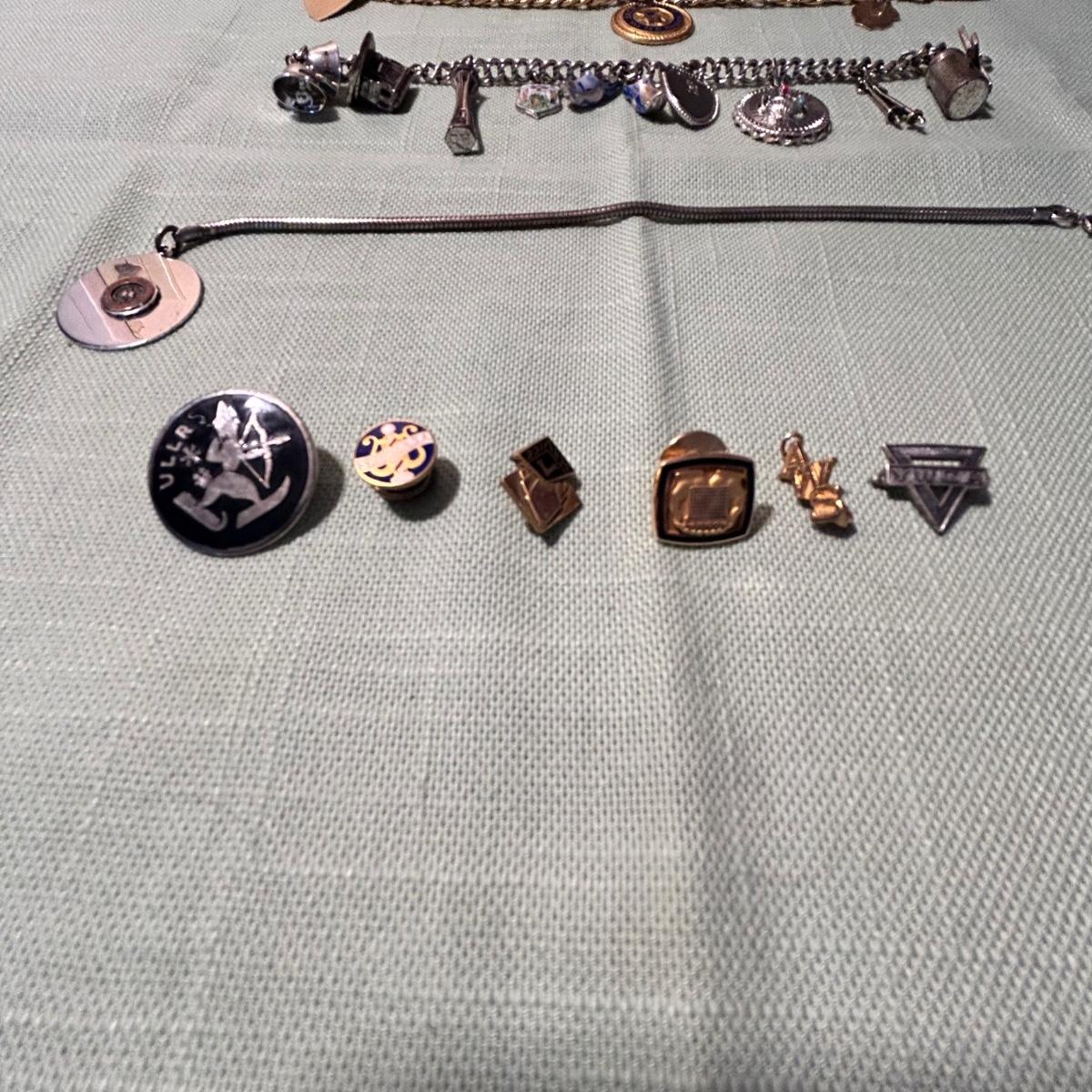 Three charm bracelets, six pins and three pendants in this lot. One 14k pin, a sterling vintage YMCA pin, the gold colored bracelet with charms is Monet and has one 14k pendant, the silver charm bracelet with many charms has a few. Sterling pendants. See pix for details. Shipping available.