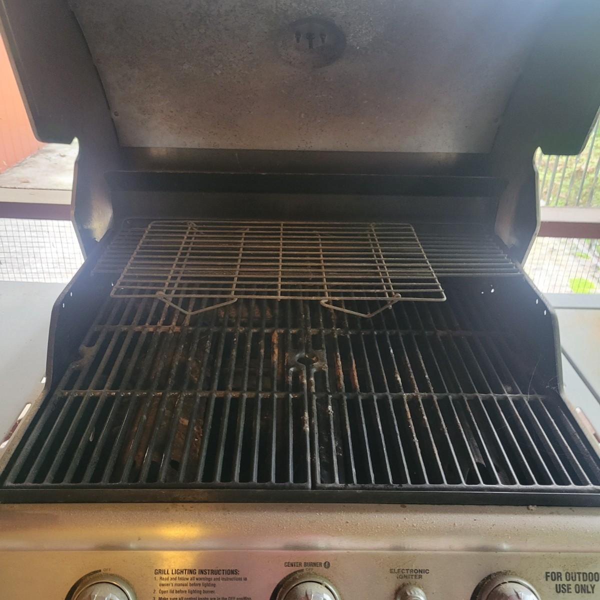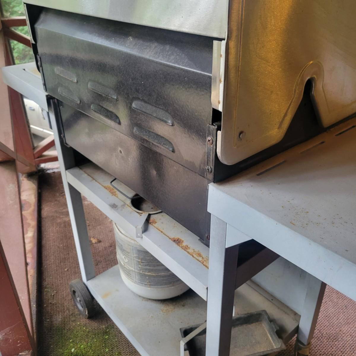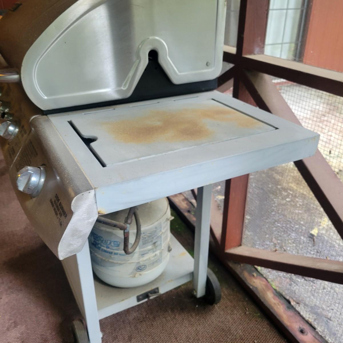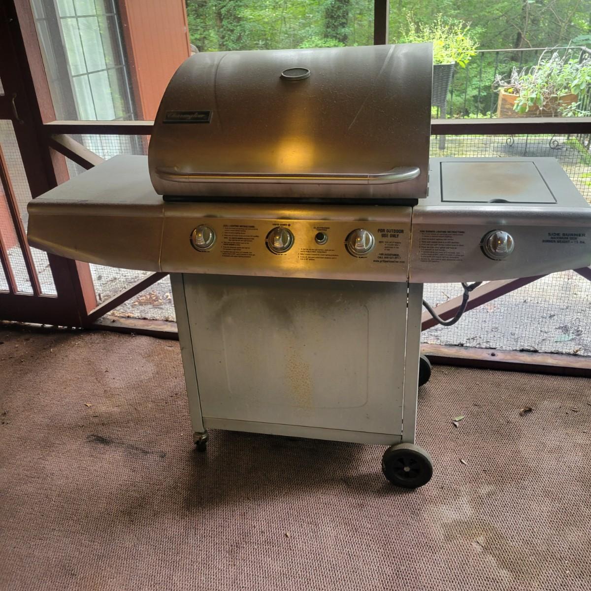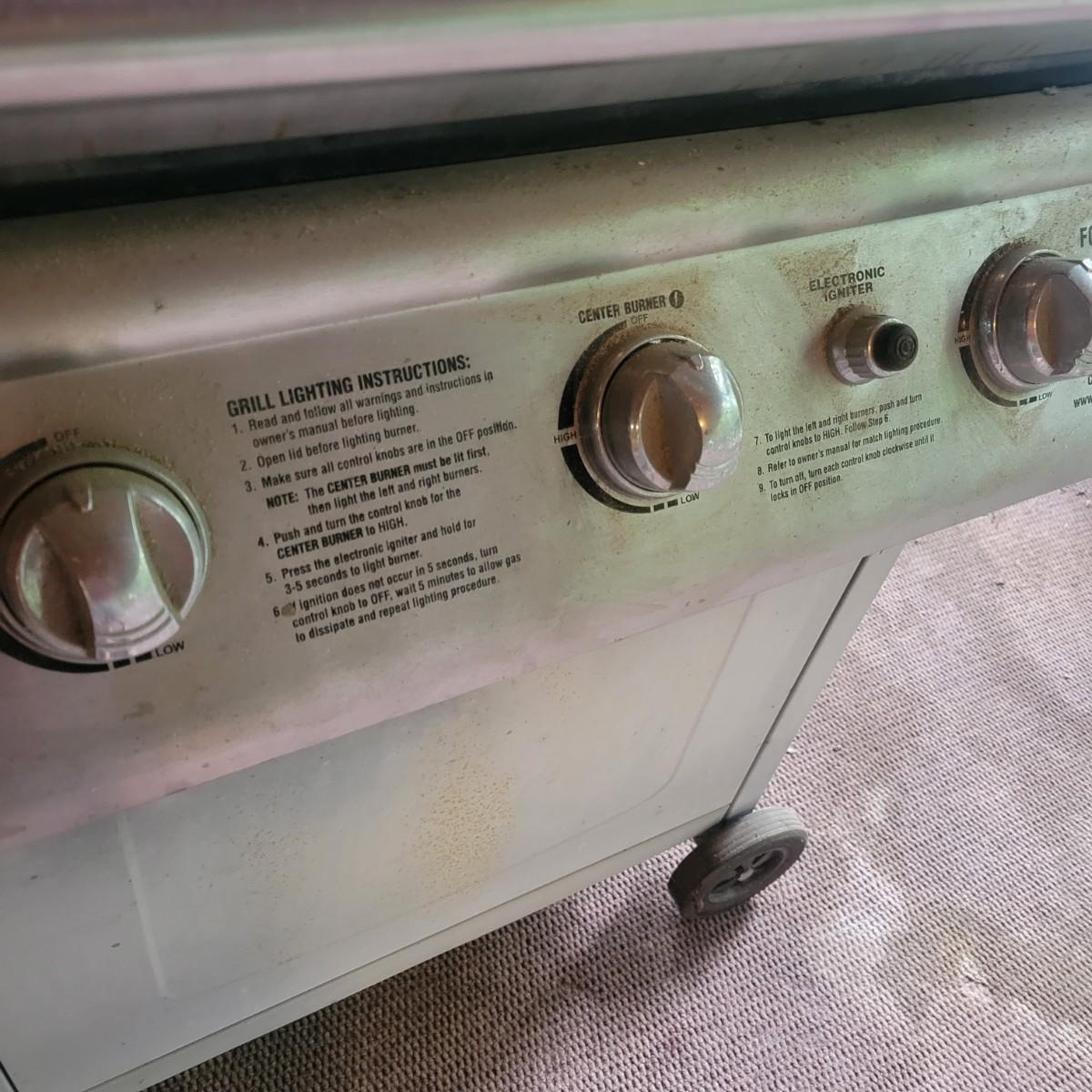 A three burner Charmglow gas grill with a side burner in good condition with a small amount of rust. Grill interiors are in good shape. Flame guards are a bit corroded but the metal grates are fully intact. Grill has four wheels to make moving it easy. The ignition pizel did not work and grill was not tested. Grill measures approximately 56.5" x 24" x 48". 20lb propane cylinder is included. Local pickup only