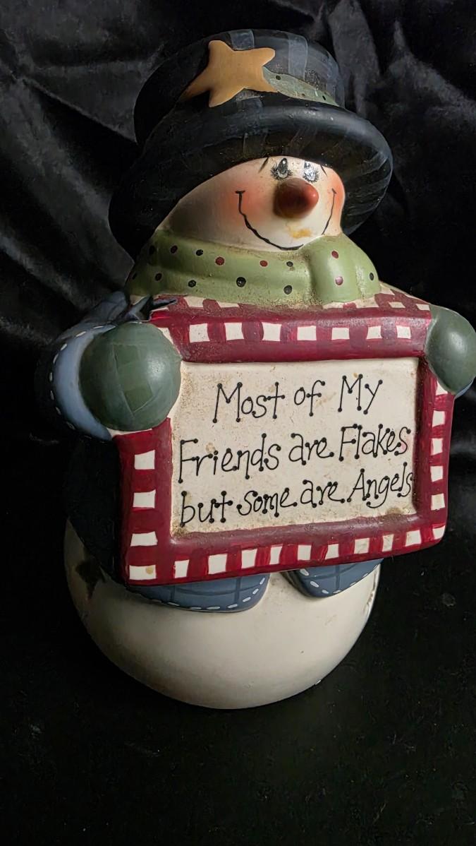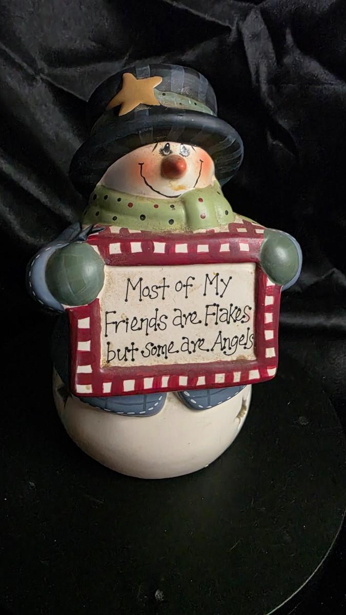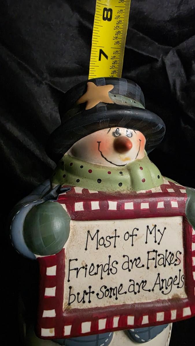 Bring home a burst of holiday cheer with this wonderfully whimsical 8-inch ceramic snowman figurine, a heartwarming seasonal accent bursting with personality and charm. Crafted with delightful folk-art styling, this piece features a smiling snowman bundled in a patterned scarf and tall winter hat, holding a sign that reads, “Most of My Friends Are Flakes… but some are Angels.” It’s a humorous, feel-good sentiment that instantly adds warmth to any Christmas display, from tabletop vignettes to mantle arrangements.