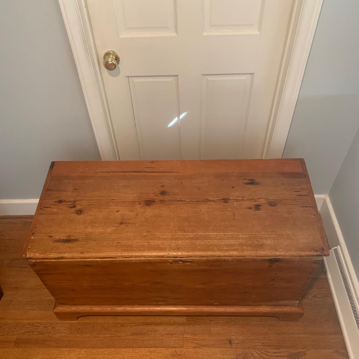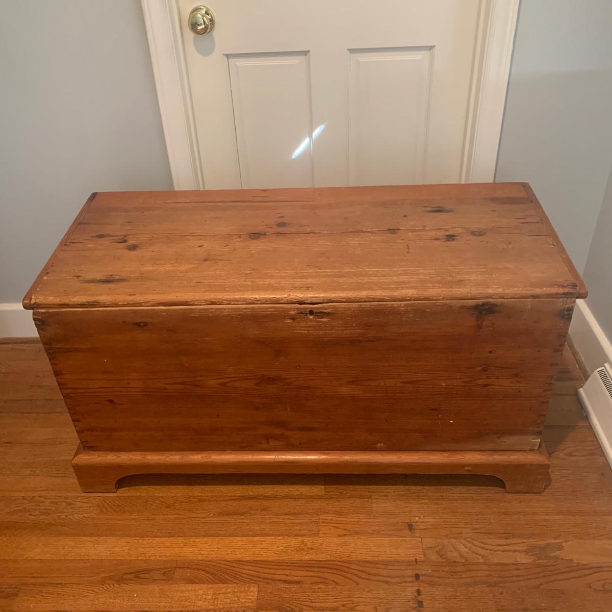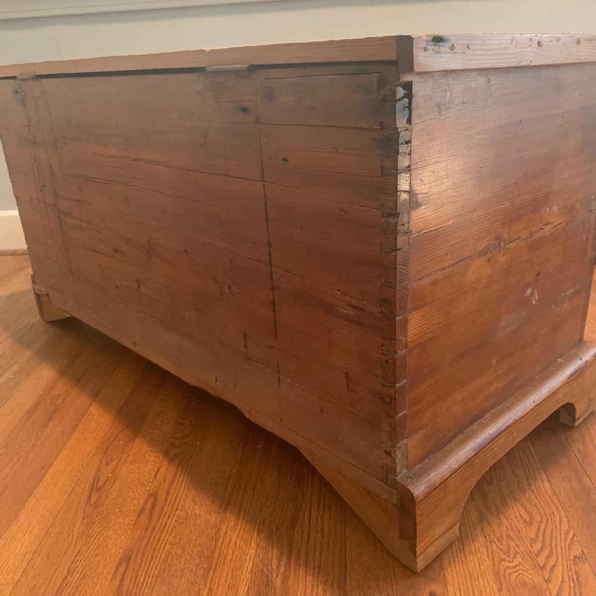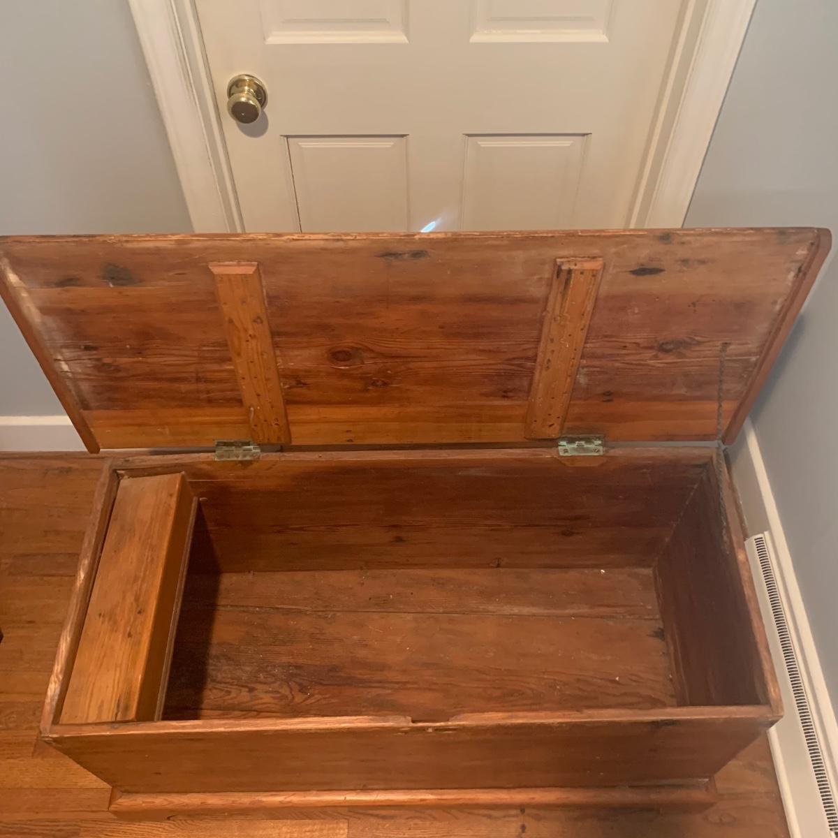 Charming antique wooden trunk with hand cut dovetail corners and bracket feet. Hinges are a bit weathered but work very well. This chest opens easily and stays open using a chain. This chest features a small compartment on the left side, which needs a little glue. See photos for more details. Overall good condition. Item measures, 44.5”L x 19.5”W x 22.5”H.