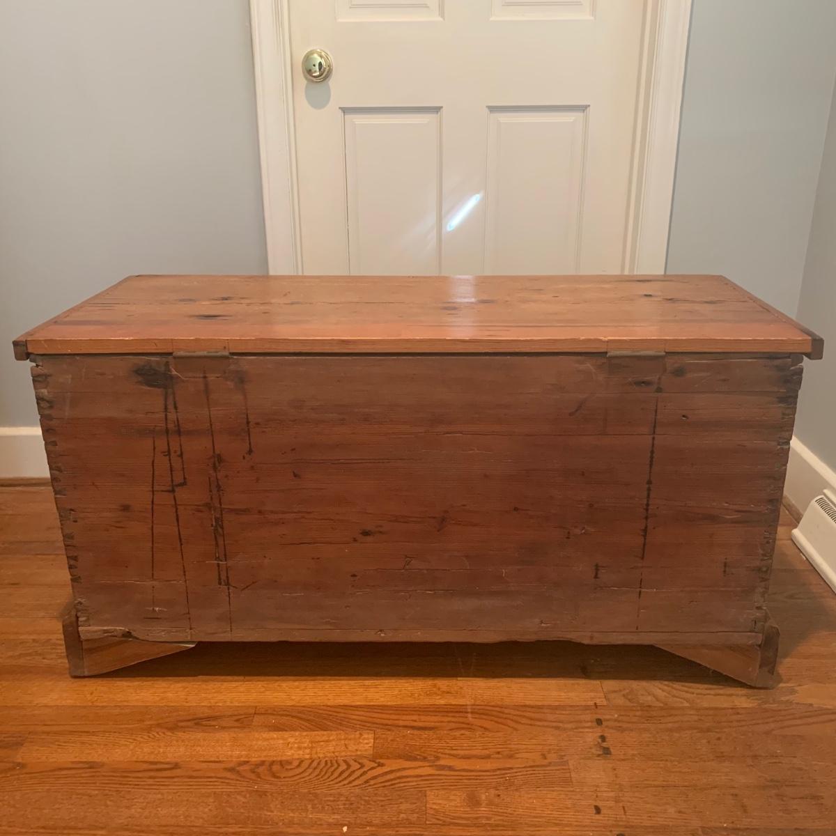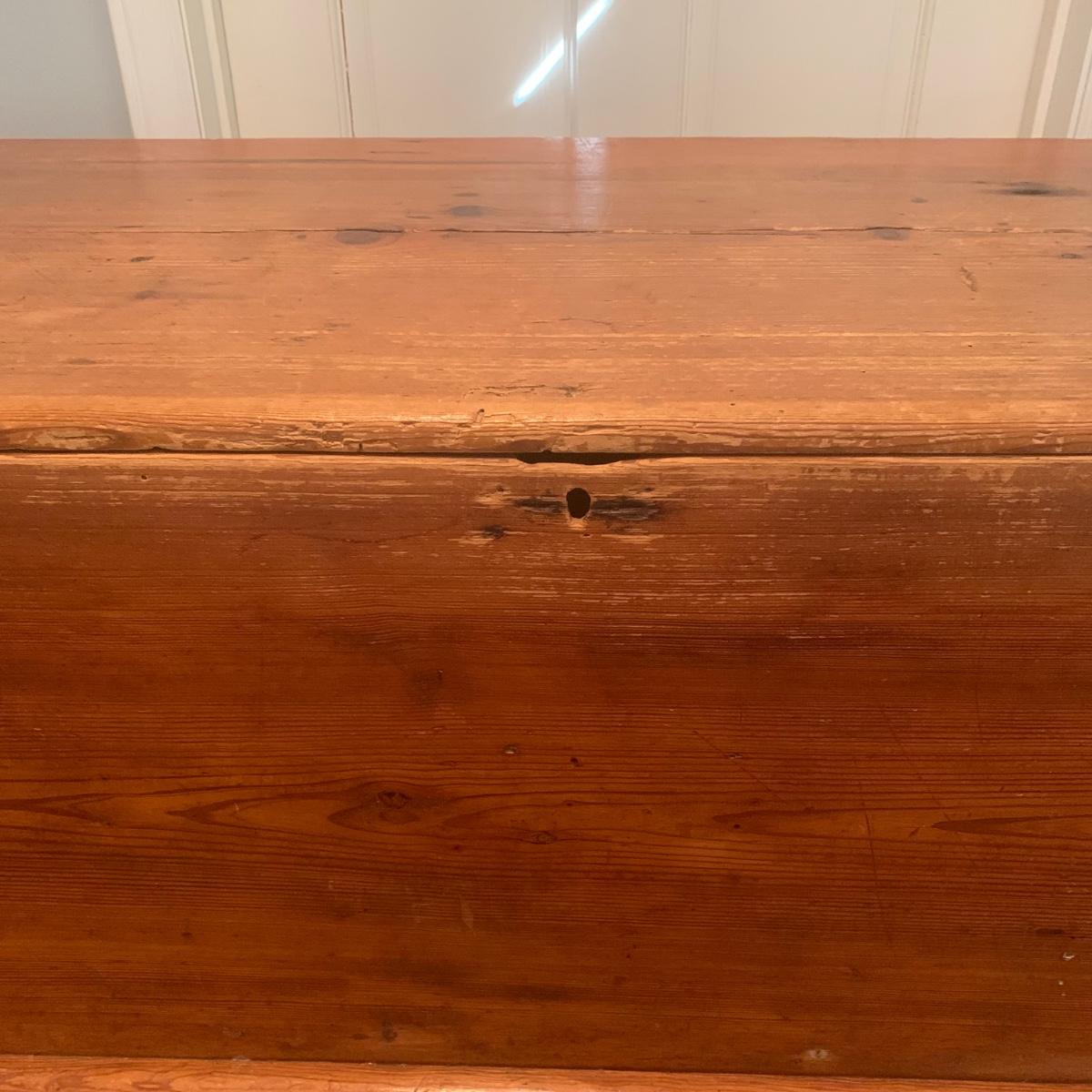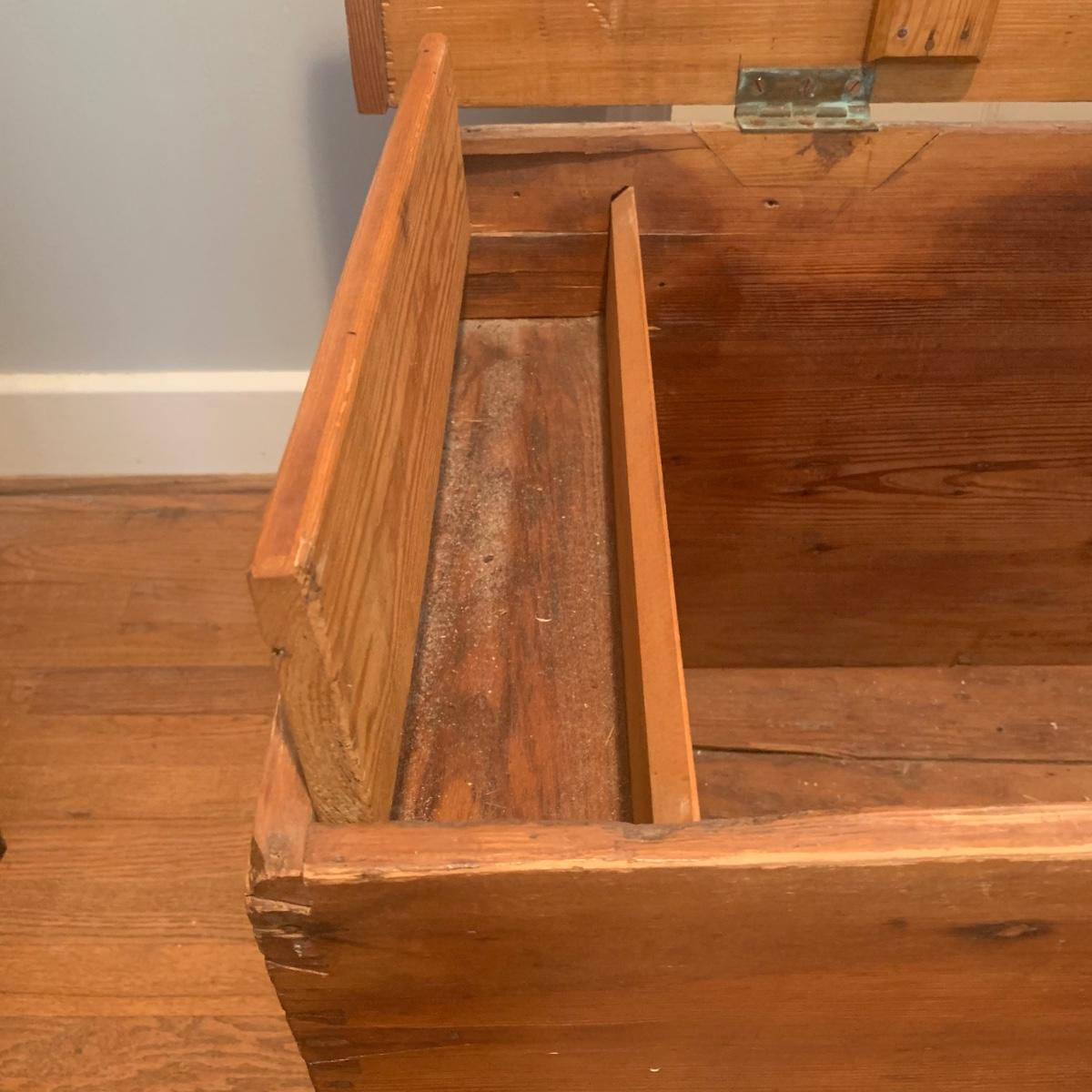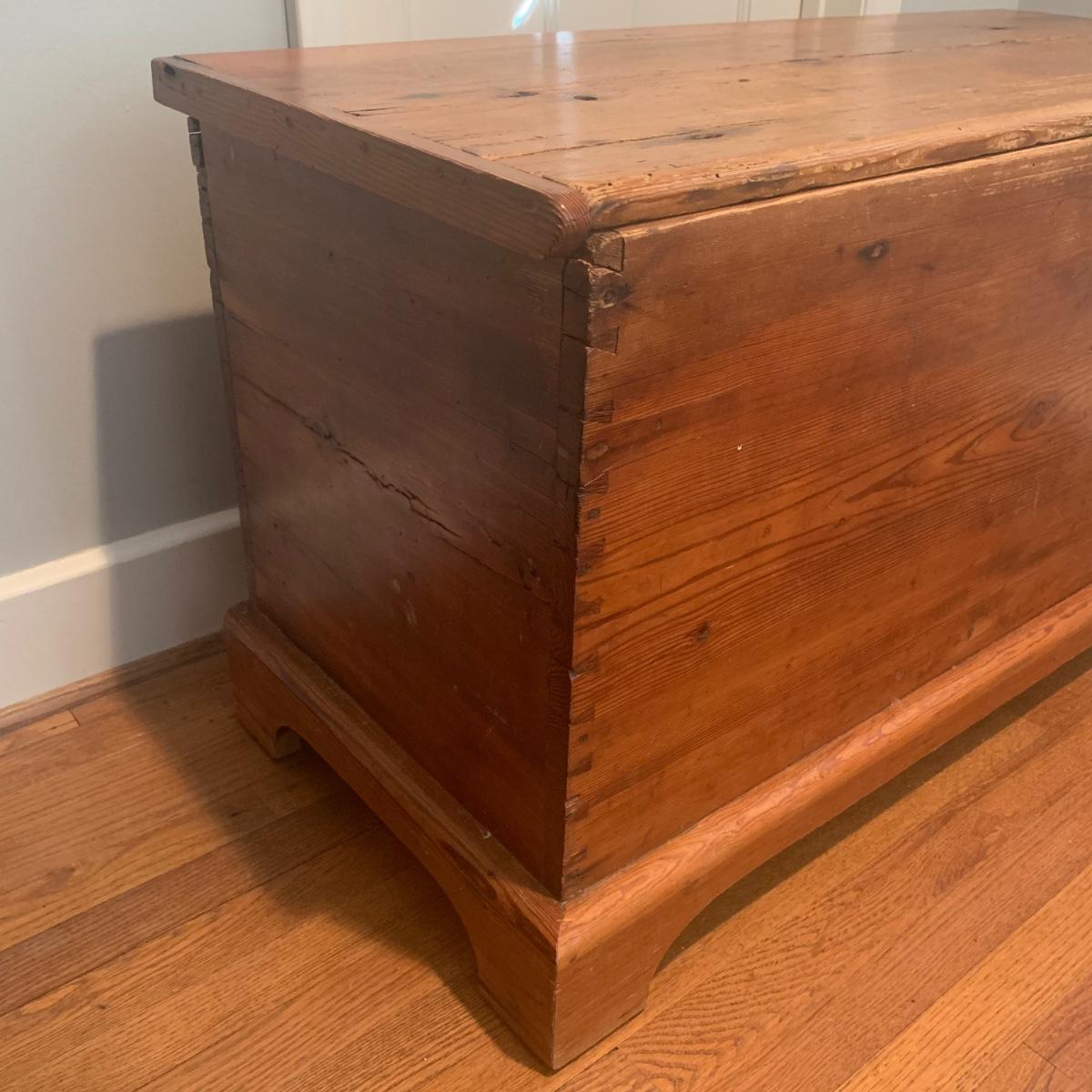 Charming antique wooden trunk with hand cut dovetail corners and bracket feet. Hinges are a bit weathered but work very well. This chest opens easily and stays open using a chain. This chest features a small compartment on the left side, which needs a little glue. See photos for more details. Overall good condition. Item measures, 44.5”L x 19.5”W x 22.5”H.
