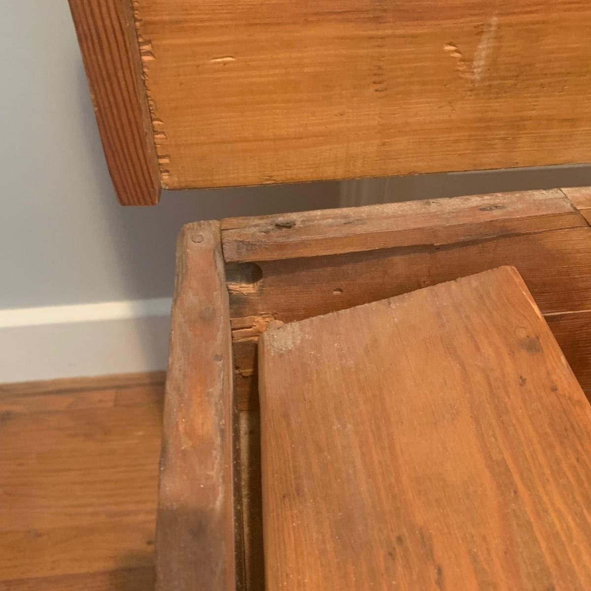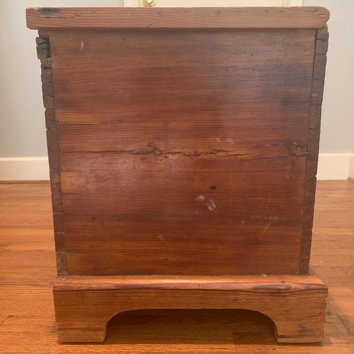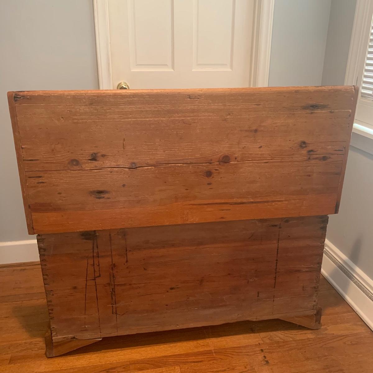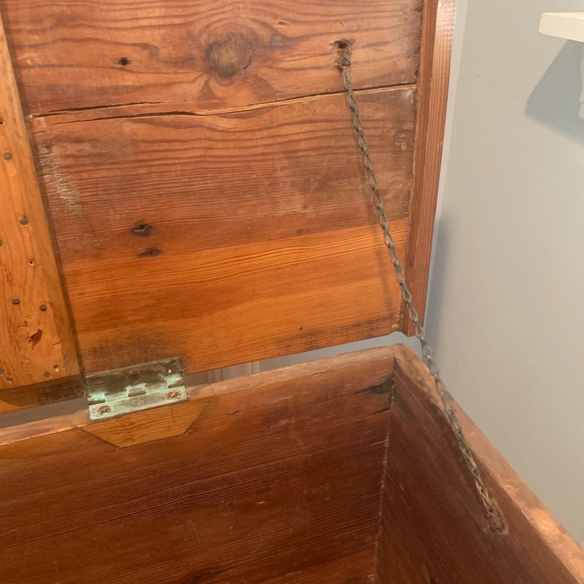 Charming antique wooden trunk with hand cut dovetail corners and bracket feet. Hinges are a bit weathered but work very well. This chest opens easily and stays open using a chain. This chest features a small compartment on the left side, which needs a little glue. See photos for more details. Overall good condition. Item measures, 44.5”L x 19.5”W x 22.5”H.