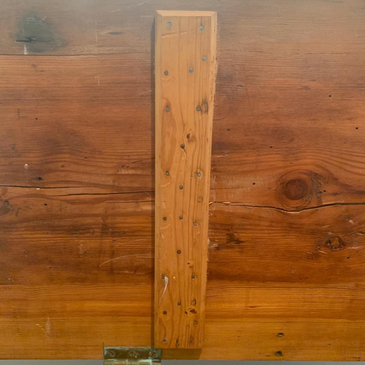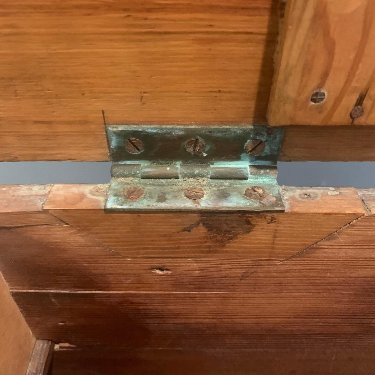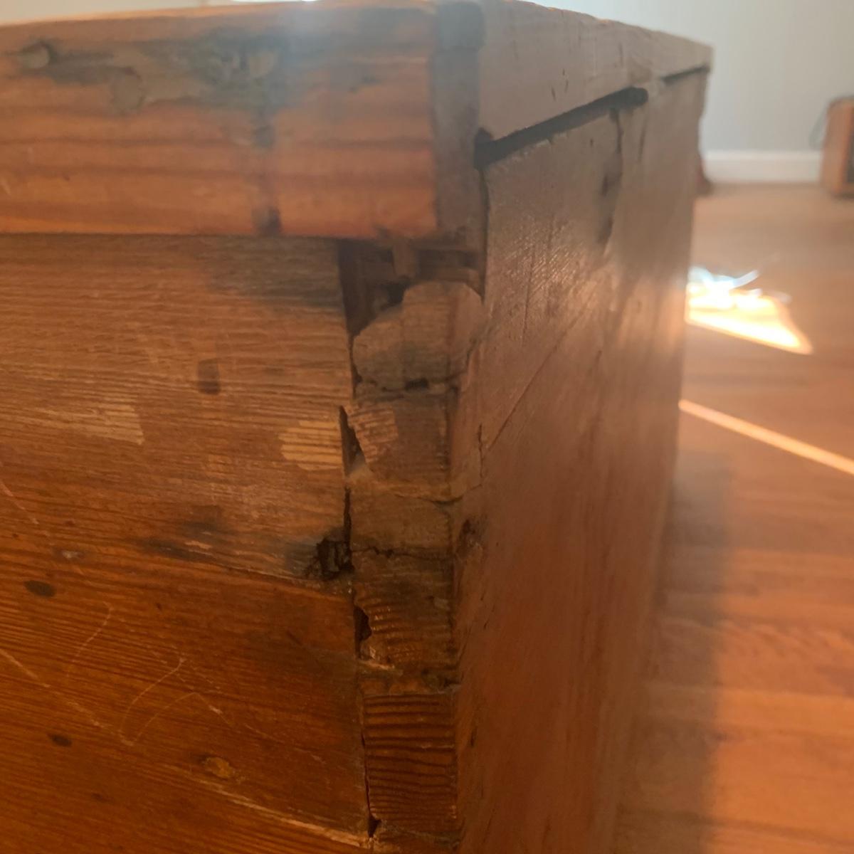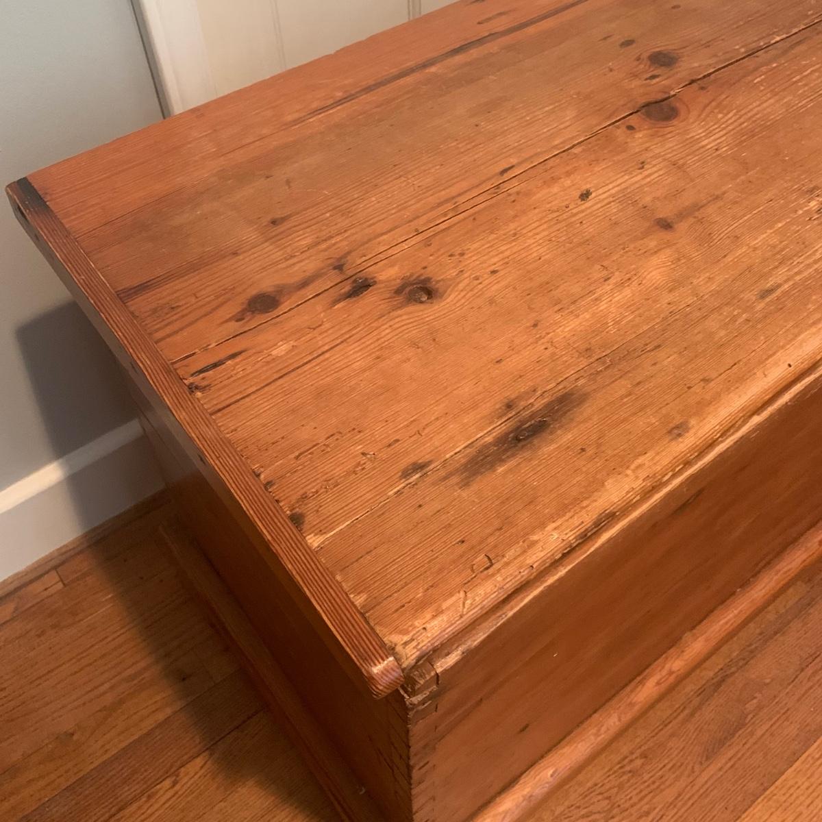Charming antique wooden trunk with hand cut dovetail corners and bracket feet. Hinges are a bit weathered but work very well. This chest opens easily and stays open using a chain. This chest features a small compartment on the left side, which needs a little glue. See photos for more details. Overall good condition. Item measures, 44.5”L x 19.5”W x 22.5”H.