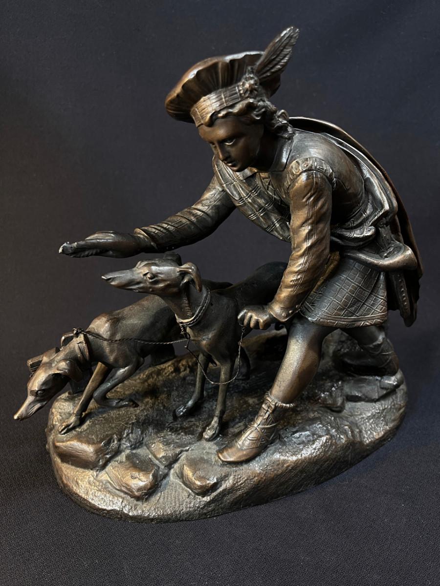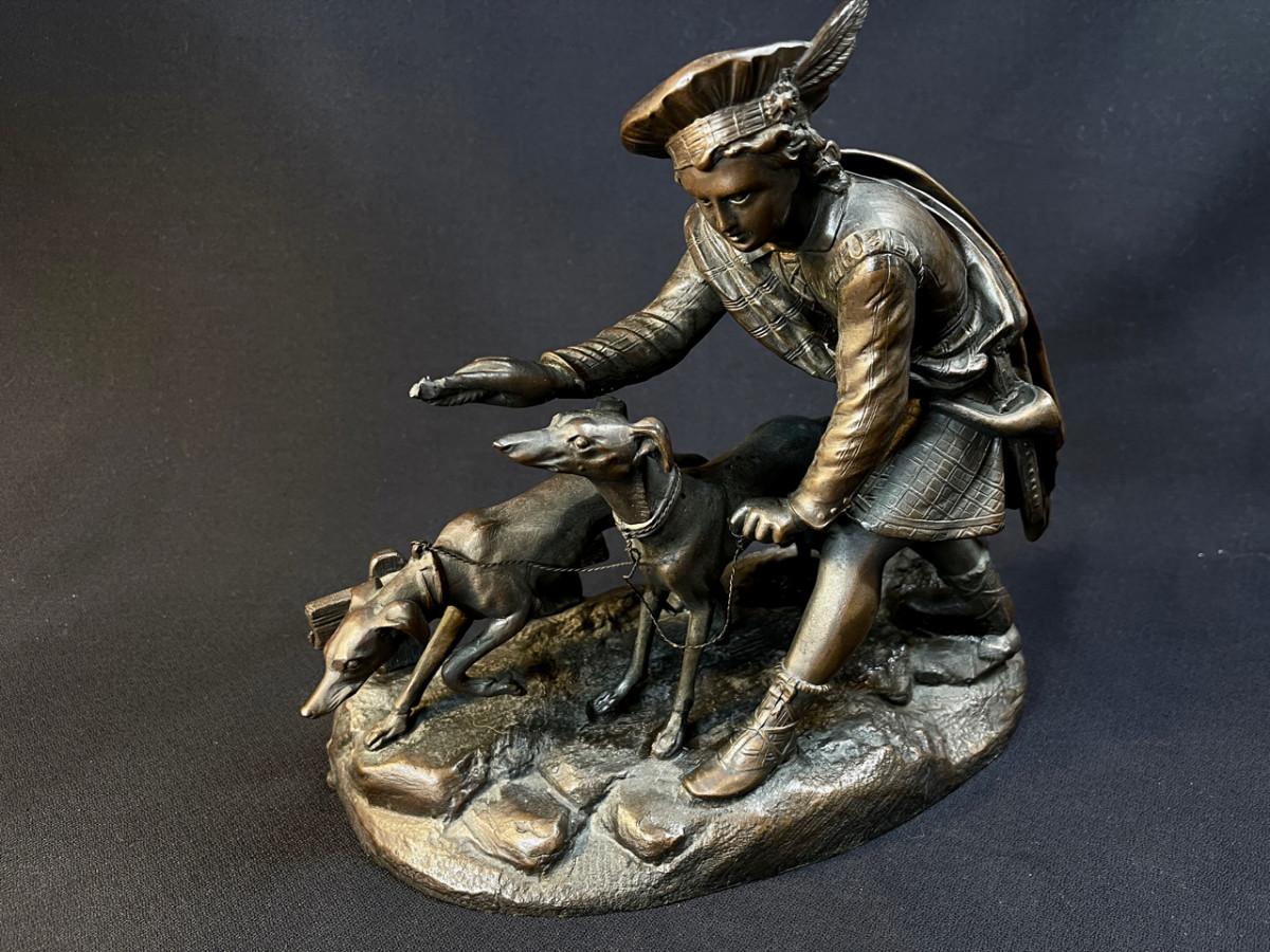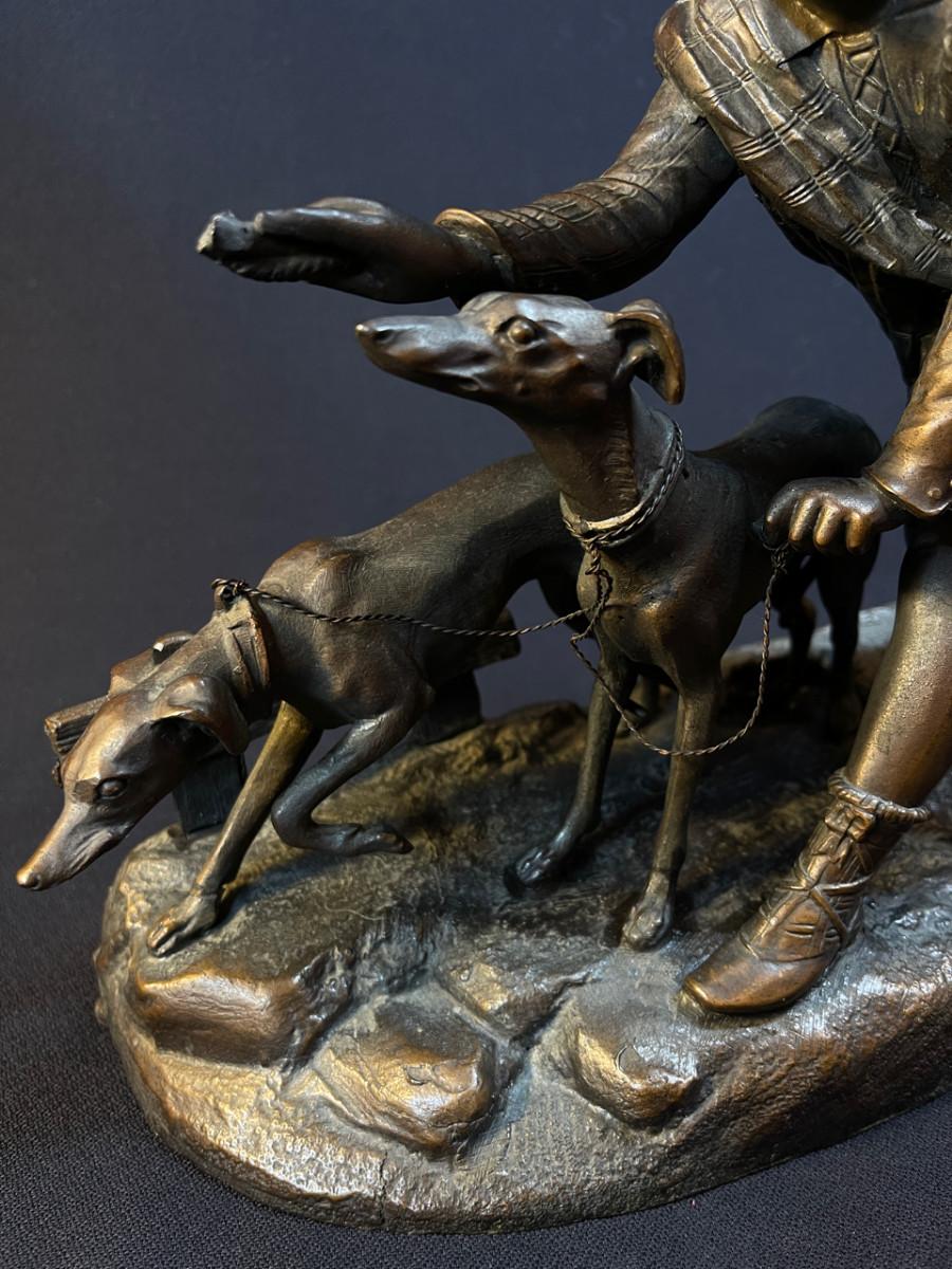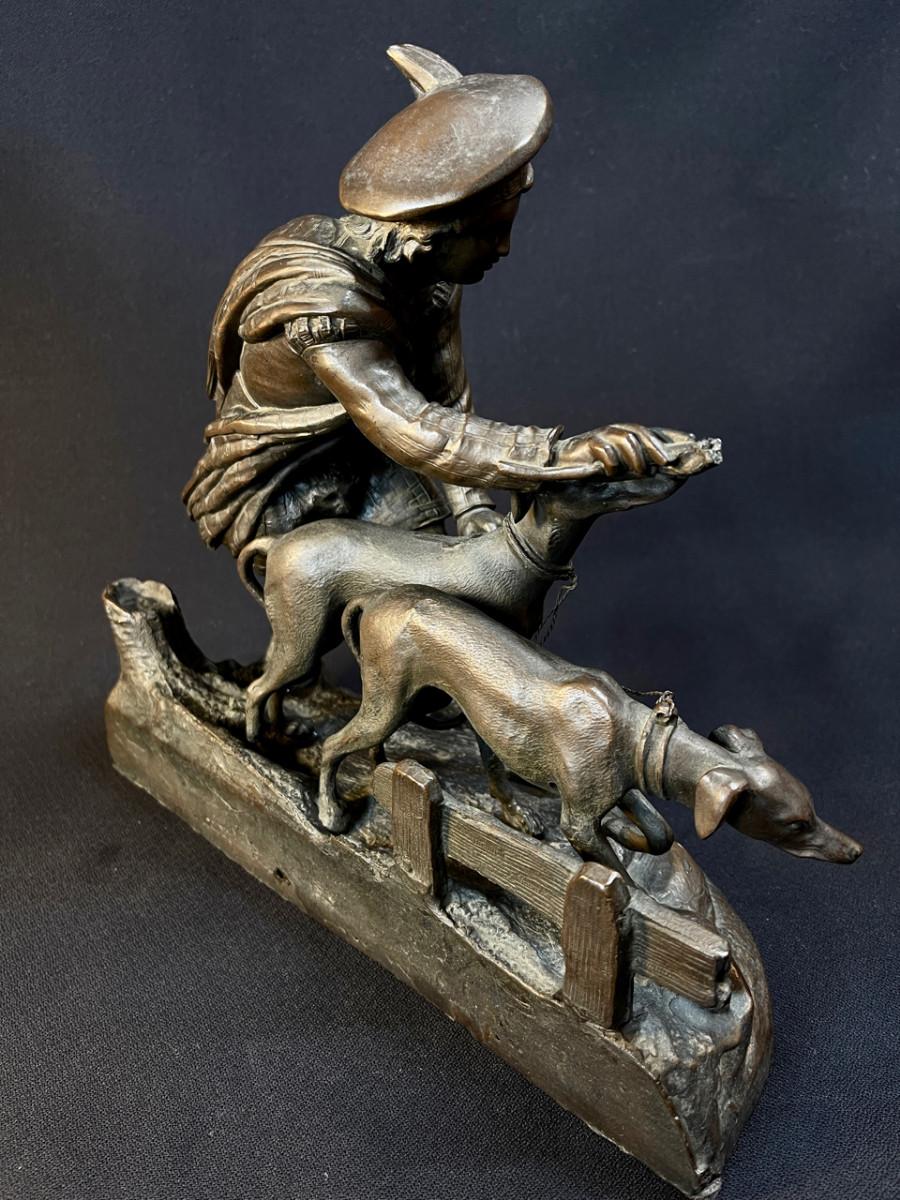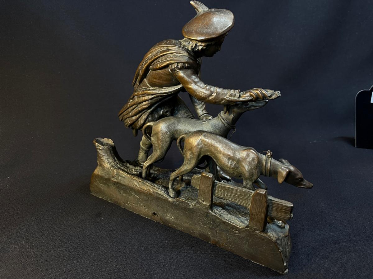 The subject is an antique European style figural bronze of a young man in classic dress coaxing a pair of hounds. Posed on uneven terrain backed with a low boarded fence, the young male figure cuts a dashing, romanticized figure, finished in a mellow, over-all brown/bronze patina. A small part of whatever was in his hand appears to only be partially there.
