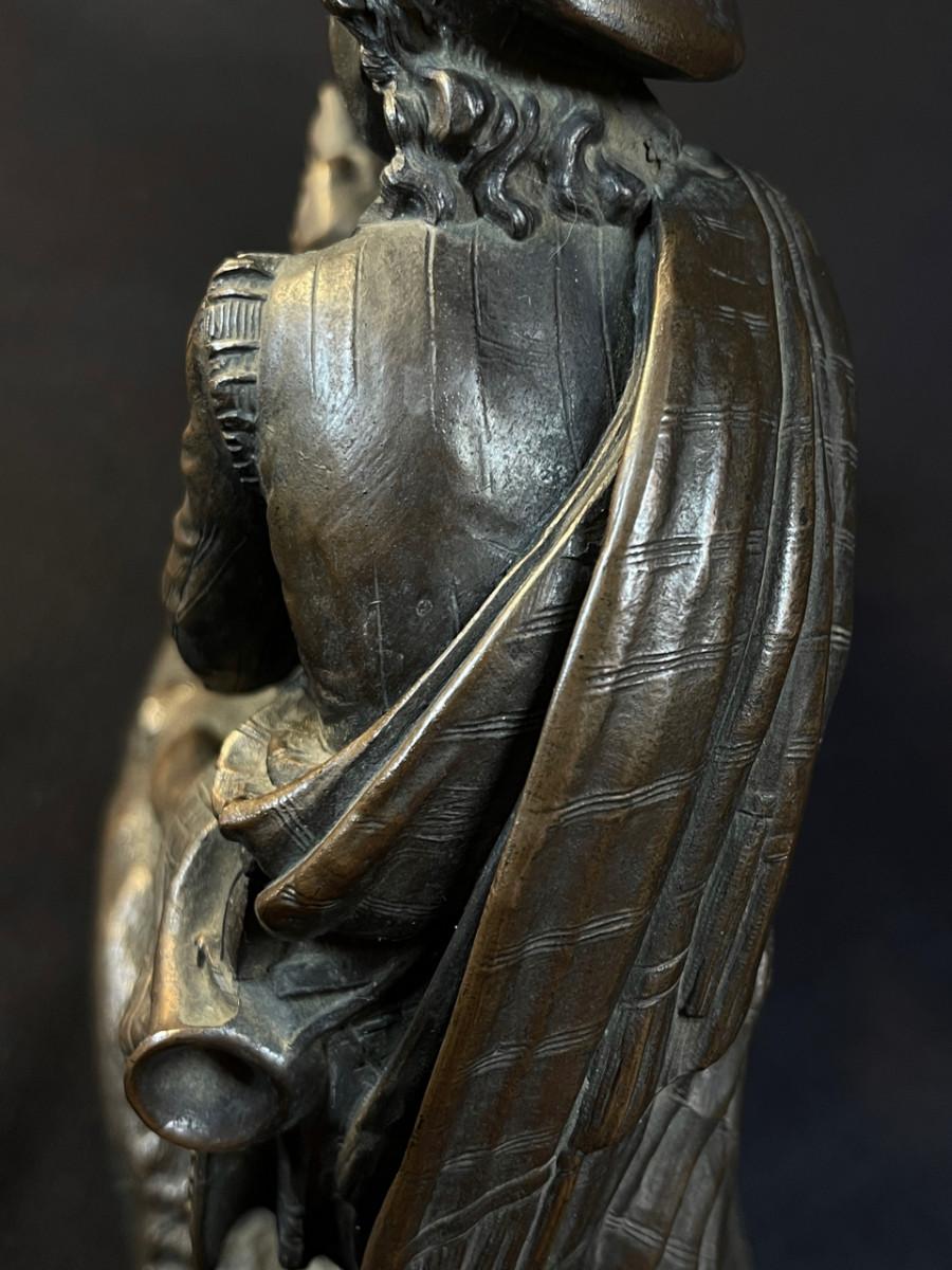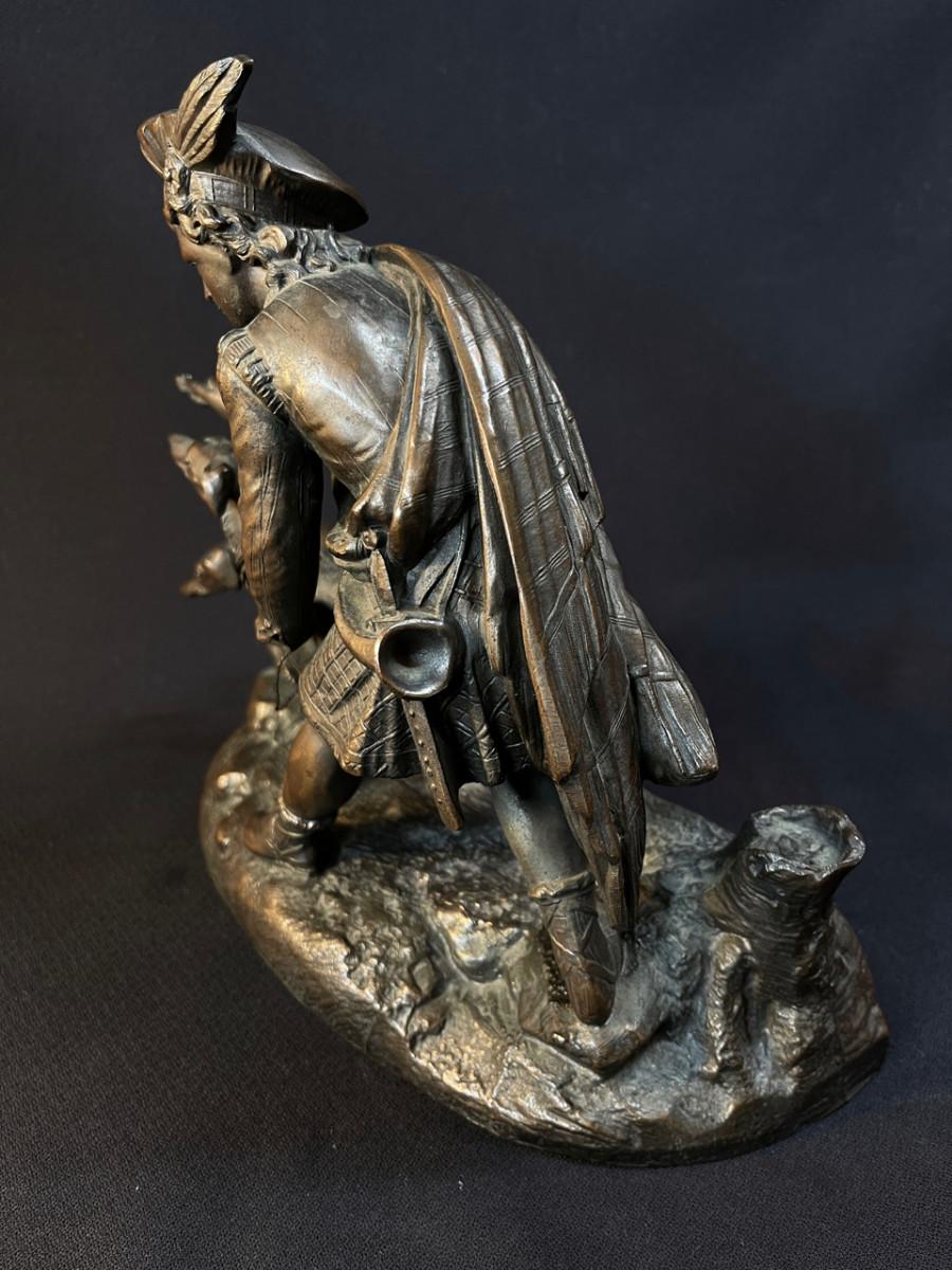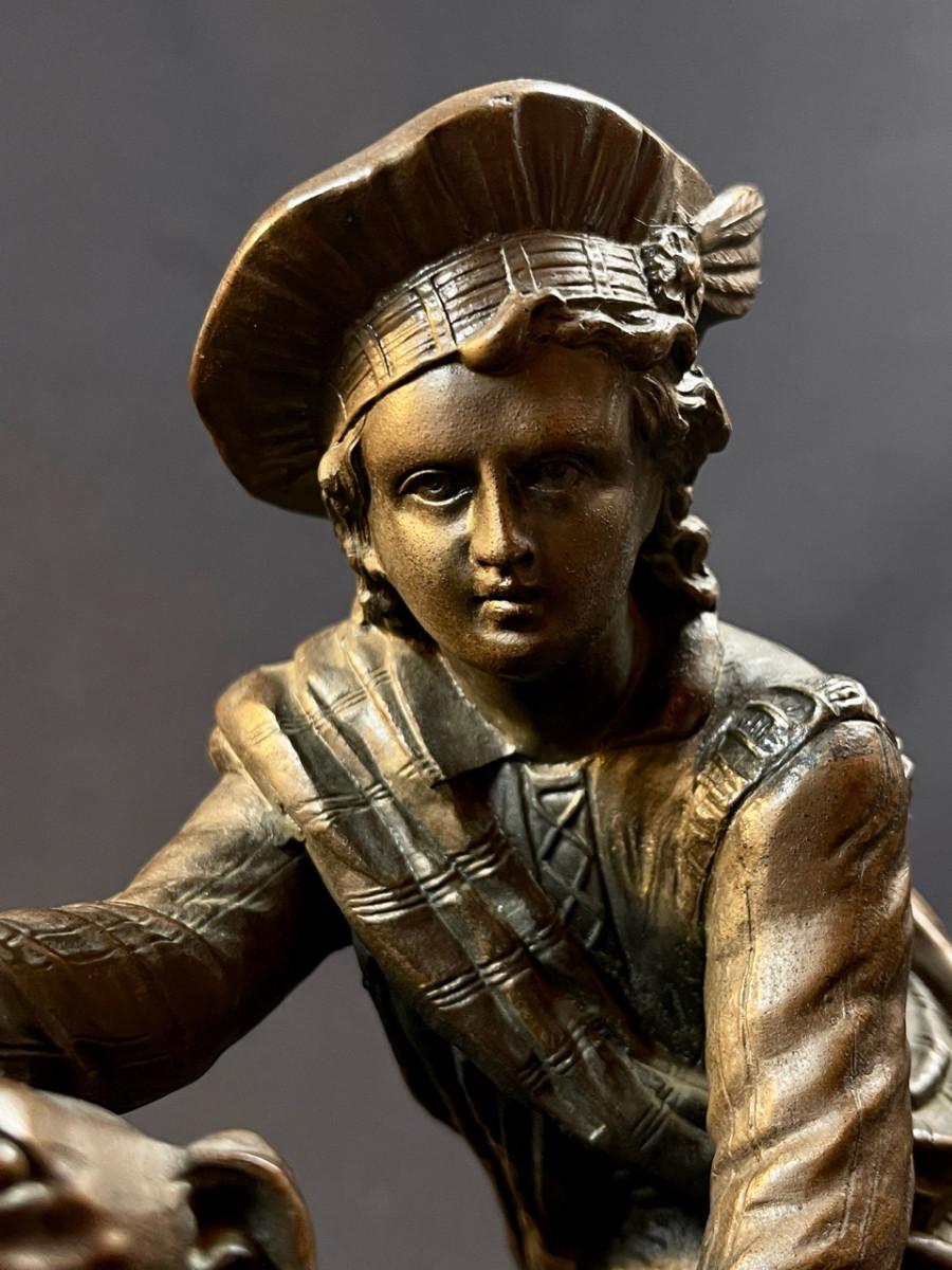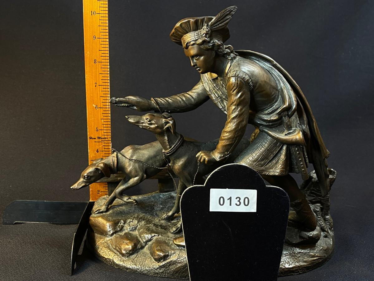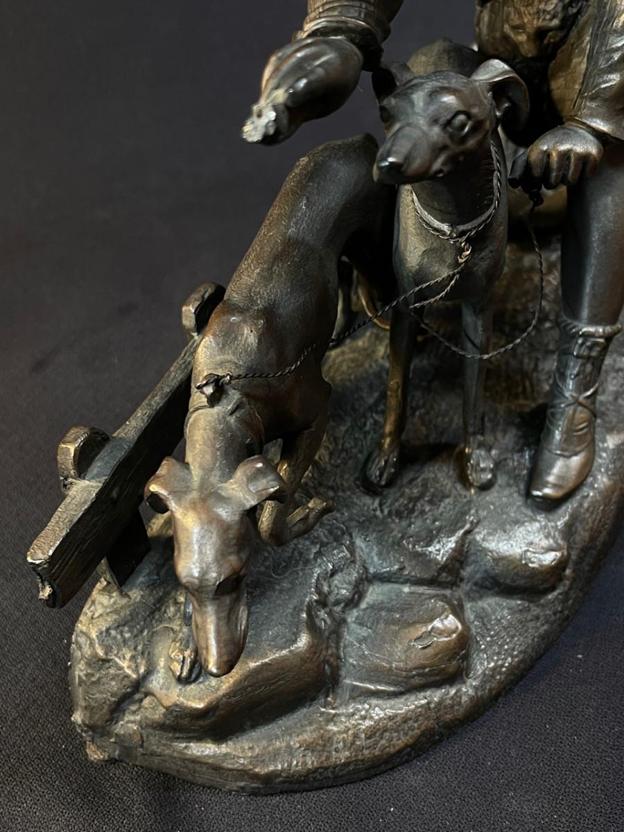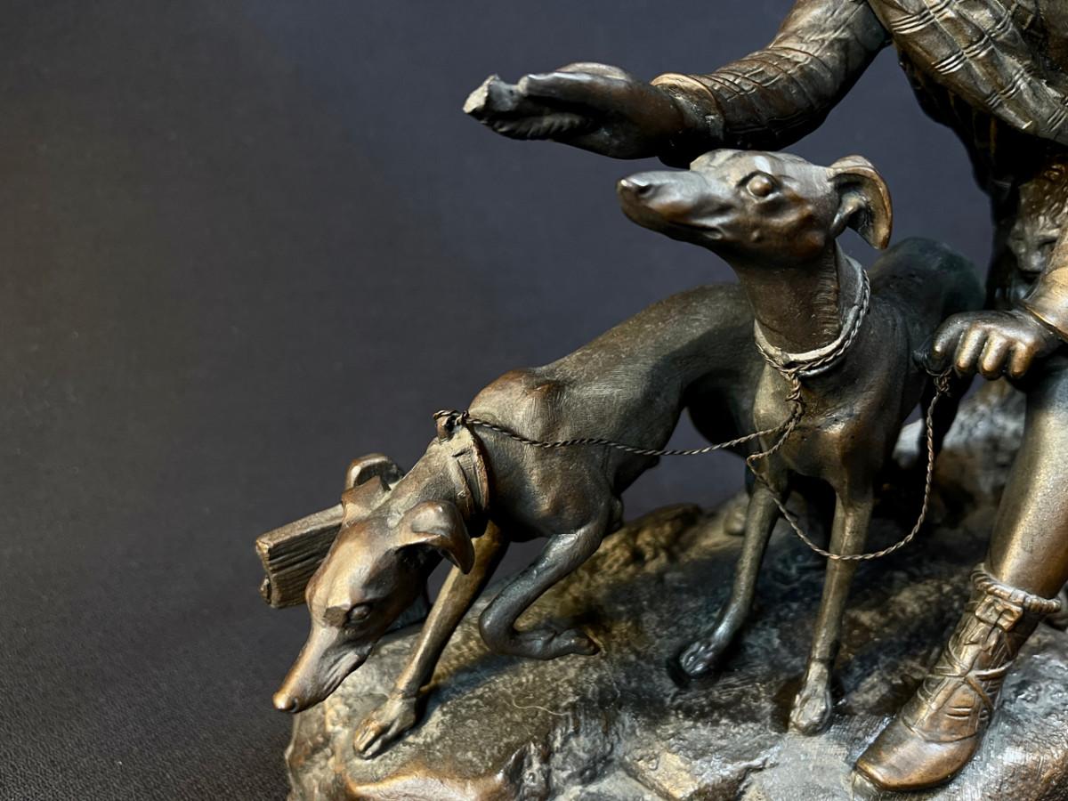 The subject is an antique European style figural bronze of a young man in classic dress coaxing a pair of hounds. Posed on uneven terrain backed with a low boarded fence, the young male figure cuts a dashing, romanticized figure, finished in a mellow, over-all brown/bronze patina. A small part of whatever was in his hand appears to only be partially there.