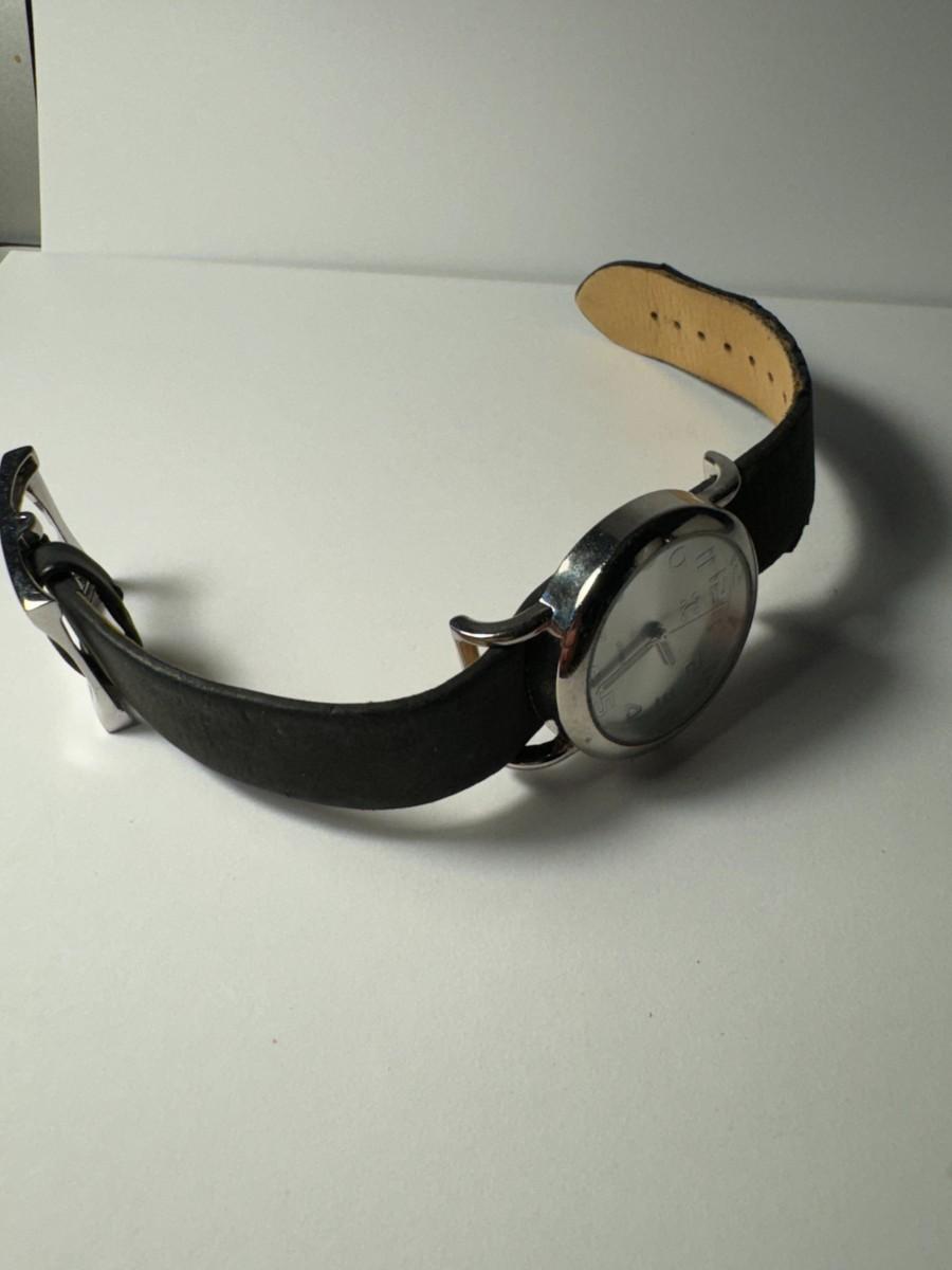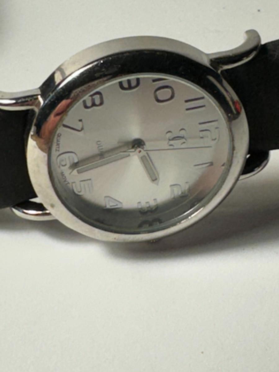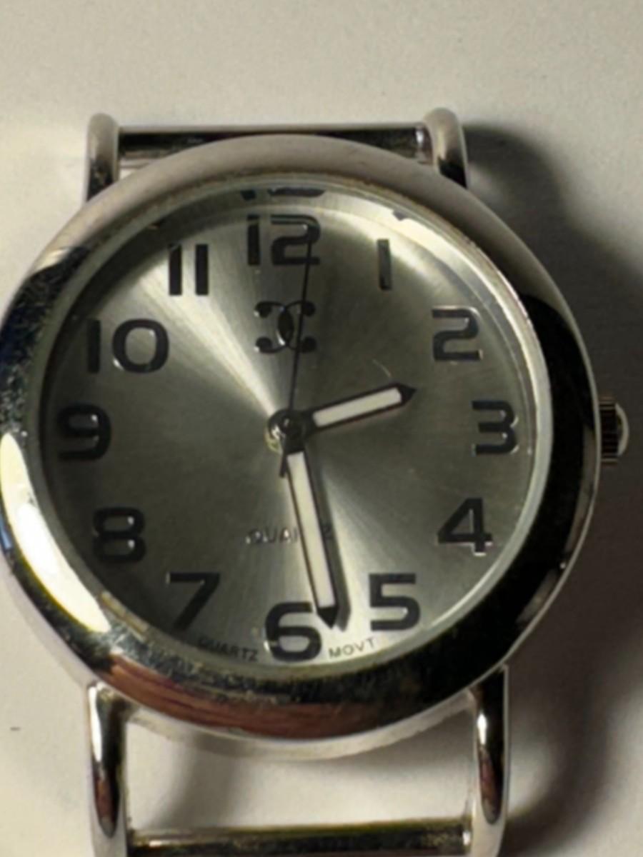 Charming Charlie women's analog wristwatch with a silver-toned case and a silver-colored dial with a sunburst finish. The watch face features black numerals marking the hours, along with a seconds hand and a push/pull crown. It has a quartz movement and displays the time in a 12-hour format.