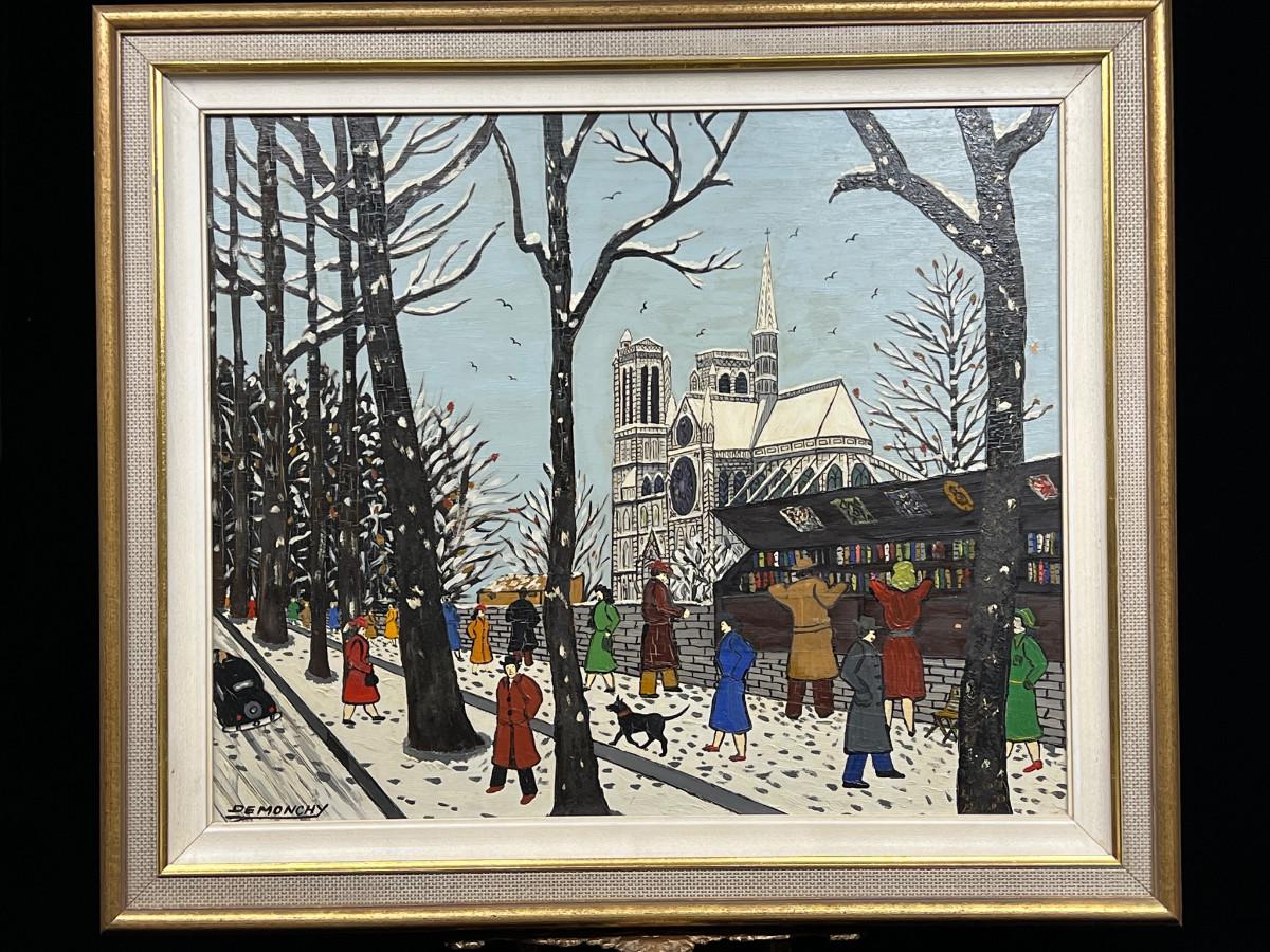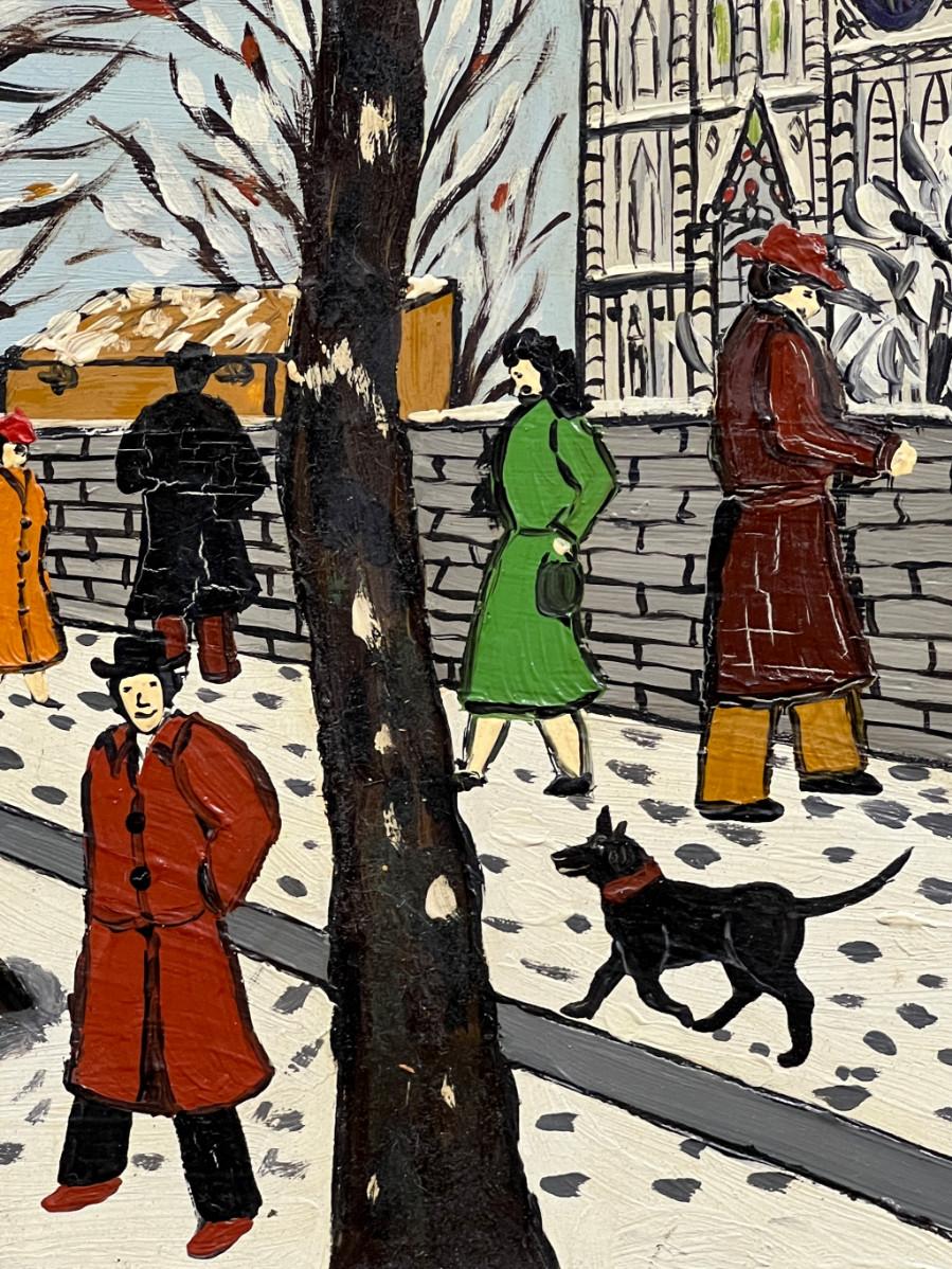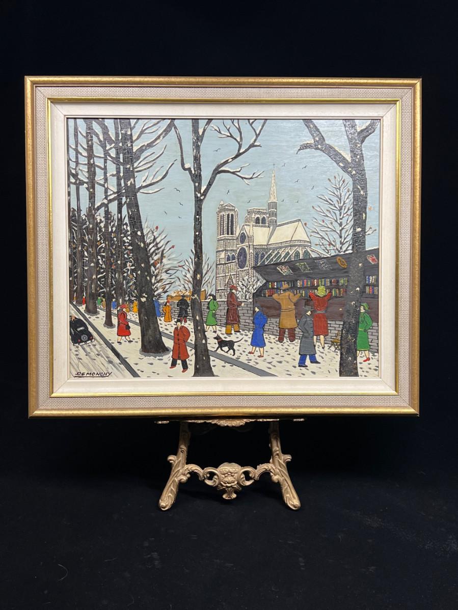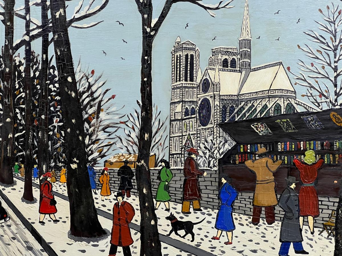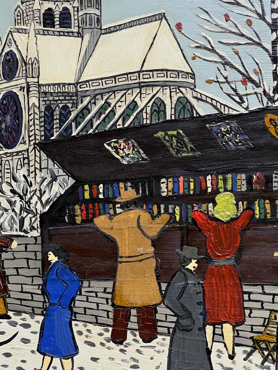 DESCRIPTION: The subject item is a charming, original oil painting on panel signed “De Monchy". The artist has rendered an outsider/folk art-style street scene with a Parisian bookseller set up in a street side stall selling books . People strolling on the street in the snow make up with foreground, with Notre Dame commanding the horizon line.
