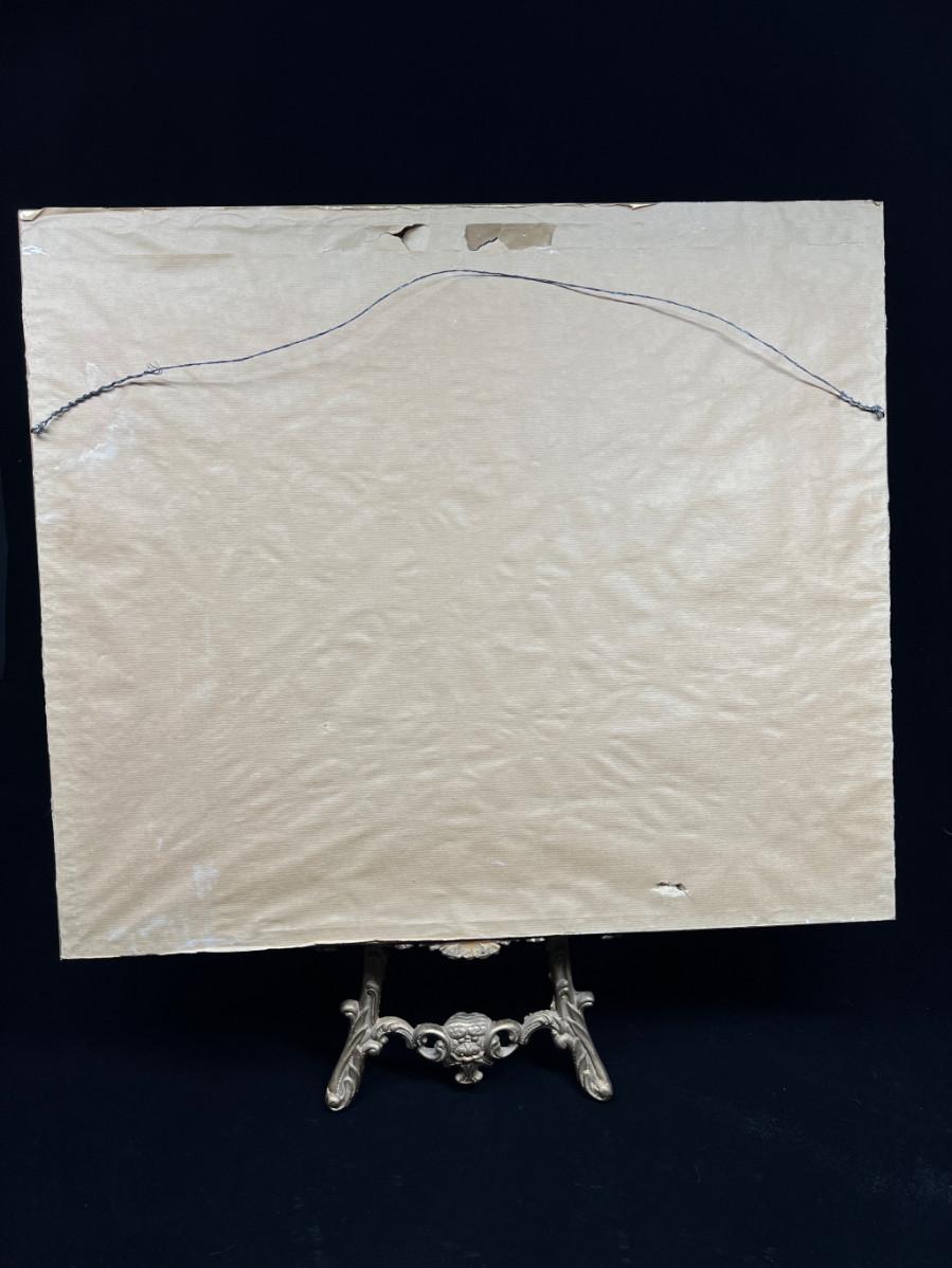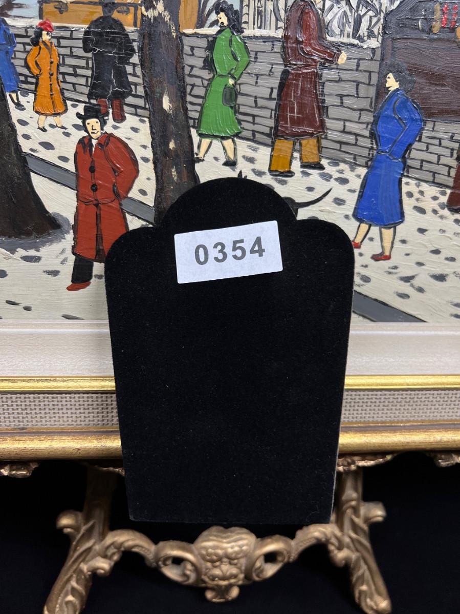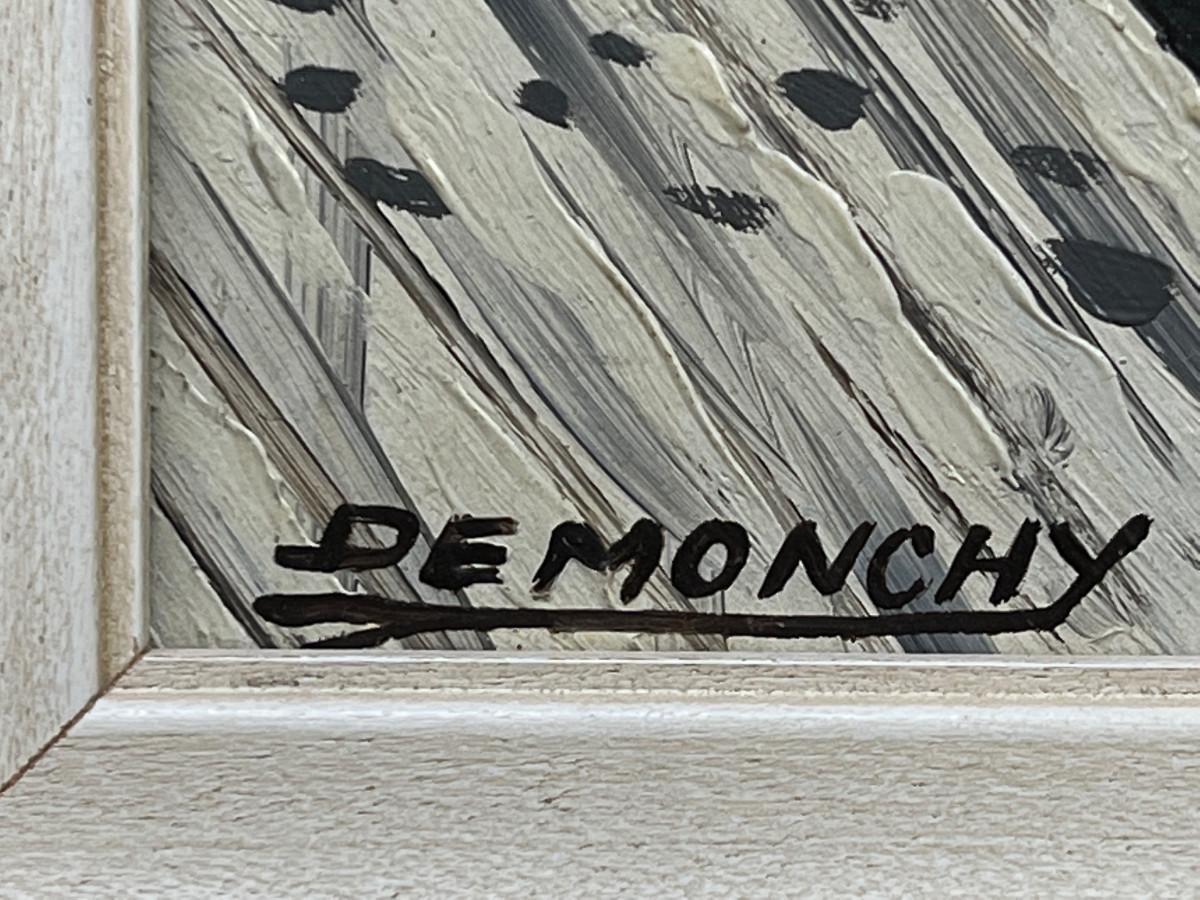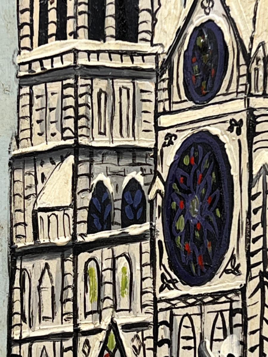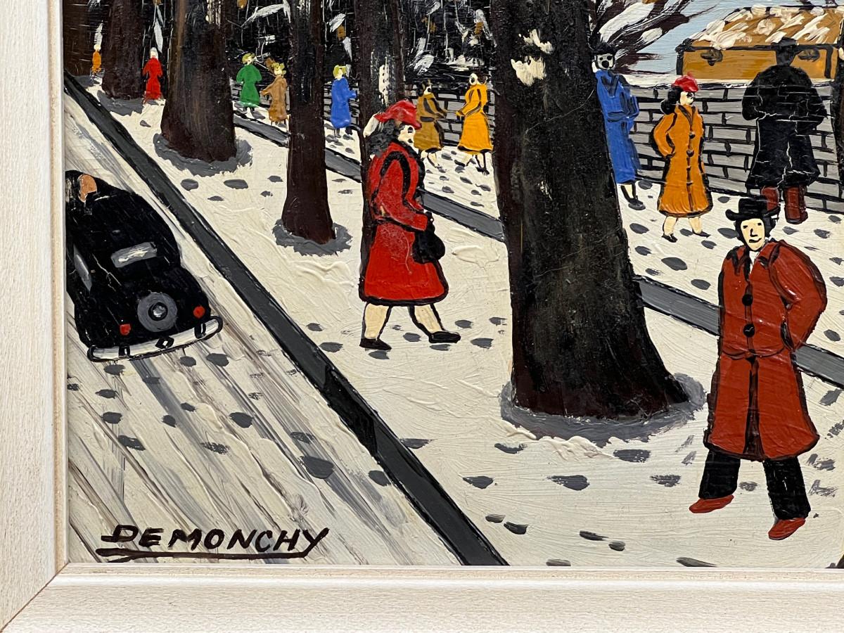 DESCRIPTION: The subject item is a charming, original oil painting on panel signed “De Monchy". The artist has rendered an outsider/folk art-style street scene with a Parisian bookseller set up in a street side stall selling books . People strolling on the street in the snow make up with foreground, with Notre Dame commanding the horizon line.