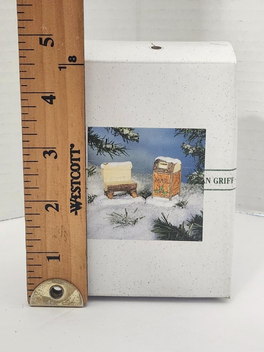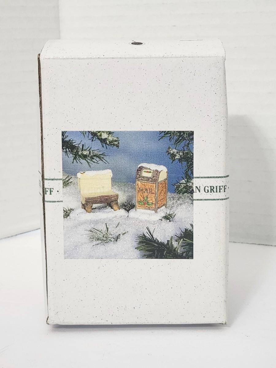 Charming Tails accessory set featuring a miniature mailbox and bench, designed to complement Charming Tails holiday figurines and winter village scenes. Produced by Fitz and Floyd, these detailed resin accessories add depth and storytelling to Christmas displays, shelves, or seasonal vignettes. Comes with the original box showing the accessory scene. Perfect companion pieces for Charming Tails collectors or festive holiday decor. Not too early to shop for Christmas at these prices.
