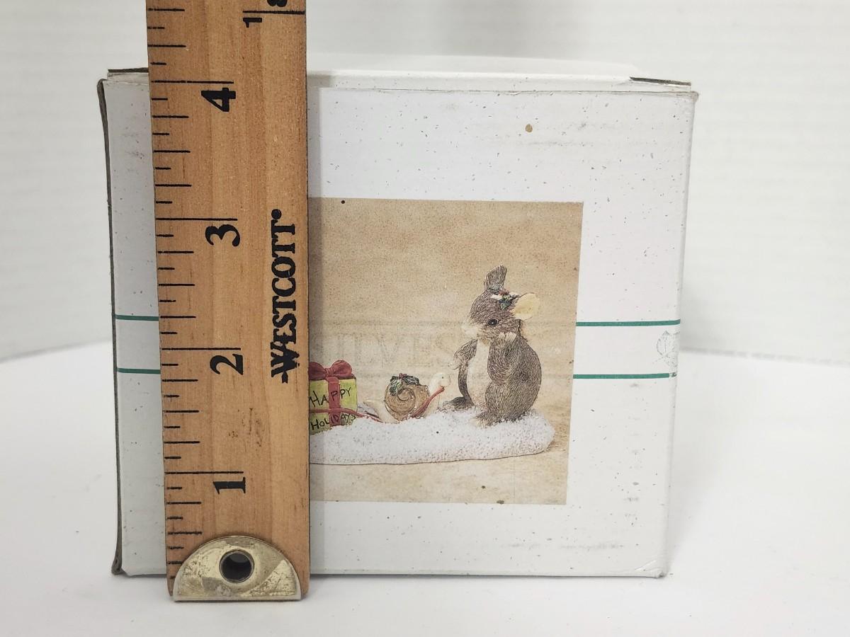 Whimsical Charming Tails figurine titled Waiting for Xmas, featuring a sweet mouse scene with a wrapped holiday gift and winter accents. Part of the popular Charming Tails collection produced by Fitz and Floyd, known for their detailed storytelling holiday designs. Comes with the original illustrated box showing the same scene. A charming seasonal display piece for Christmas decor or for collectors of Charming Tails figures. Not too early to shop for Christmas at these prices.