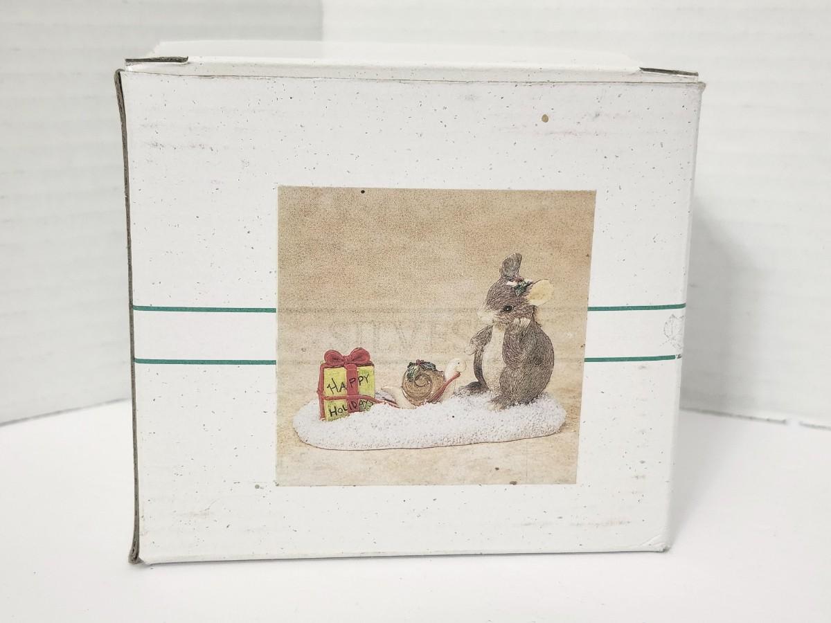 Whimsical Charming Tails figurine titled Waiting for Xmas, featuring a sweet mouse scene with a wrapped holiday gift and winter accents. Part of the popular Charming Tails collection produced by Fitz and Floyd, known for their detailed storytelling holiday designs. Comes with the original illustrated box showing the same scene. A charming seasonal display piece for Christmas decor or for collectors of Charming Tails figures. Not too early to shop for Christmas at these prices.
