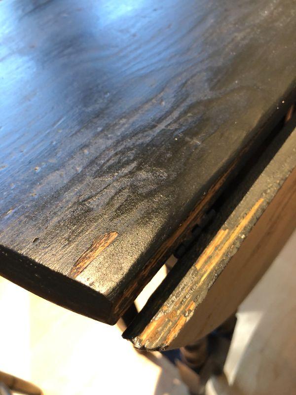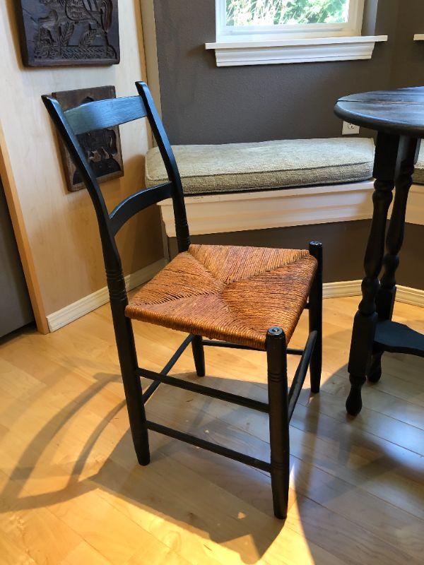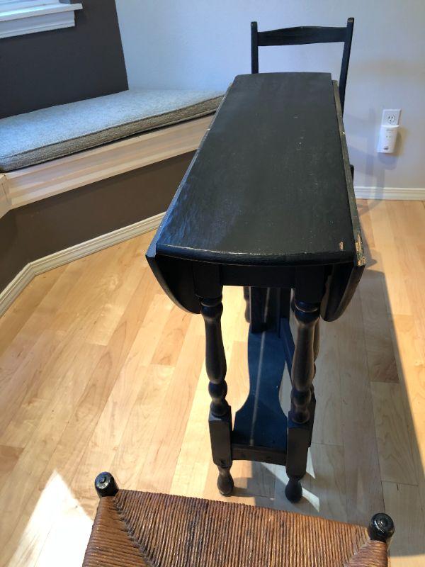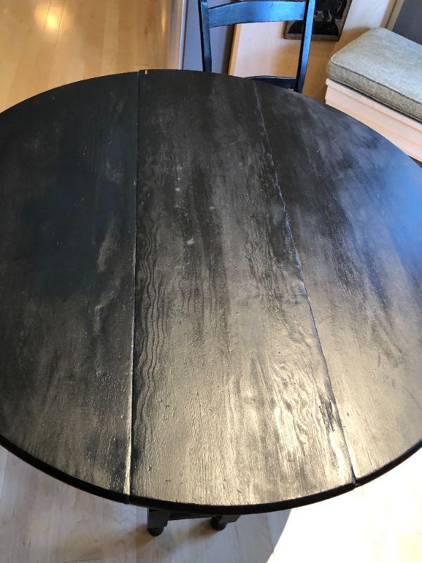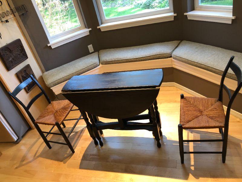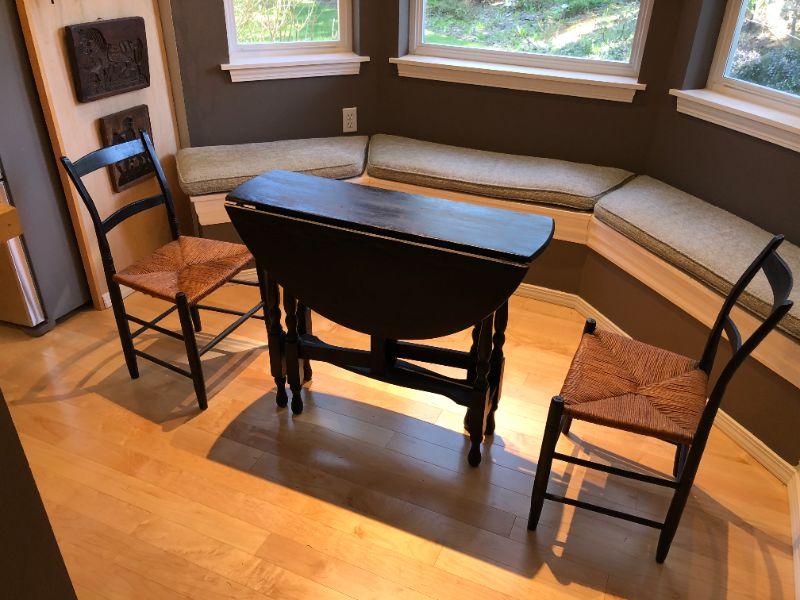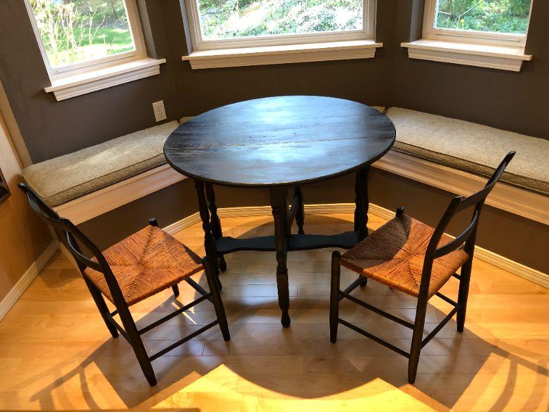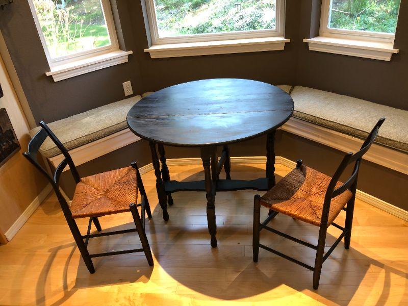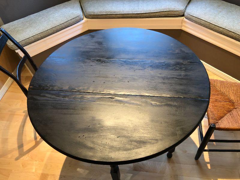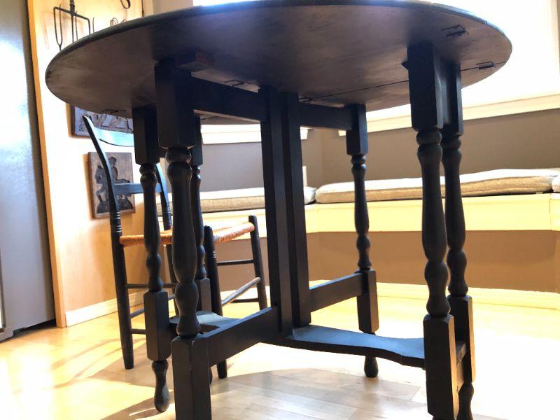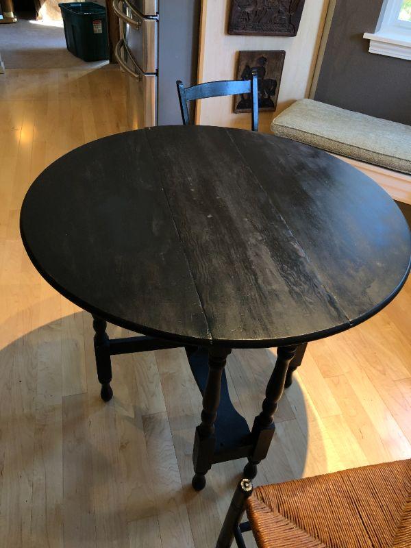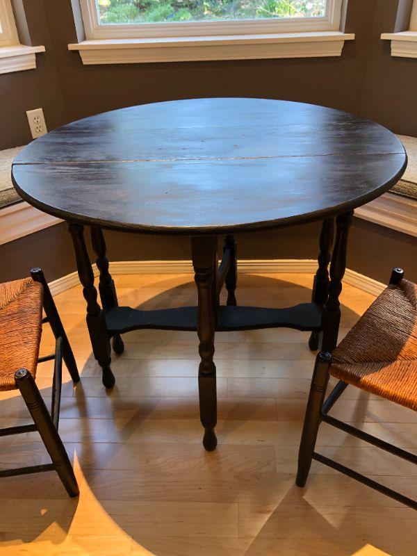 Charming 36 inch round table, with two collapsing leaves that fold down. Two small wicker chairs. Dark wood stain. In very good condition.