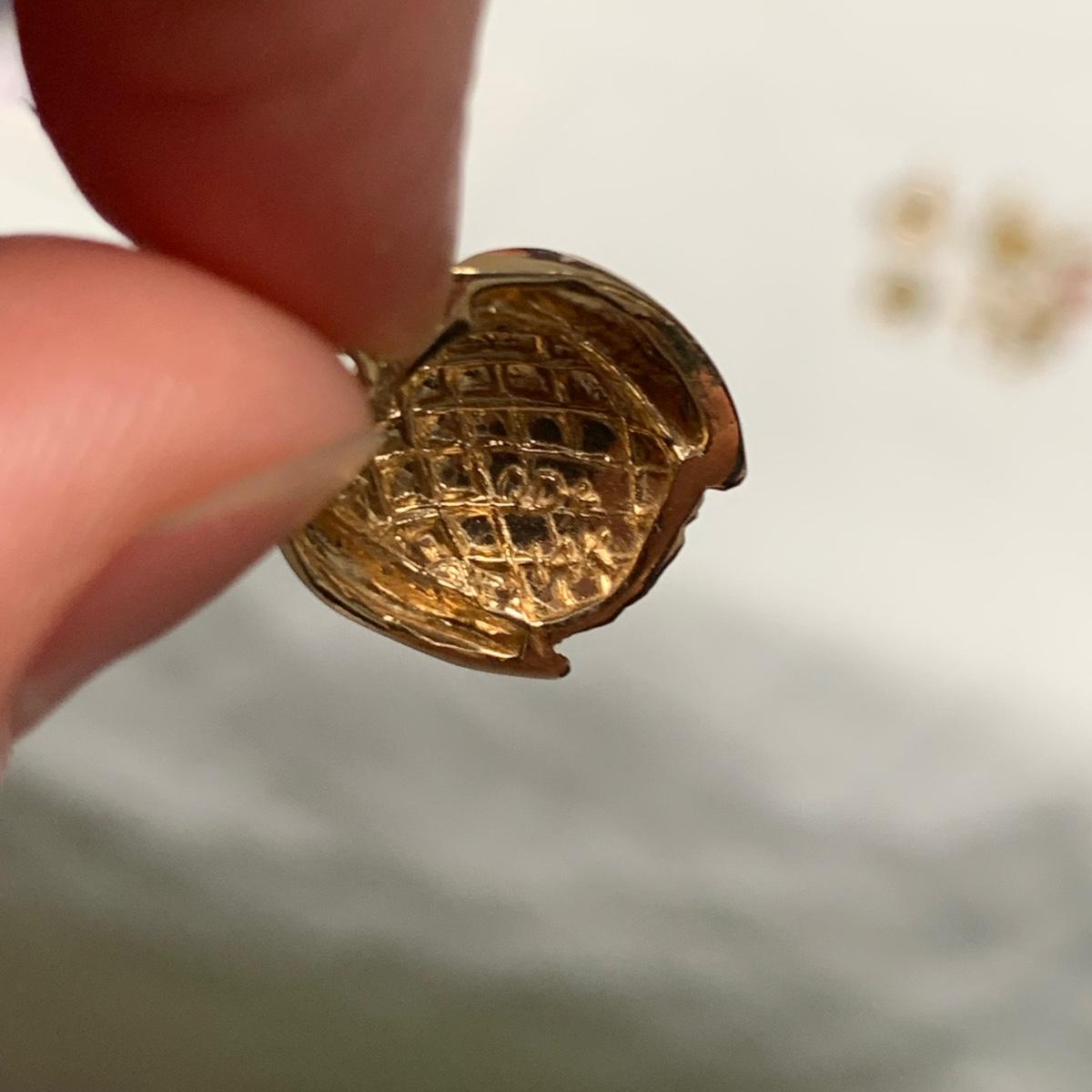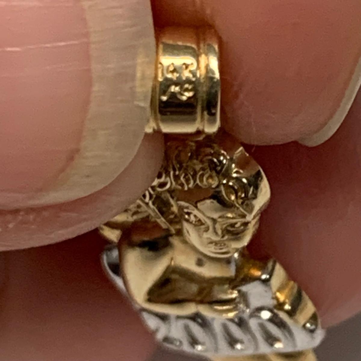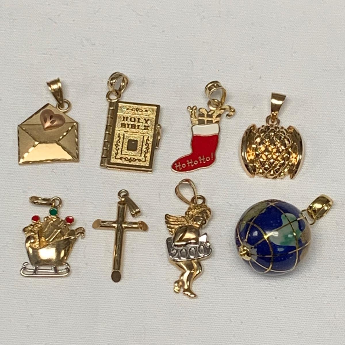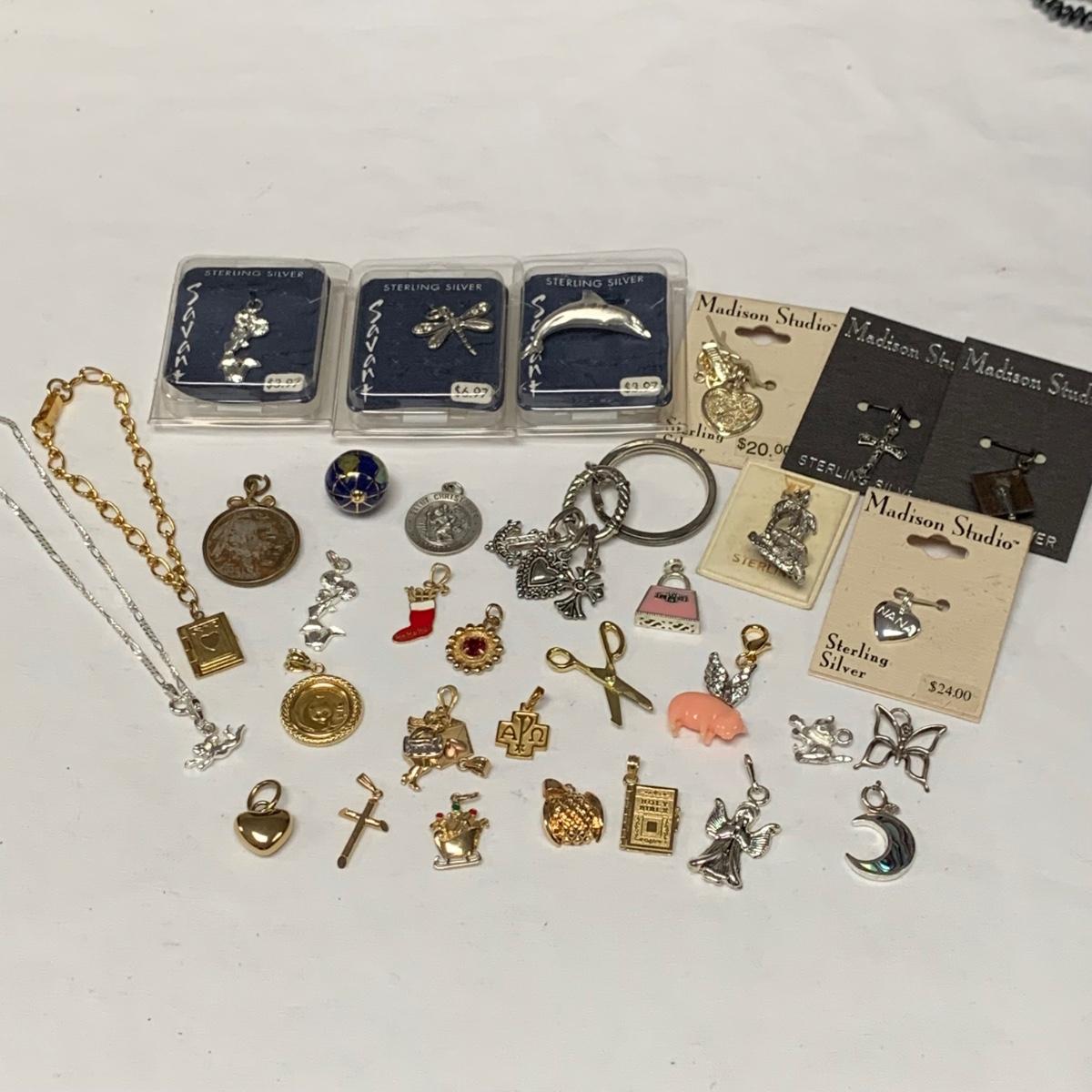 30 loose charms, two bracelets with a single charm attached, and a key ring with three charms. For reference, the Buffalo nickel charm is an inch in diameter. Charm with the panda coin is marked “˜18K’. Eight charms are marked “˜14K’ and all appear in a photograph together. These include the globe, Holy Bible, 2000 Cupid, and others; please see photos. One charms is marked “˜10K’. All the charms in packaging are marked “˜Sterling’, as are six loose charms and the silver bracelet with charm. No markings found on the other items (all photographed together).