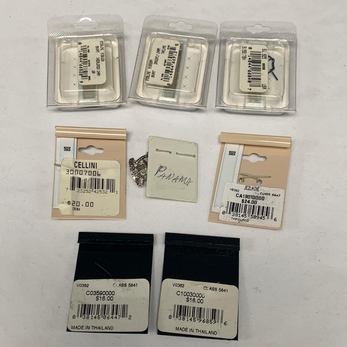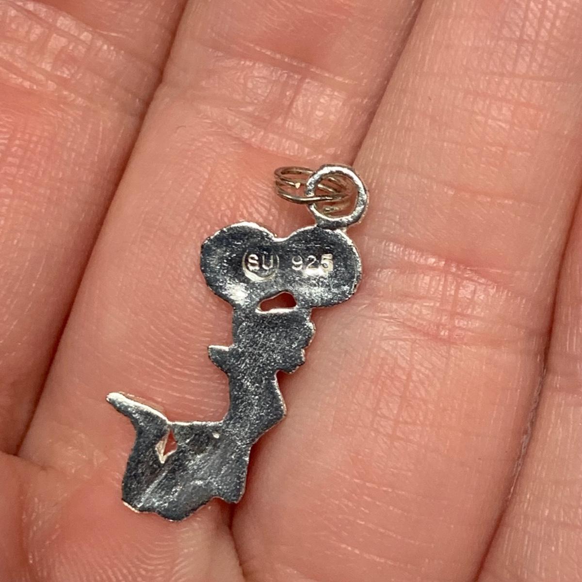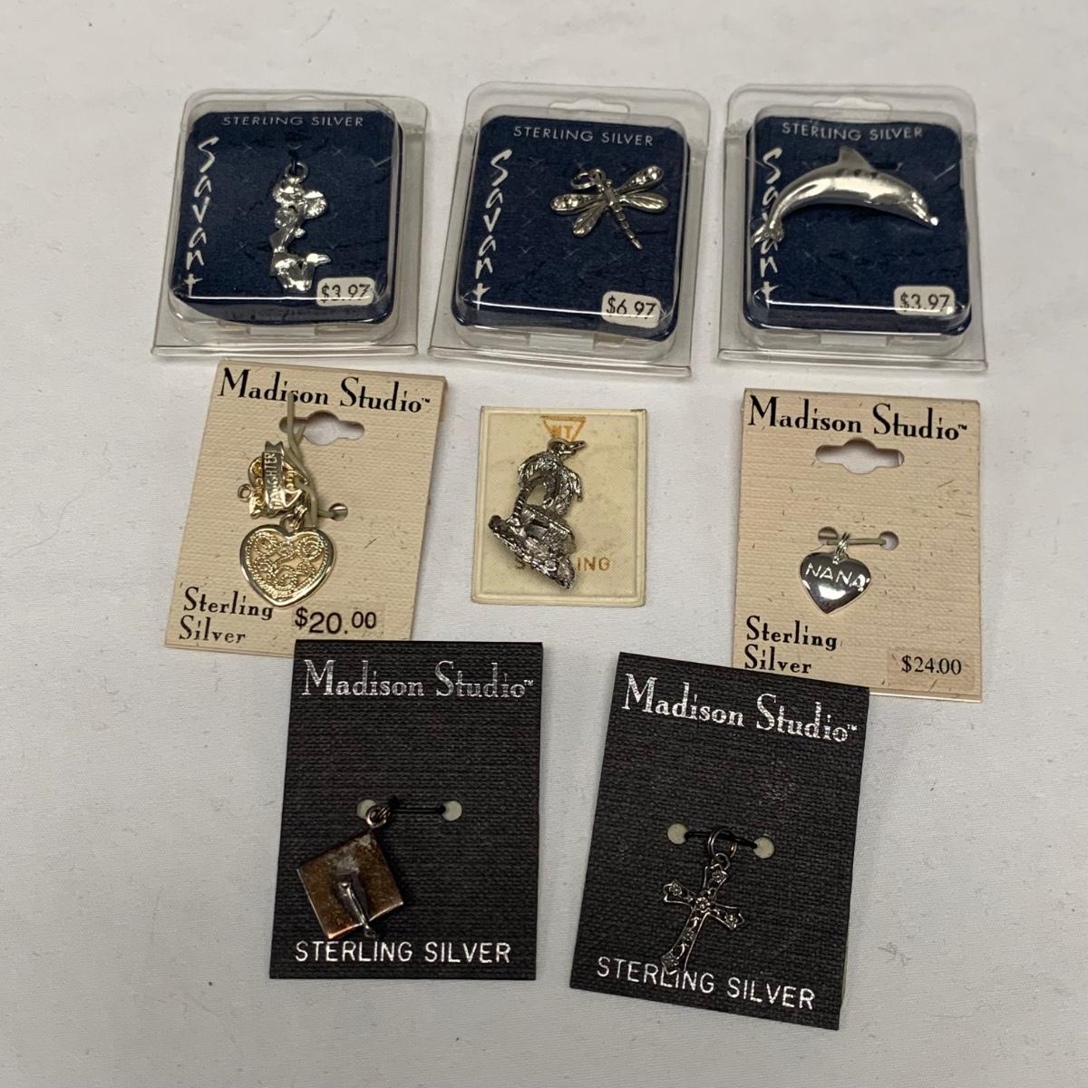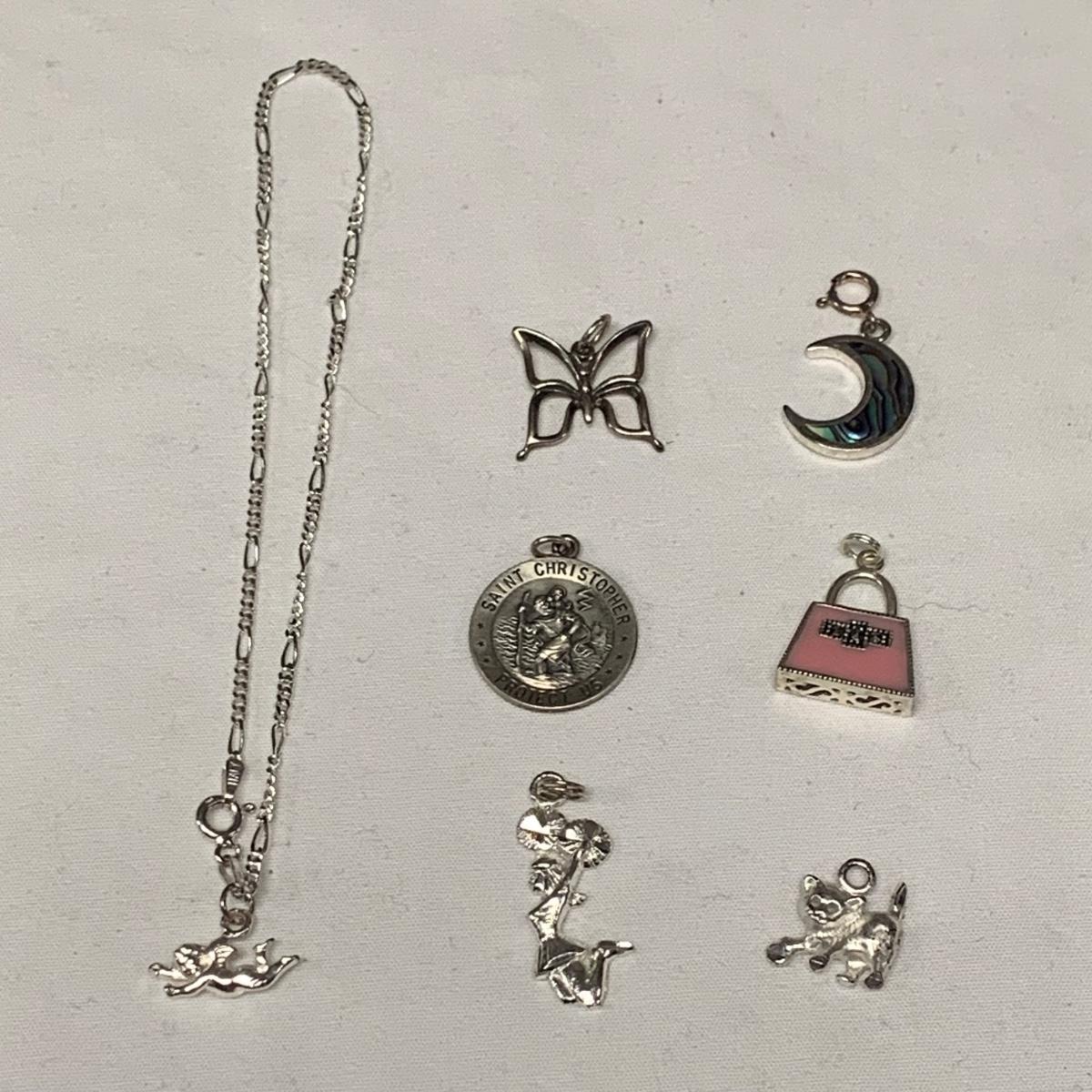30 loose charms, two bracelets with a single charm attached, and a key ring with three charms. For reference, the Buffalo nickel charm is an inch in diameter. Charm with the panda coin is marked “˜18K’. Eight charms are marked “˜14K’ and all appear in a photograph together. These include the globe, Holy Bible, 2000 Cupid, and others; please see photos. One charms is marked “˜10K’. All the charms in packaging are marked “˜Sterling’, as are six loose charms and the silver bracelet with charm. No markings found on the other items (all photographed together).