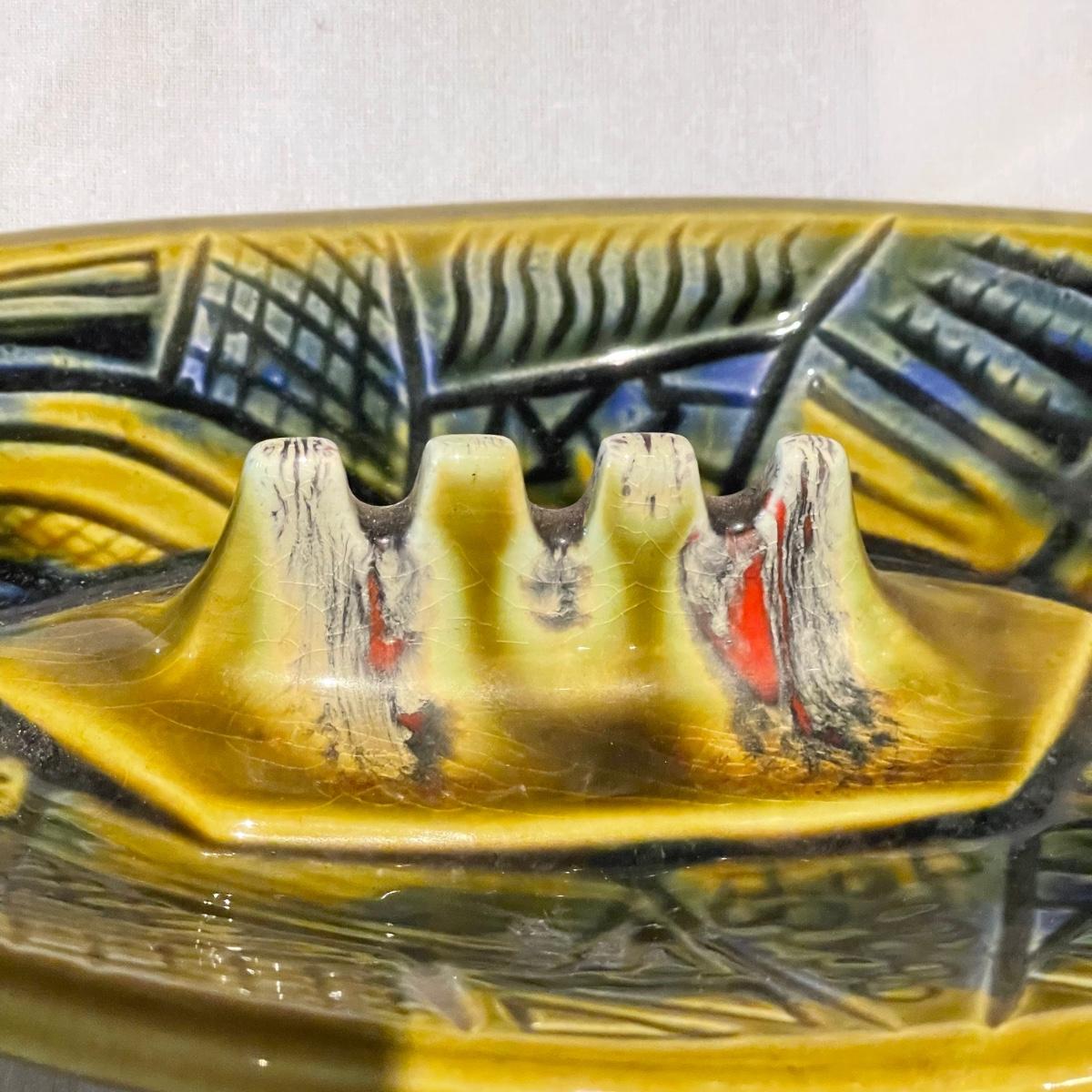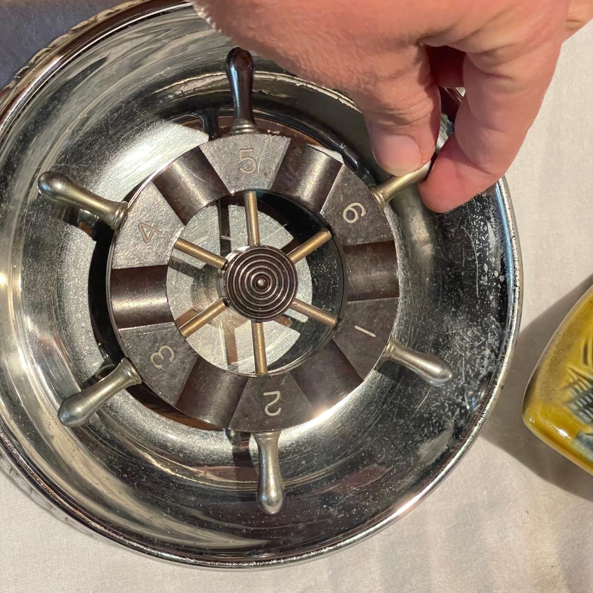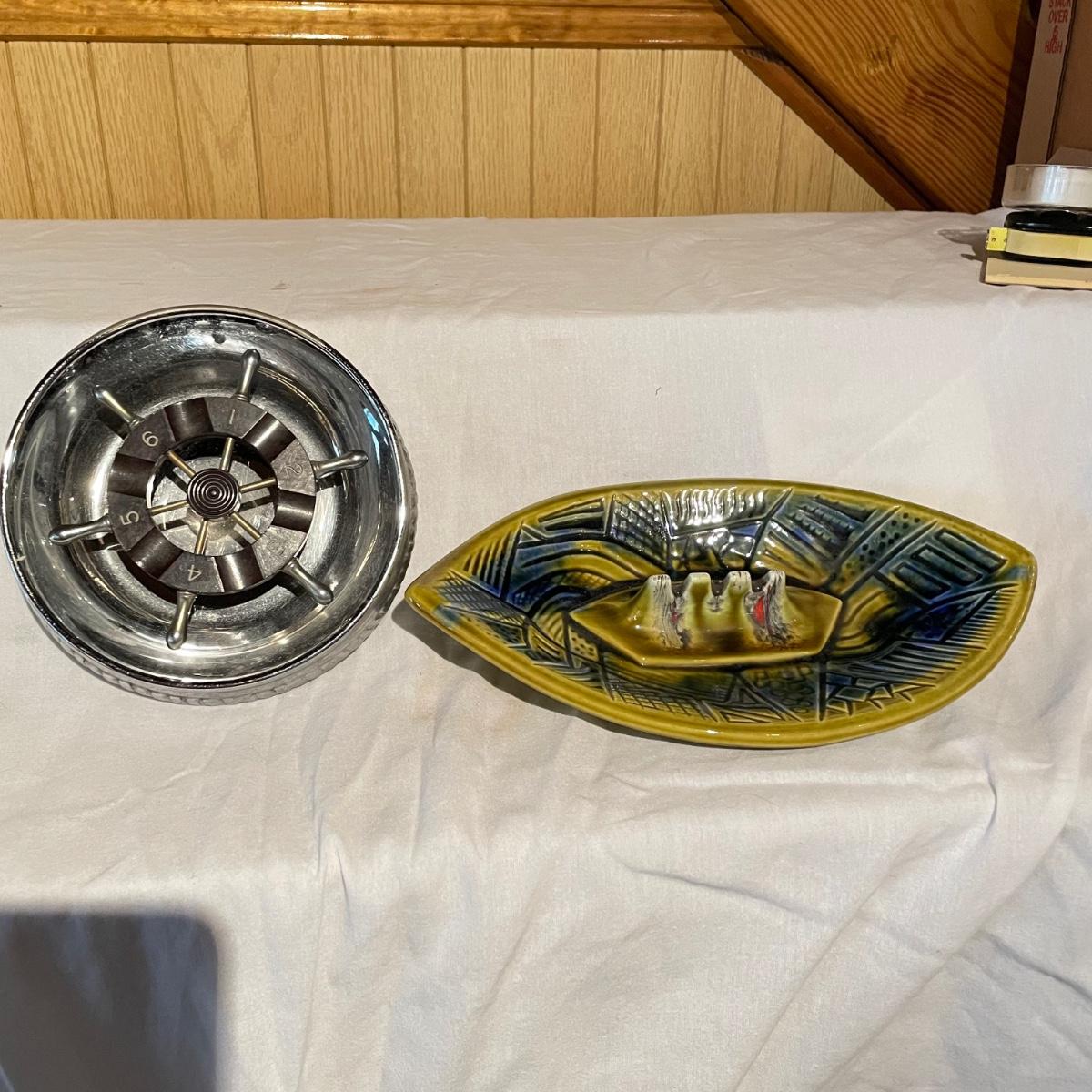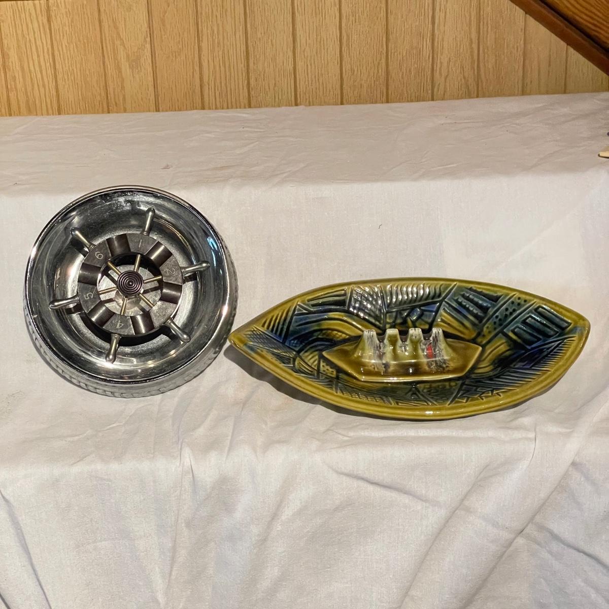 Two unique ashtrays. A silver metal ashtray with a ship’s wheel that spins in the center measuring 6.25”d. Lot also includes a pottery ashtray with melting glaze and vintage colors. This piece is 10.5” x 5.5”. See images. Shipping available.