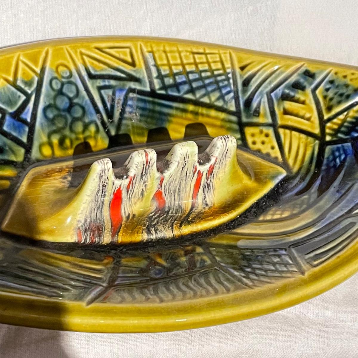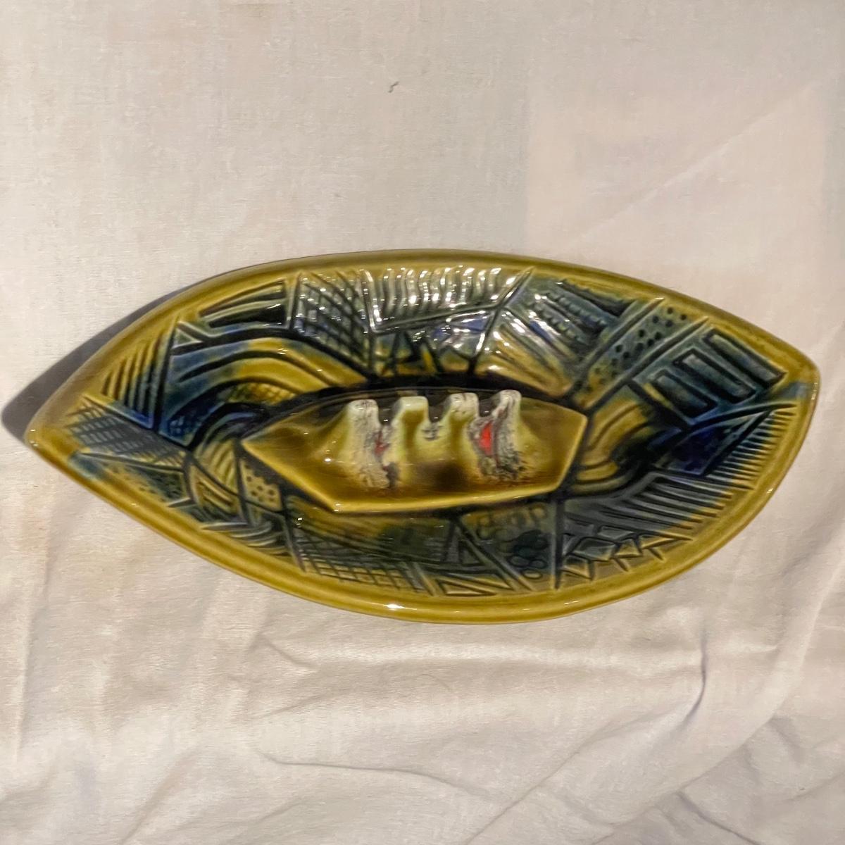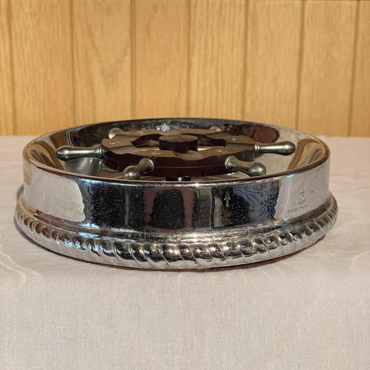 Two unique ashtrays. A silver metal ashtray with a ship’s wheel that spins in the center measuring 6.25”d. Lot also includes a pottery ashtray with melting glaze and vintage colors. This piece is 10.5” x 5.5”. See images. Shipping available.