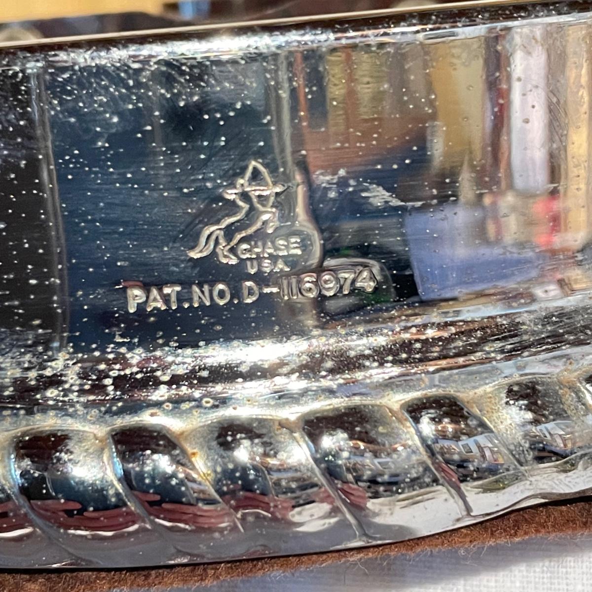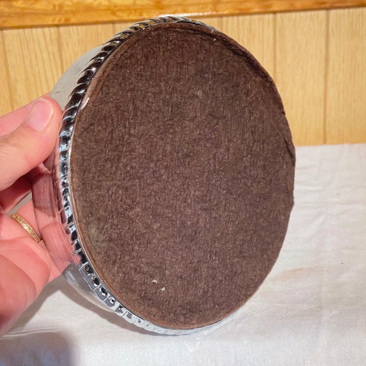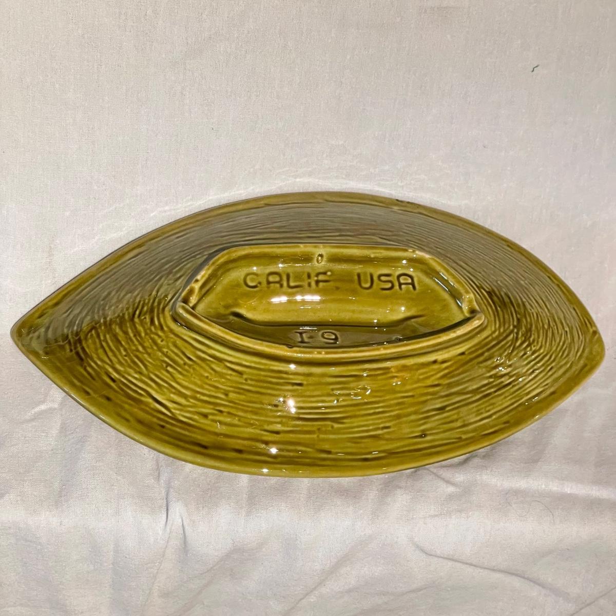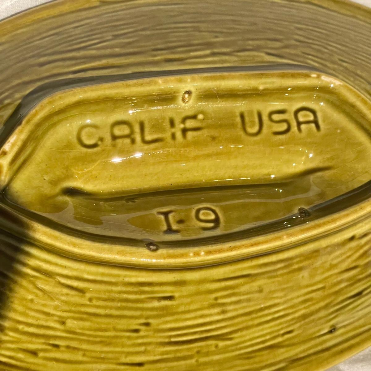Two unique ashtrays. A silver metal ashtray with a ship’s wheel that spins in the center measuring 6.25”d. Lot also includes a pottery ashtray with melting glaze and vintage colors. This piece is 10.5” x 5.5”. See images. Shipping available.