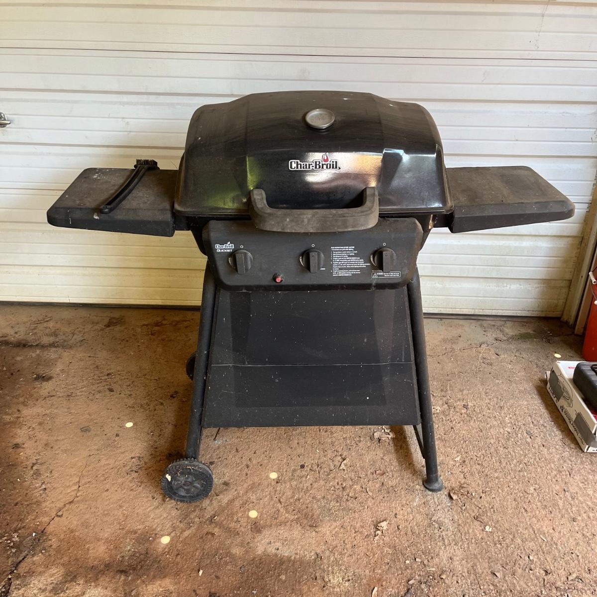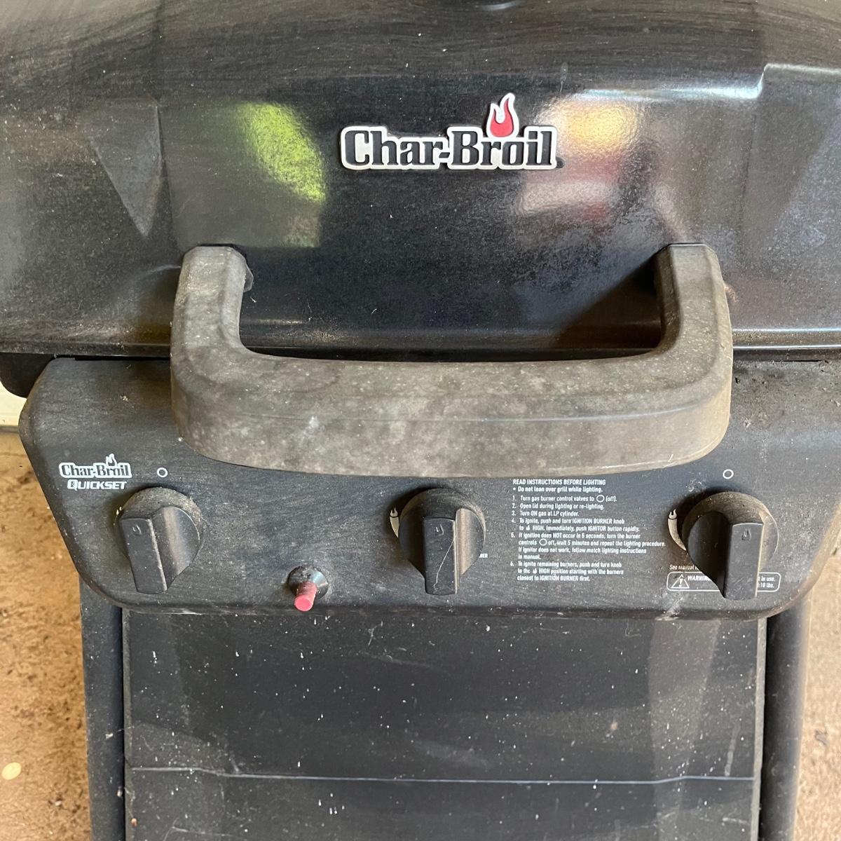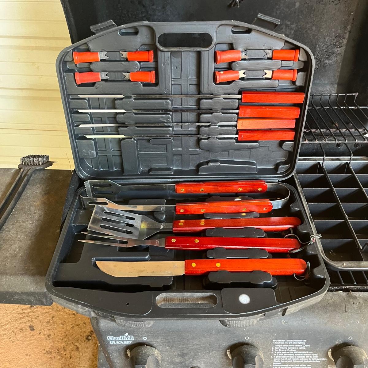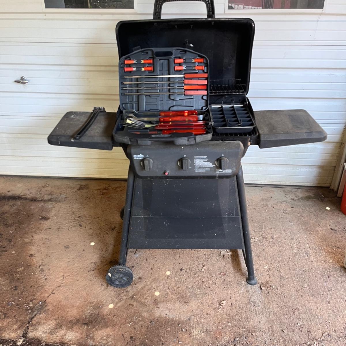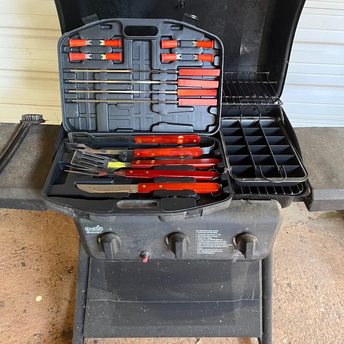 Lot includes a Char-Broil triple burner gas grill and a boxed set of BBQ tools that are in good condition. Grill has some rust on rack and burners, see pictures. Grill measures 23” x 52” x 43”.