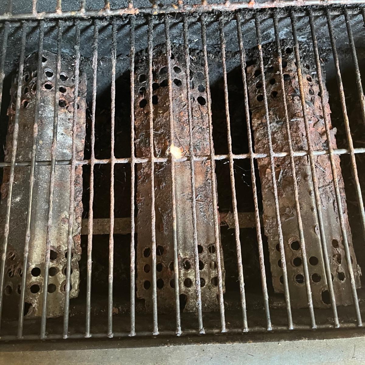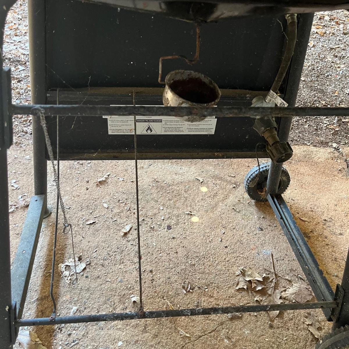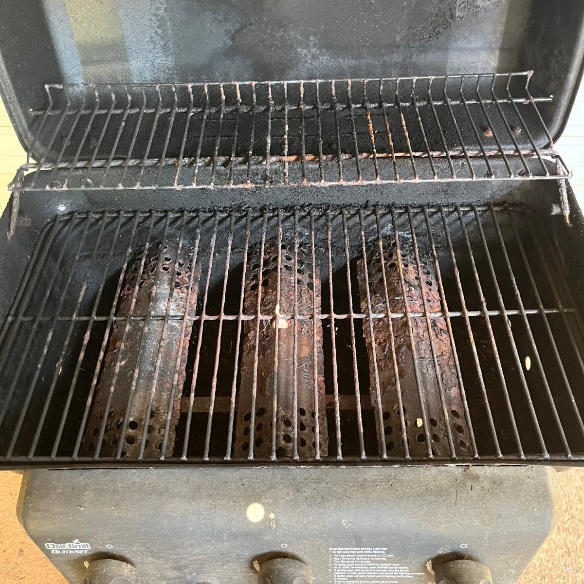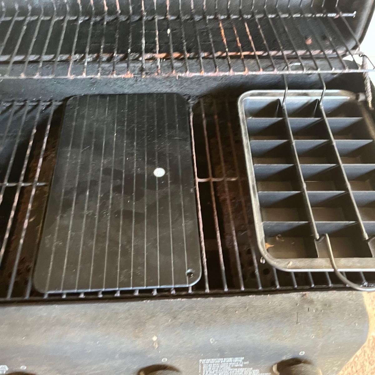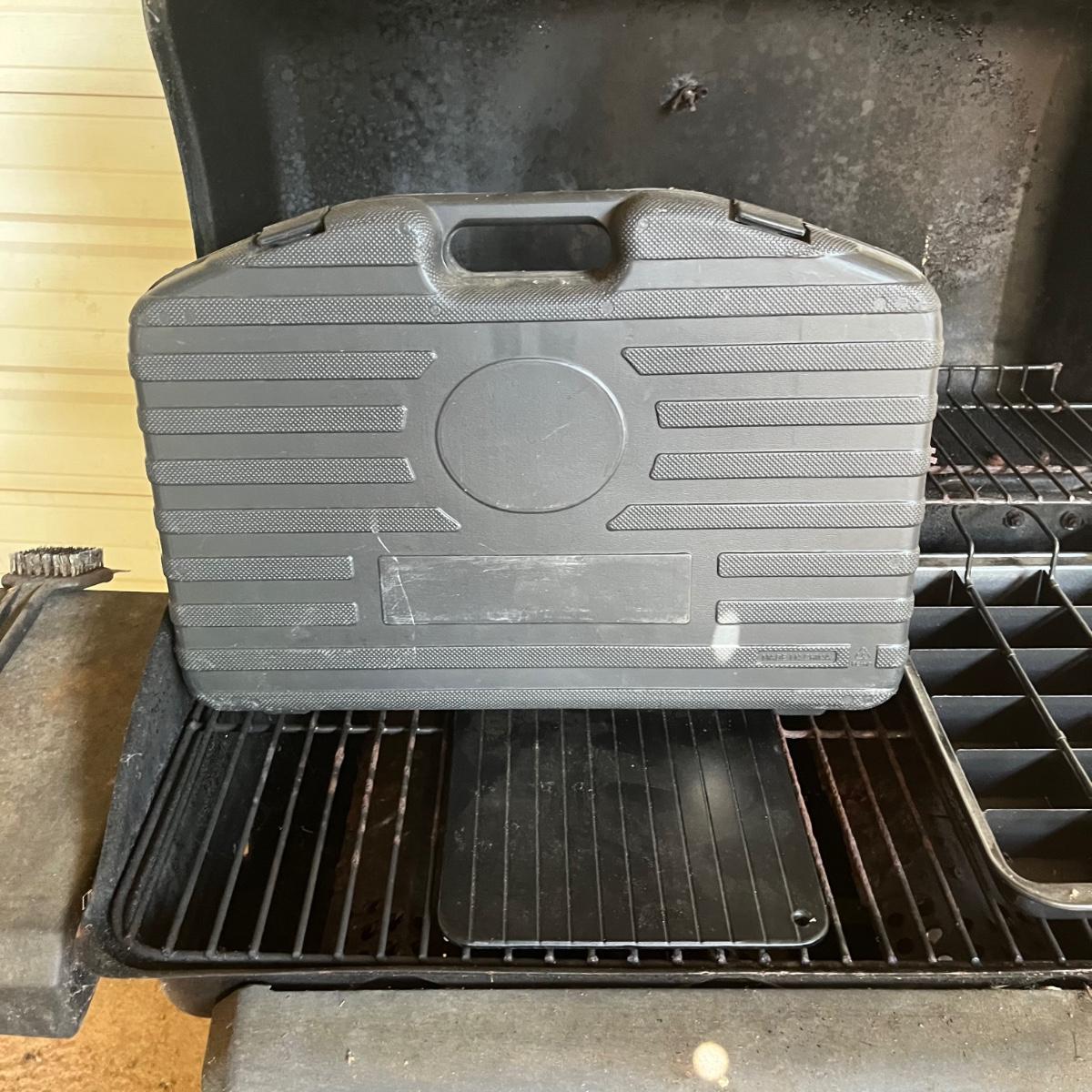 Lot includes a Char-Broil triple burner gas grill and a boxed set of BBQ tools that are in good condition. Grill has some rust on rack and burners, see pictures. Grill measures 23” x 52” x 43”.