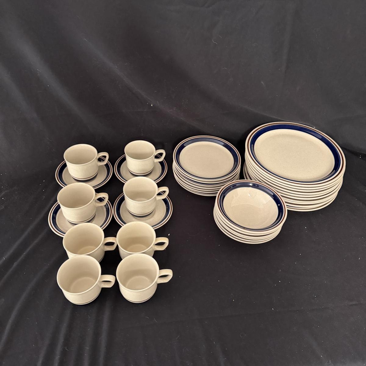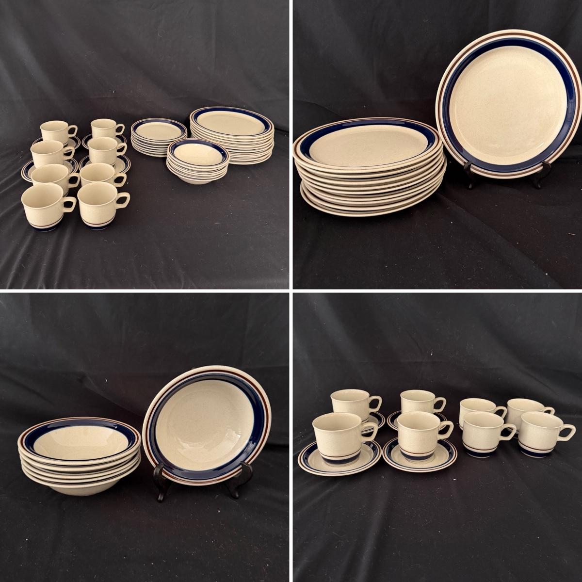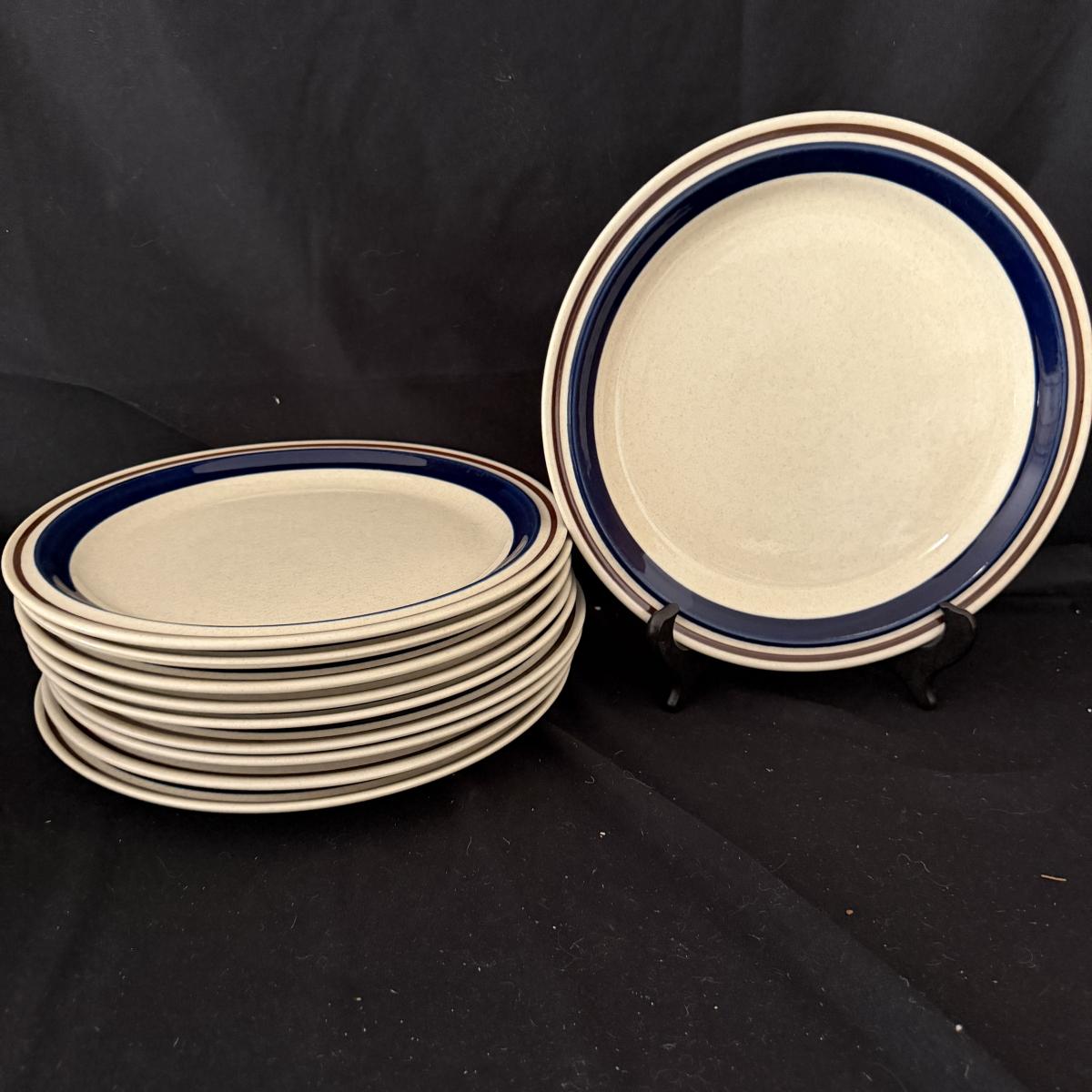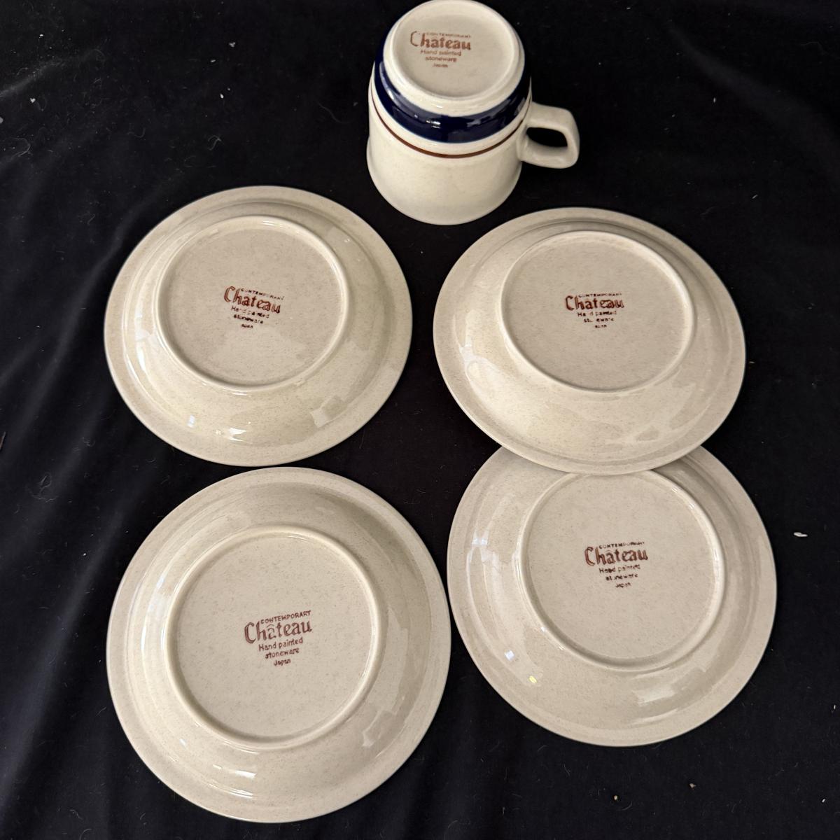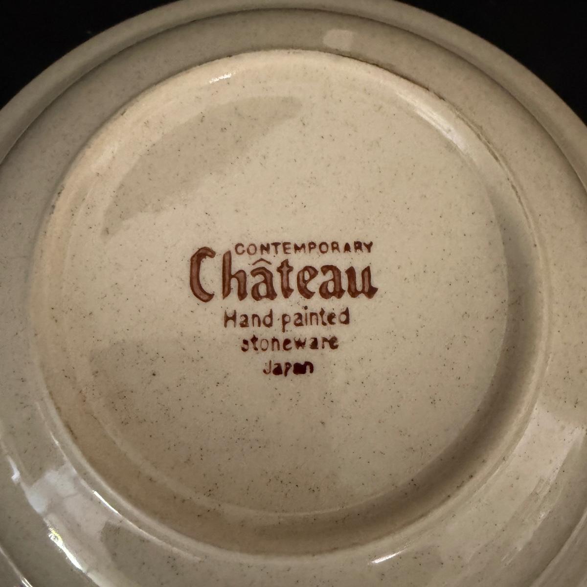 Lot contains a collection of Chateau hand painted stoneware. Includes 10 dinner plates, seven small plates, six bowls, eight tea cups and four saucers. One small plate and one bowl have chips, see pictures. Dinner plate measures 10.5”D.