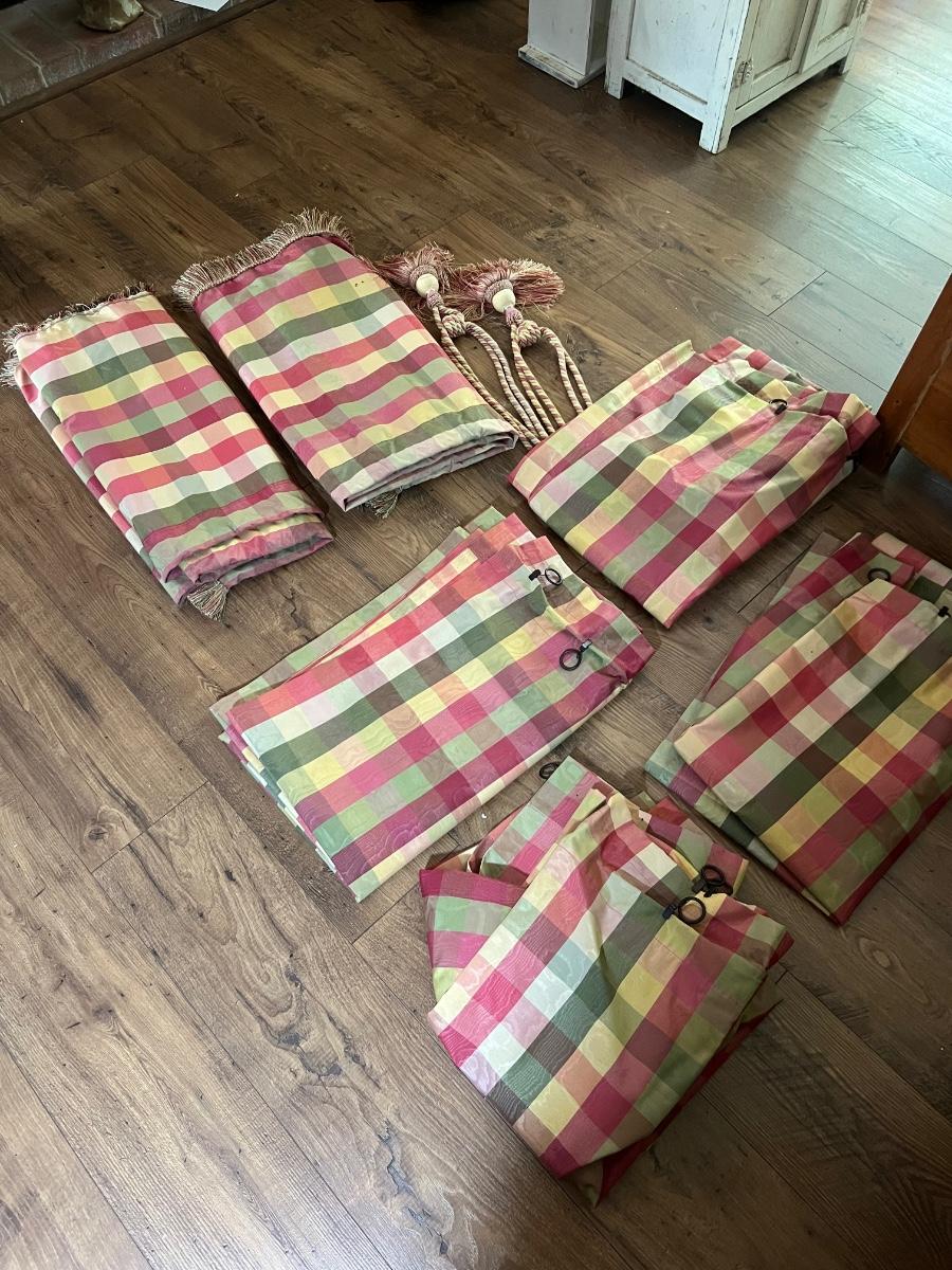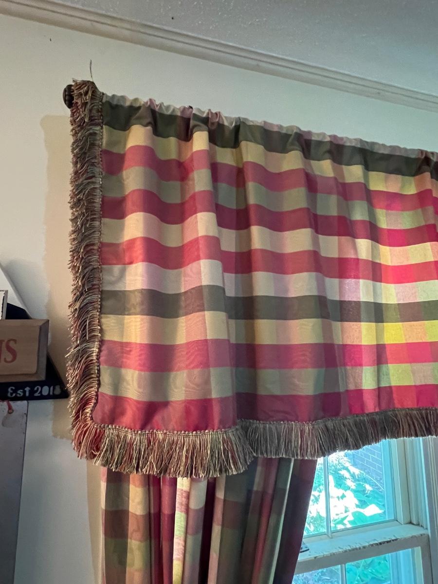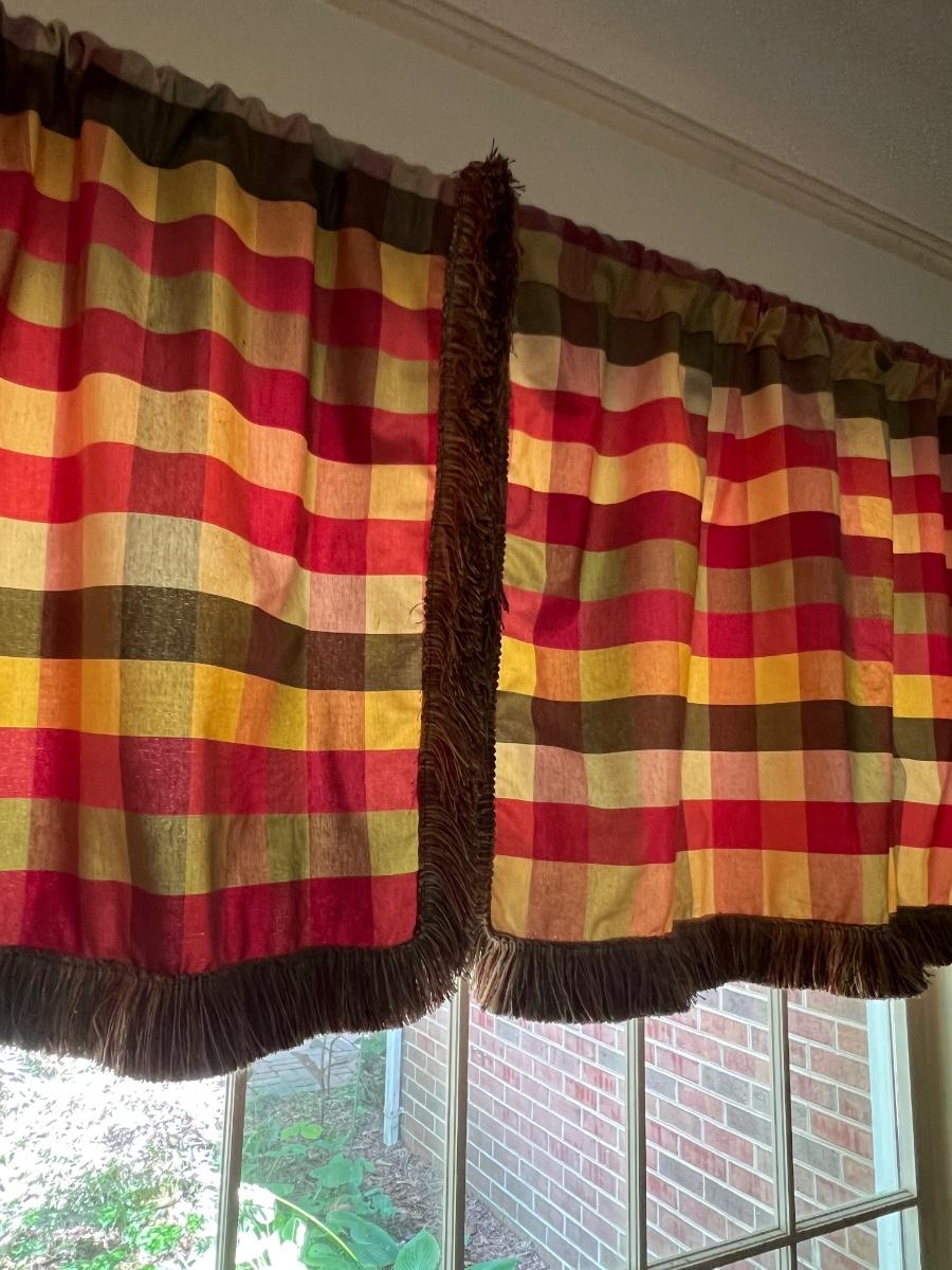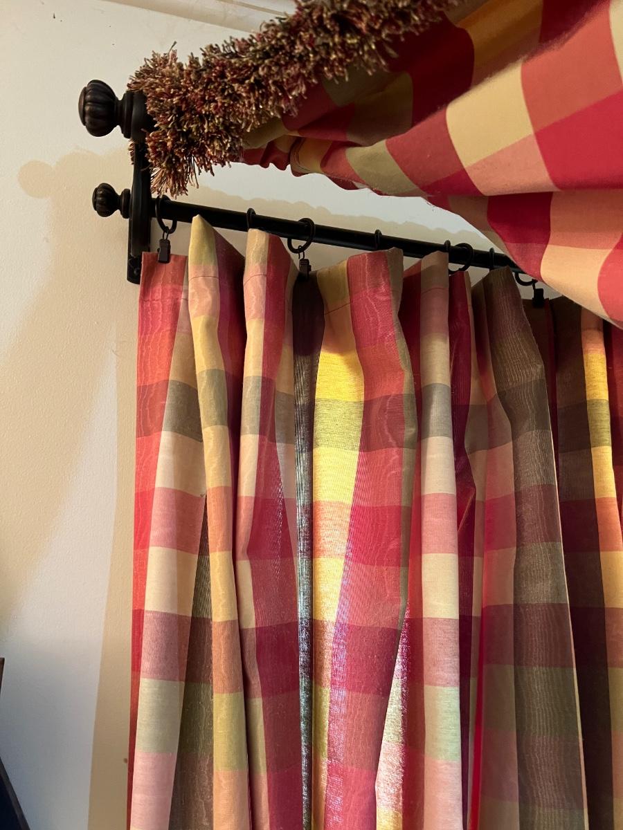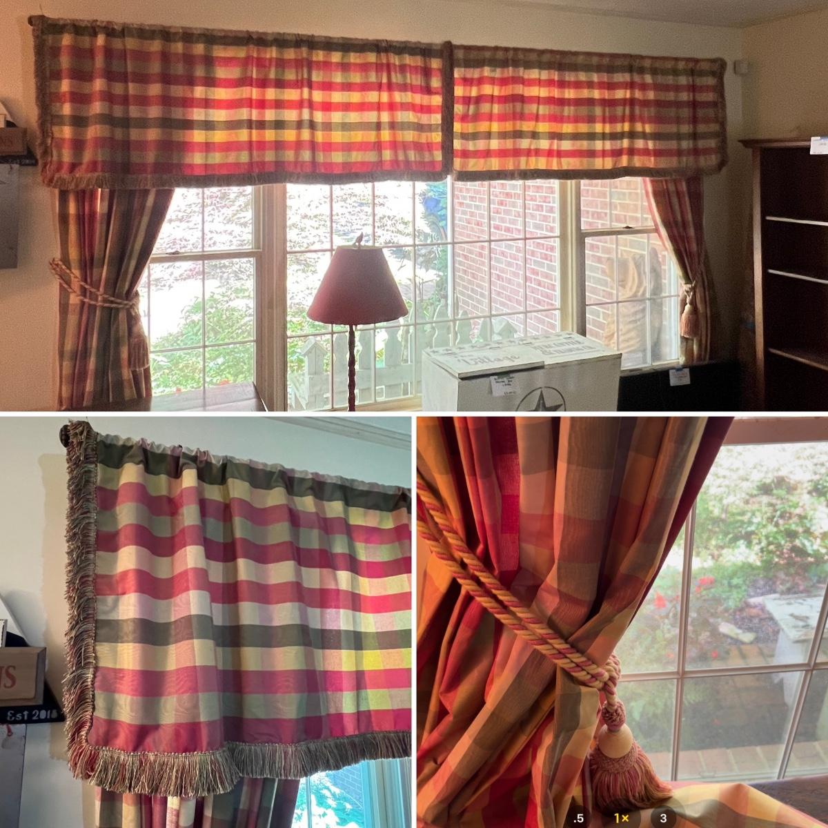 Four panels of checkered drapes with matching valances. Fabric has a light sheen giving it an almost silk like feel. The rods are not included but the ring clips are, see the last photo for full inventory. The drapes are tab top, so you don’t need the clips. They are very dusty and slightly faded. Each of the two valances measure 68” x 24”H.