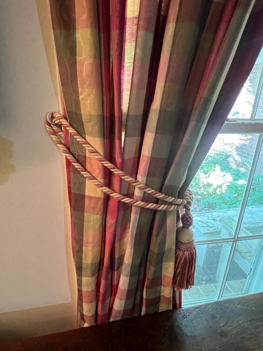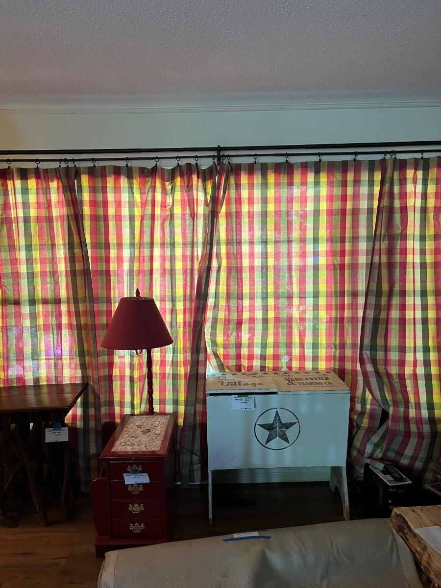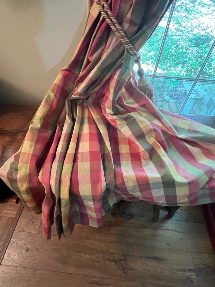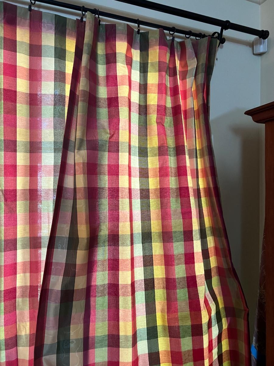 Four panels of checkered drapes with matching valances. Fabric has a light sheen giving it an almost silk like feel. The rods are not included but the ring clips are, see the last photo for full inventory. The drapes are tab top, so you don’t need the clips. They are very dusty and slightly faded. Each of the two valances measure 68” x 24”H.