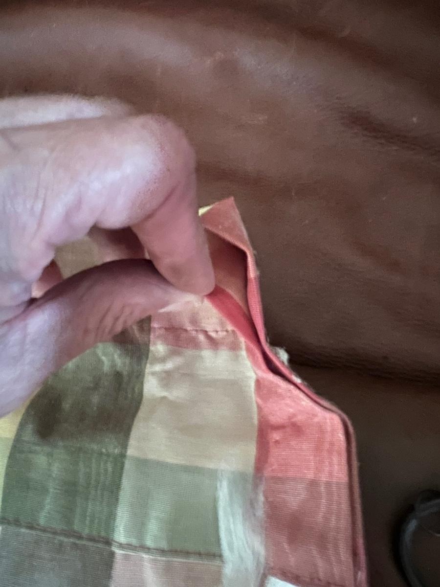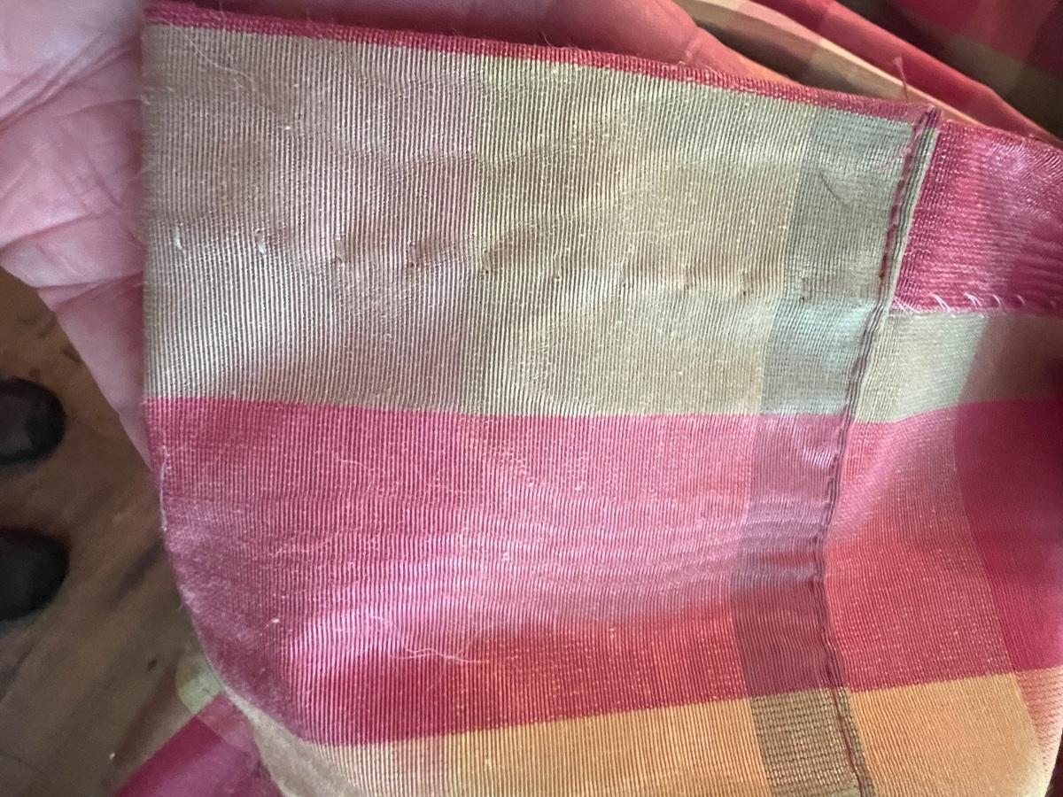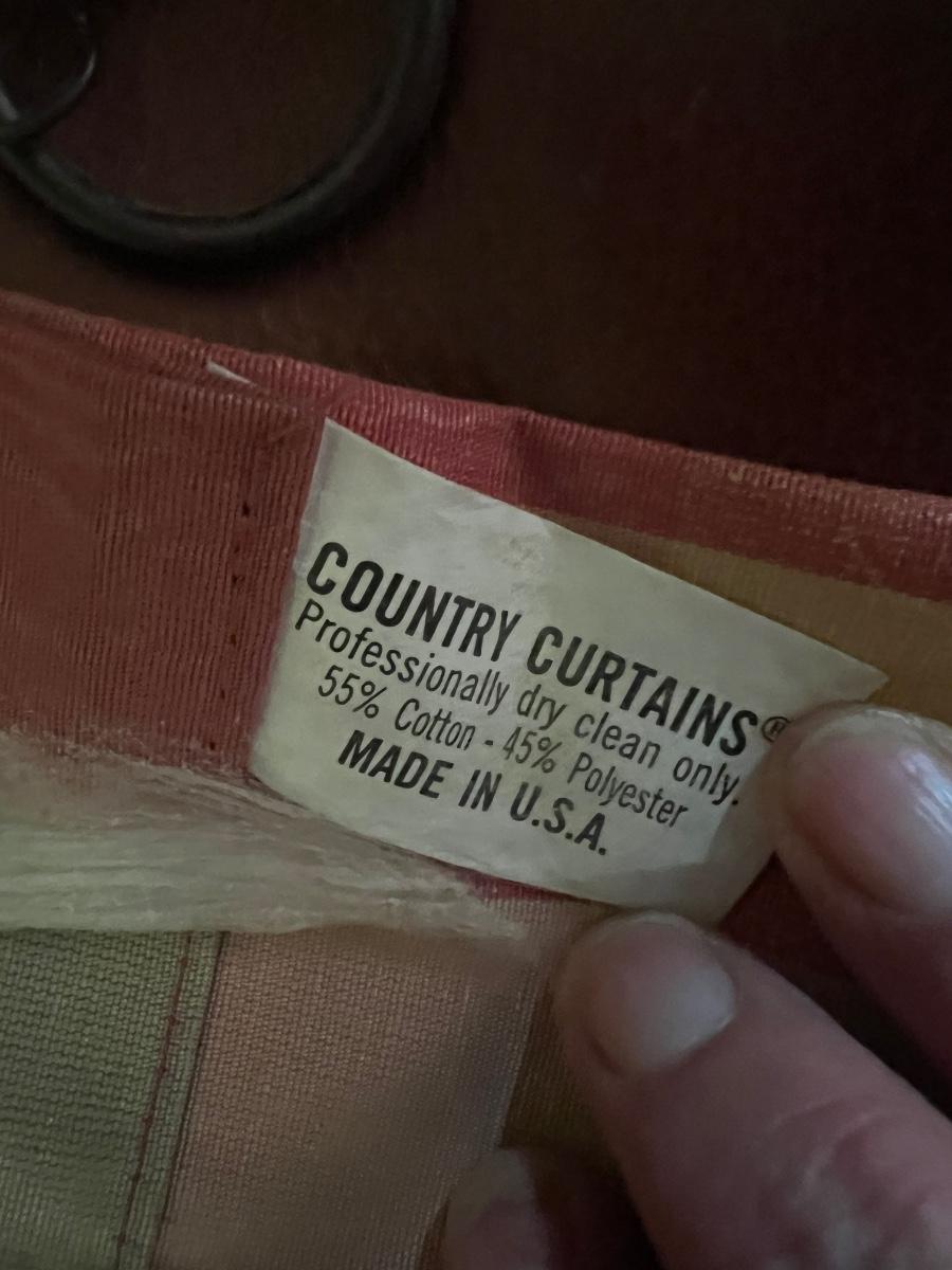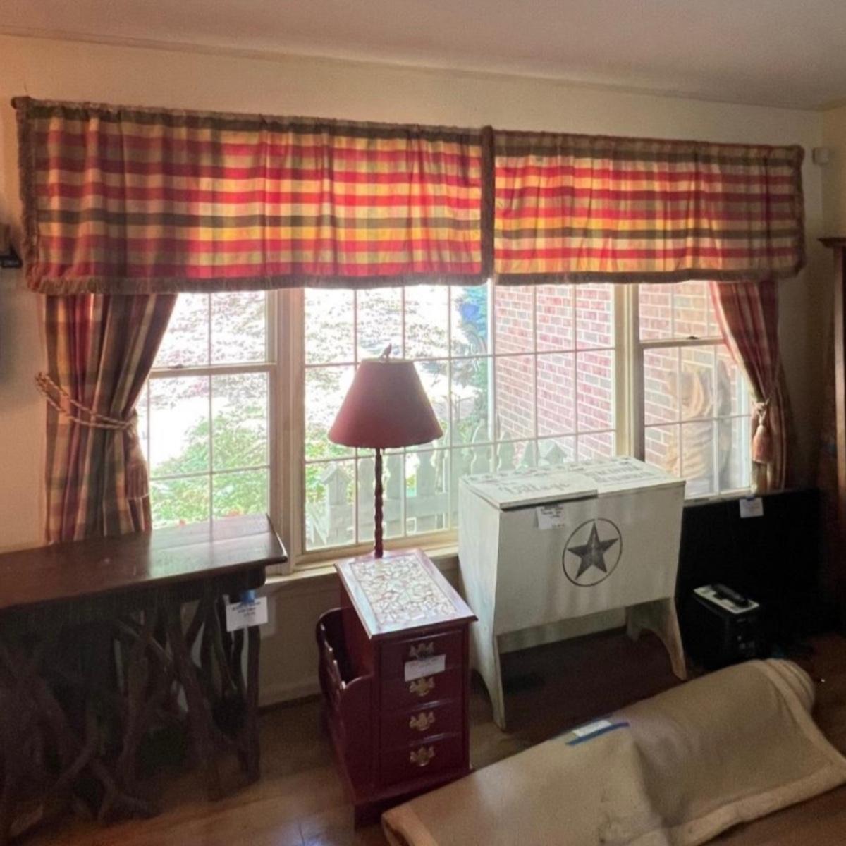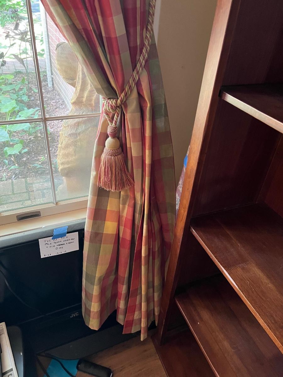 Four panels of checkered drapes with matching valances. Fabric has a light sheen giving it an almost silk like feel. The rods are not included but the ring clips are, see the last photo for full inventory. The drapes are tab top, so you don’t need the clips. They are very dusty and slightly faded. Each of the two valances measure 68” x 24”H.