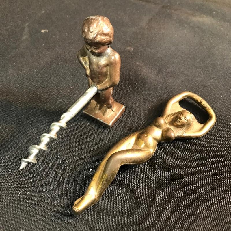 Two vintage cheeky bottle opener and corkscrew. Both are unmarked and have considerable patina. See pictures.