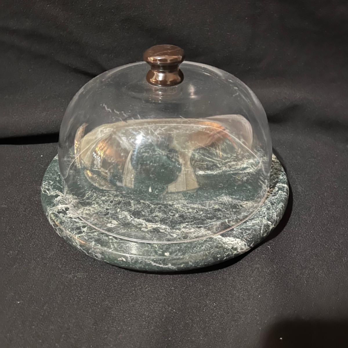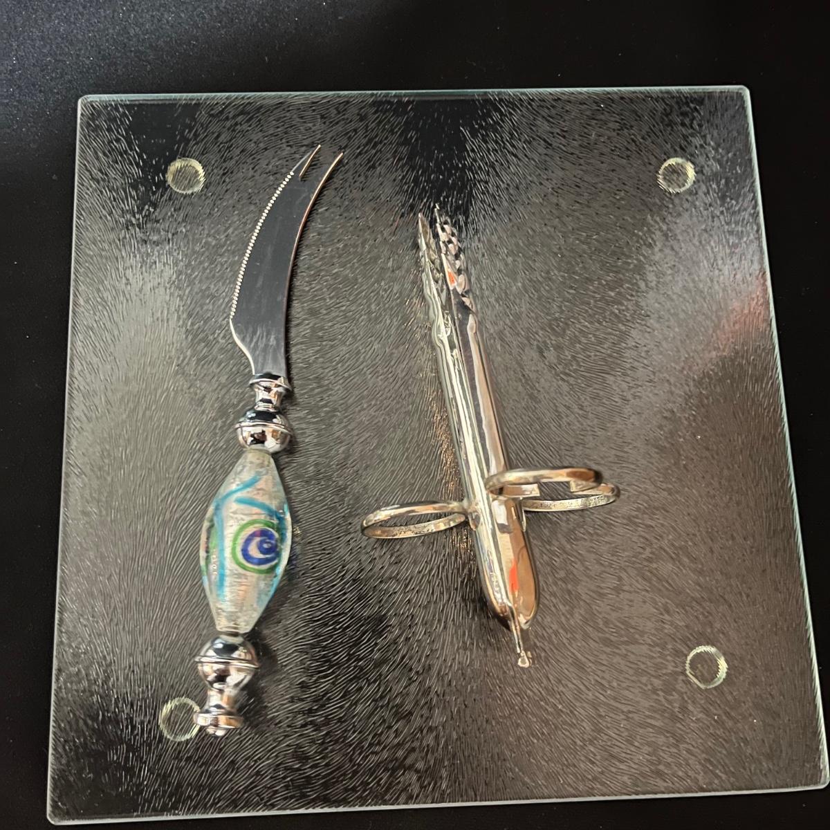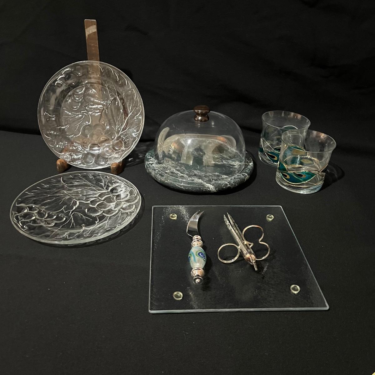 This lot includes two lovely cocktail glasses with hand blown detail; two small glass plates, cheese knife with glass handle, glass cutting square, and footed marble-like cheese plate with plastic domed lid. Lot also includes small serving tongs. This lot is perfect for the patio!