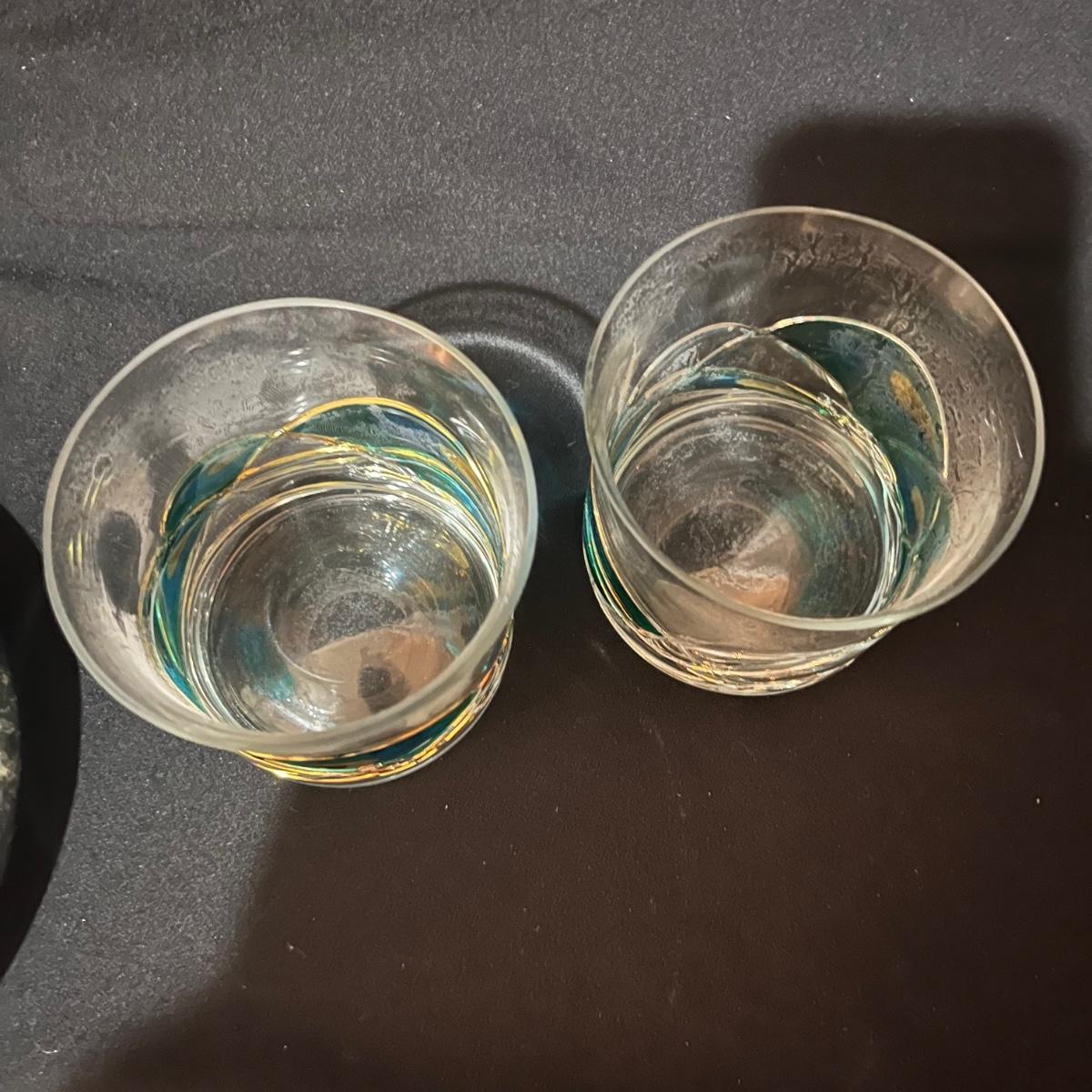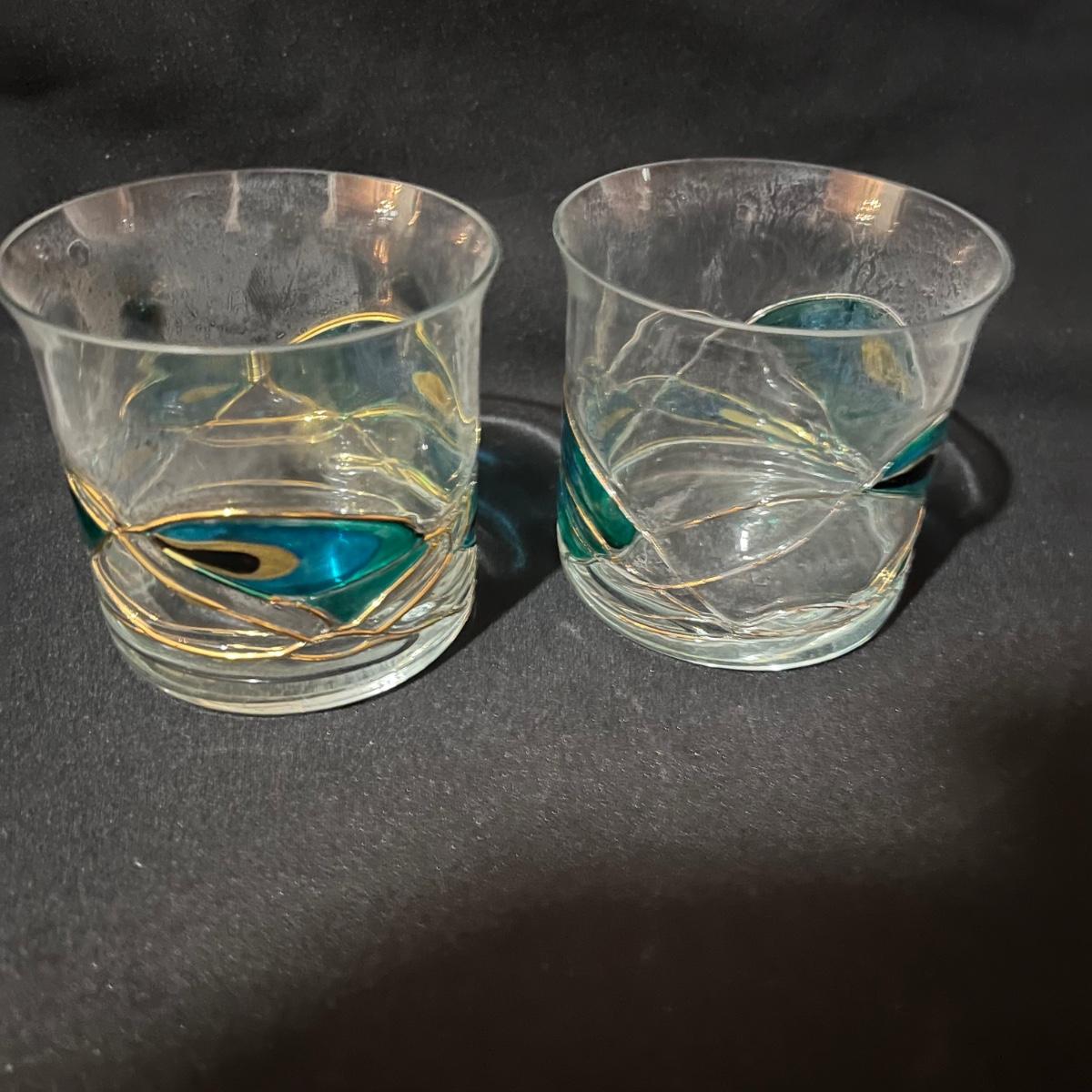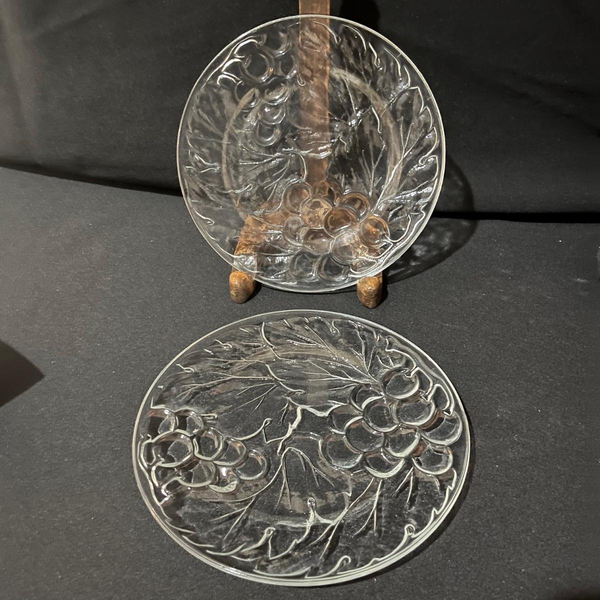 This lot includes two lovely cocktail glasses with hand blown detail; two small glass plates, cheese knife with glass handle, glass cutting square, and footed marble-like cheese plate with plastic domed lid. Lot also includes small serving tongs. This lot is perfect for the patio!
