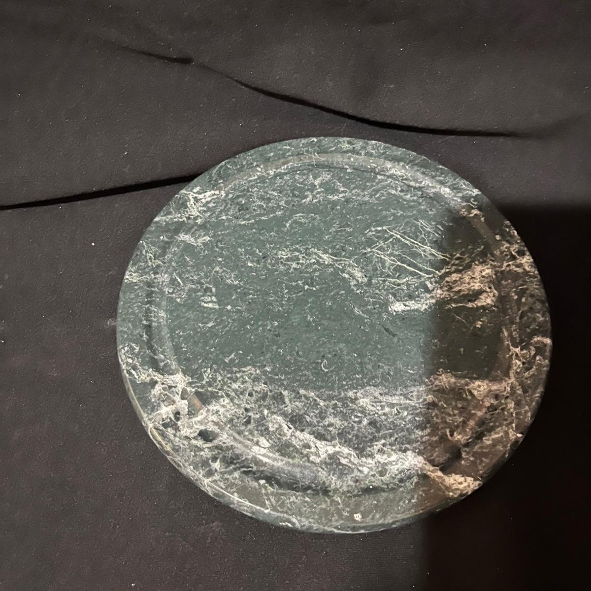 Footed marble-like cheese plate measures, 7.5”D x .75”H.