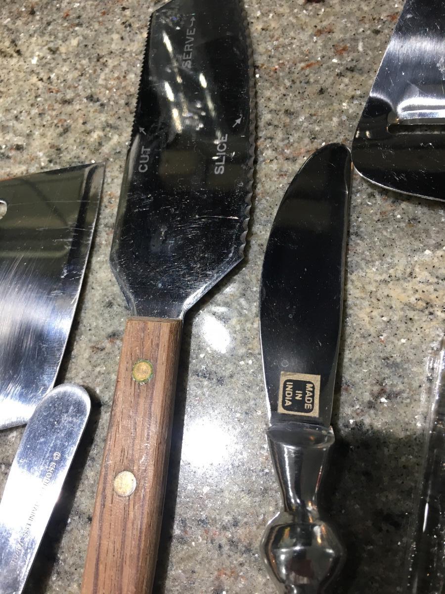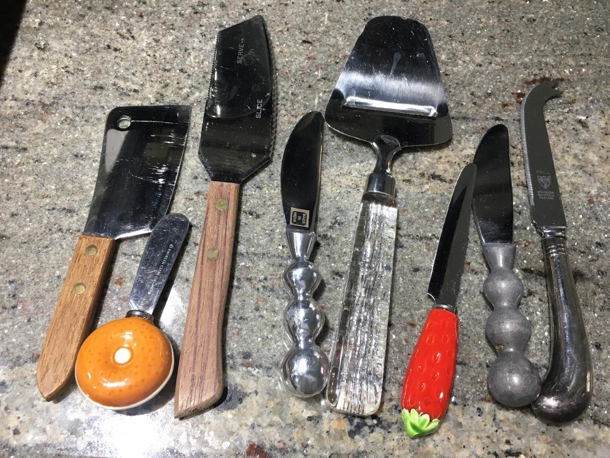 Large assortment of cheese knives.