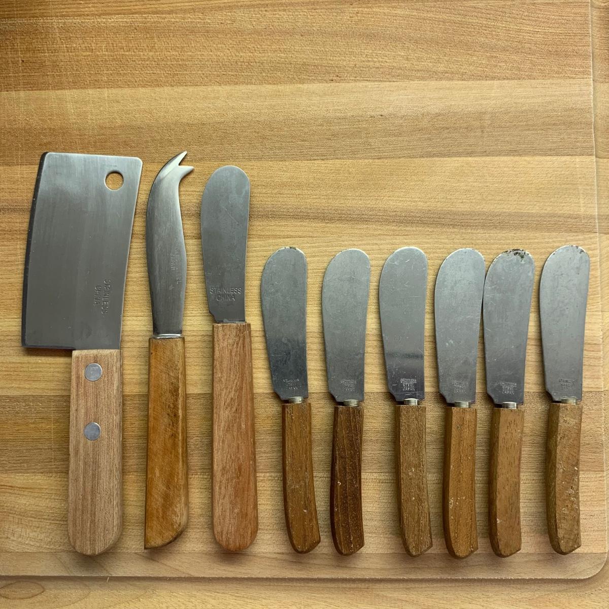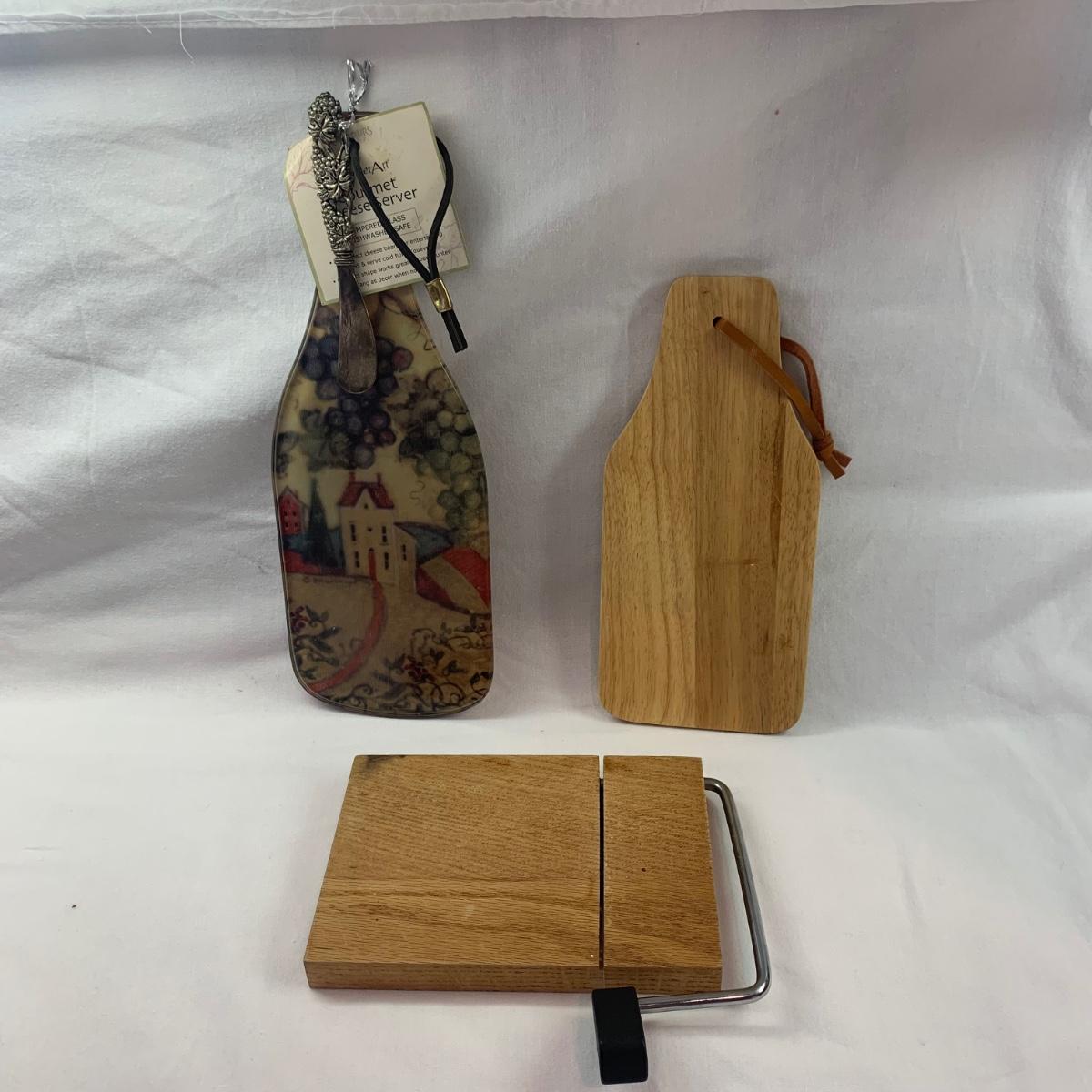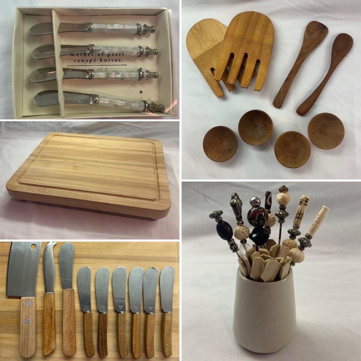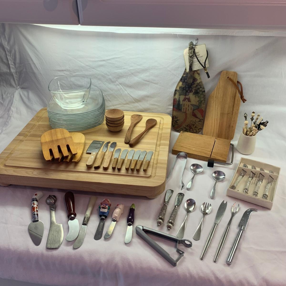 A fun variety of appetizer and serving dishes and utensils. Lot includes one large (20” x 16” x 2.75”H) wooden cutting/serving board, one wooden cheese slicer board, two cheese server boards (one glass, one wood), wood salad claws, four little wood bowls, and two wood utensils. Also included are a variety of cheese knives and other appetizer serving utensils, including a box of four Mother of Pearl canapé knives and a cherry pitter. Finally, there are 12 square glass plates with a square shaped bowl. The glass plates and the large cutting board have some light scratches/knife marks.