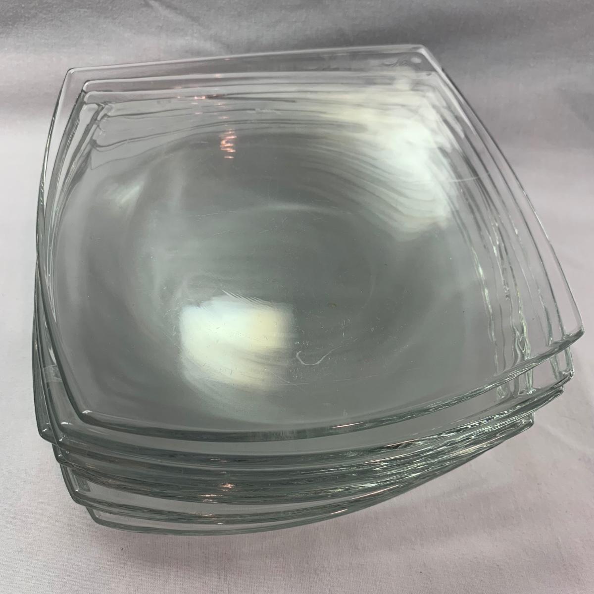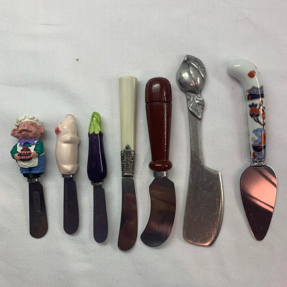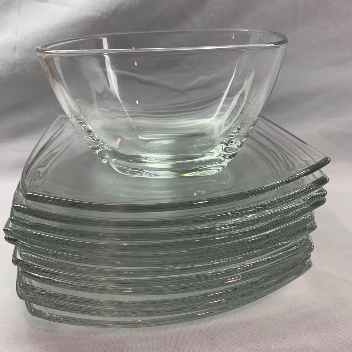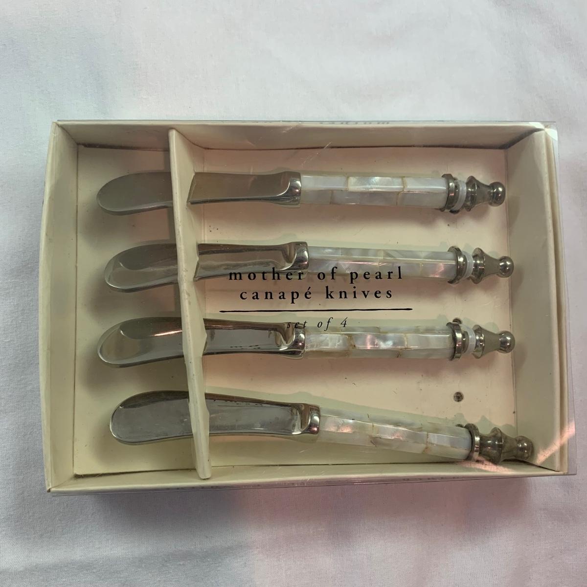 A fun variety of appetizer and serving dishes and utensils. Lot includes one large (20” x 16” x 2.75”H) wooden cutting/serving board, one wooden cheese slicer board, two cheese server boards (one glass, one wood), wood salad claws, four little wood bowls, and two wood utensils. Also included are a variety of cheese knives and other appetizer serving utensils, including a box of four Mother of Pearl canapé knives and a cherry pitter. Finally, there are 12 square glass plates with a square shaped bowl. The glass plates and the large cutting board have some light scratches/knife marks.
