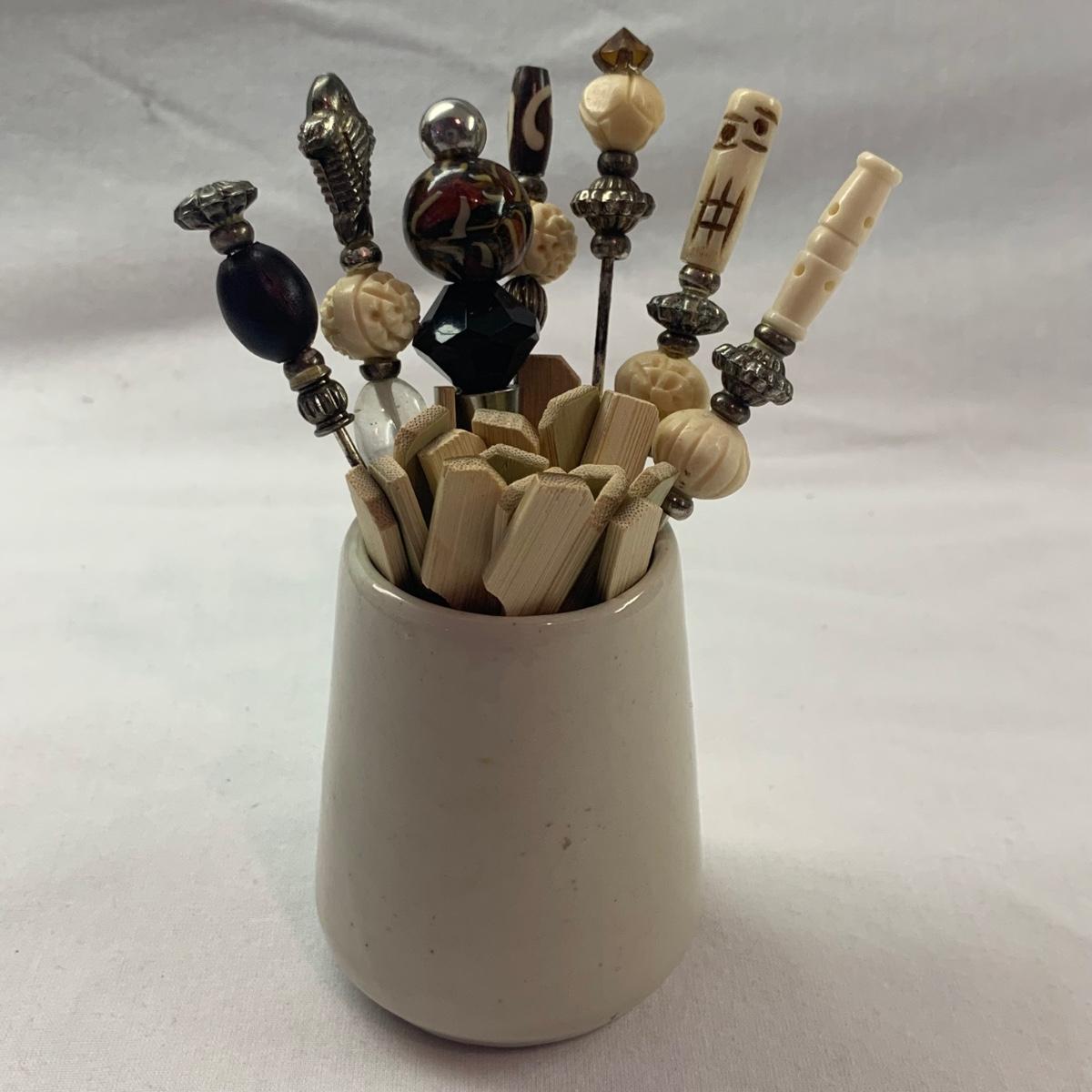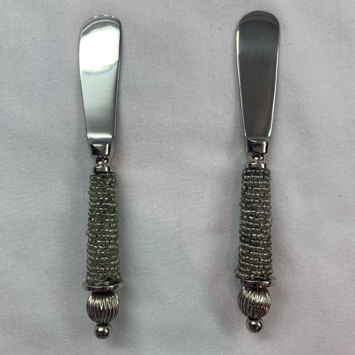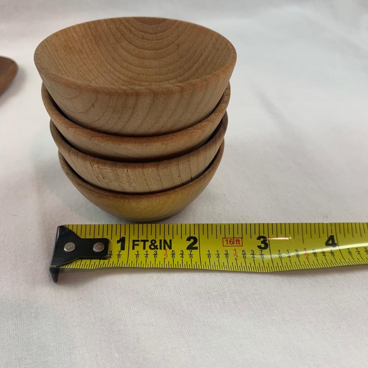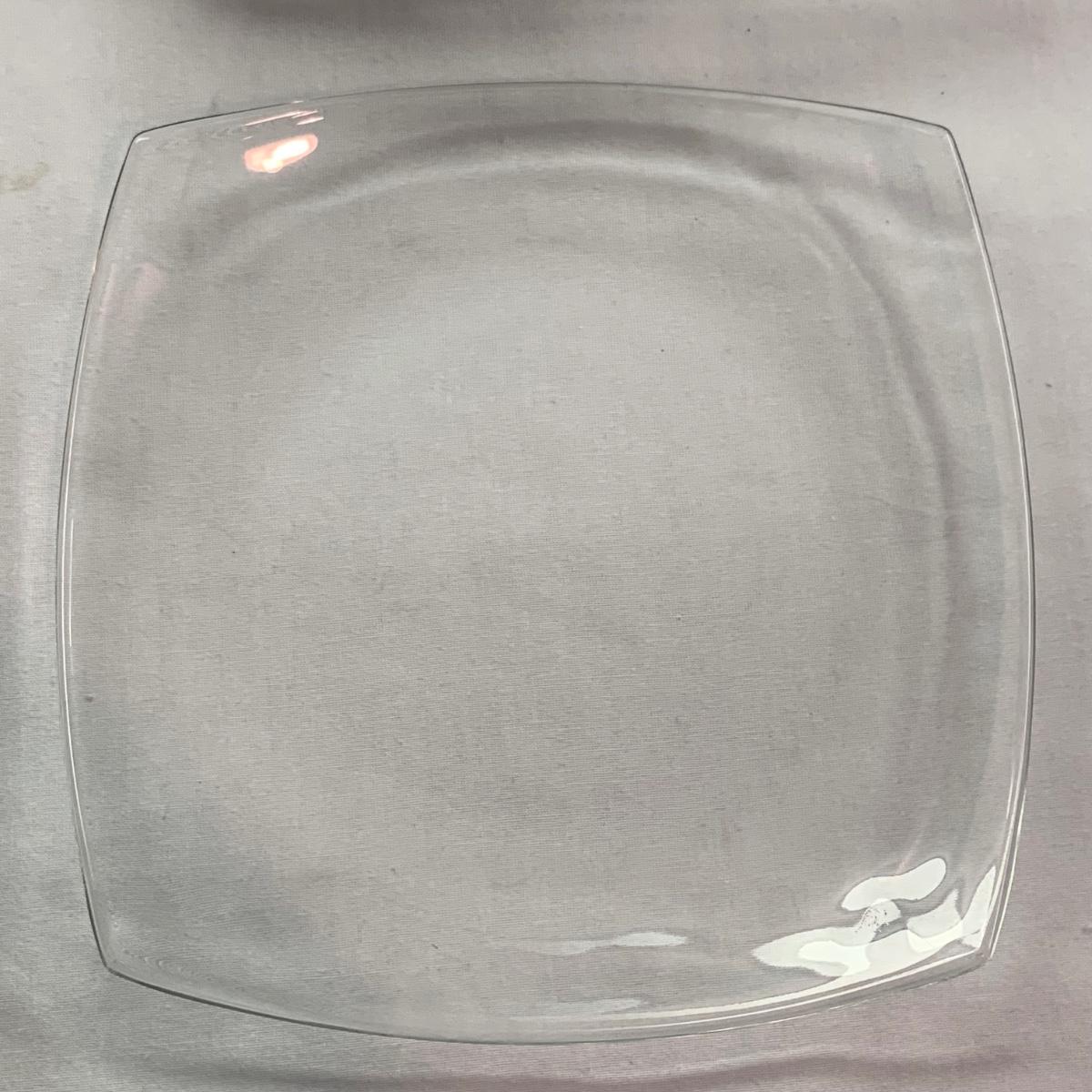 A fun variety of appetizer and serving dishes and utensils. Lot includes one large (20” x 16” x 2.75”H) wooden cutting/serving board, one wooden cheese slicer board, two cheese server boards (one glass, one wood), wood salad claws, four little wood bowls, and two wood utensils. Also included are a variety of cheese knives and other appetizer serving utensils, including a box of four Mother of Pearl canapé knives and a cherry pitter. Finally, there are 12 square glass plates with a square shaped bowl. The glass plates and the large cutting board have some light scratches/knife marks.