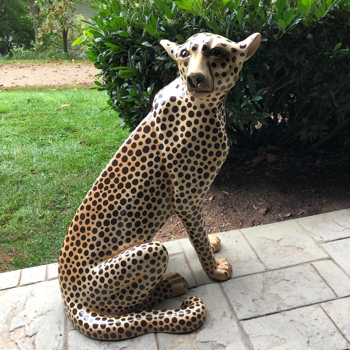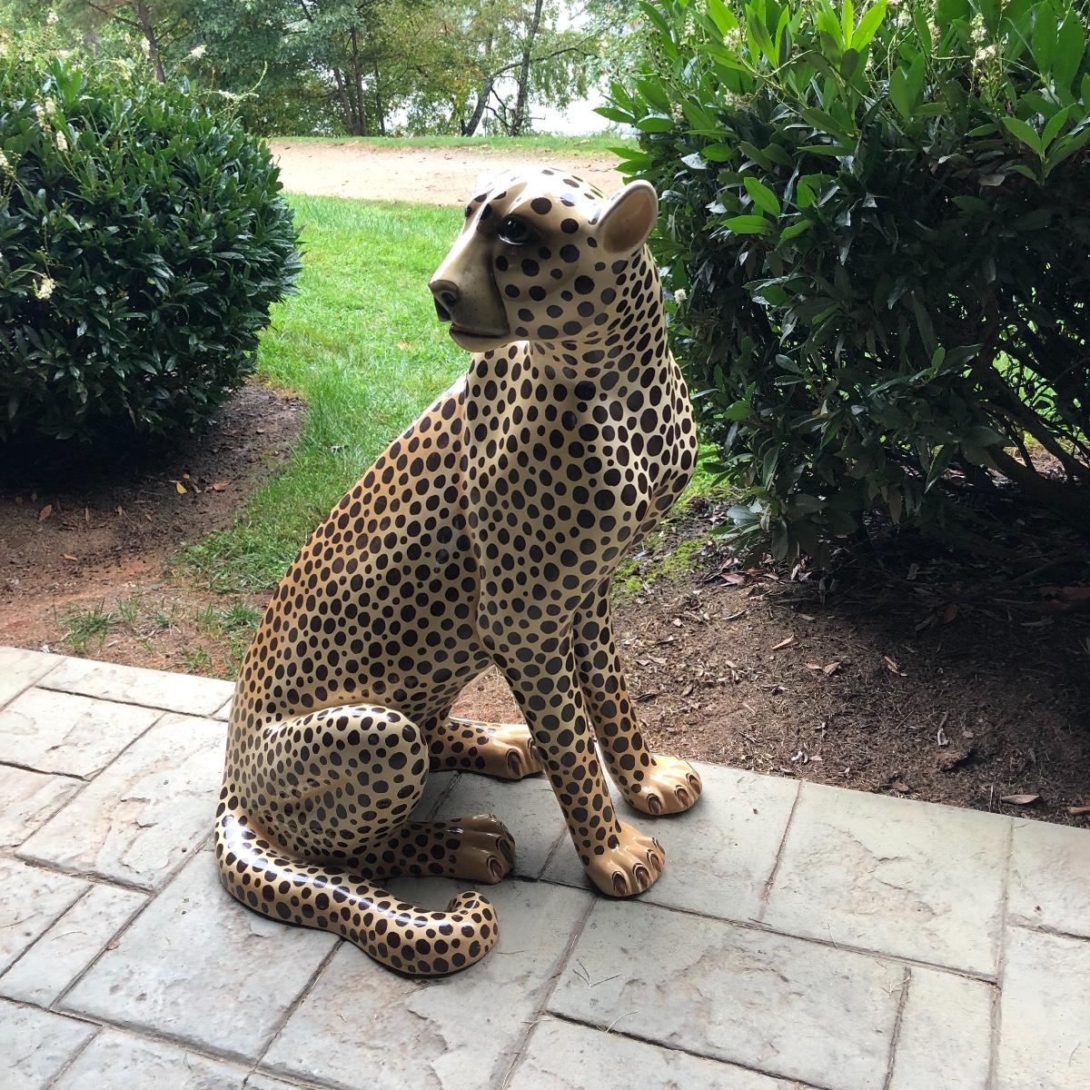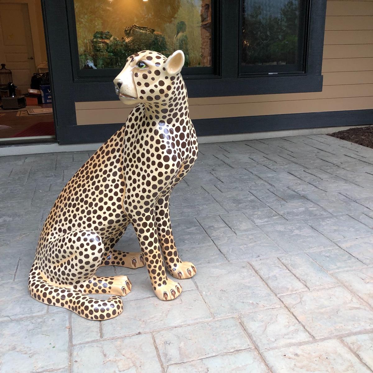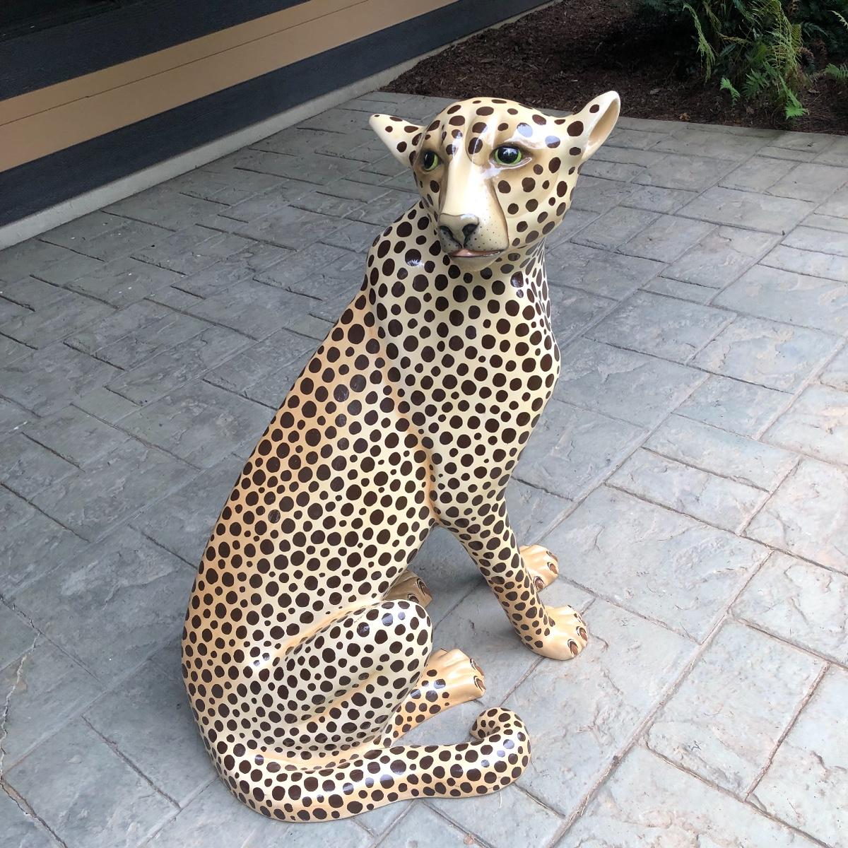 The cheetah is 38” tall and approximately 26.5” wide. It is made of fiberglass and not too heavy. Local pick up only.