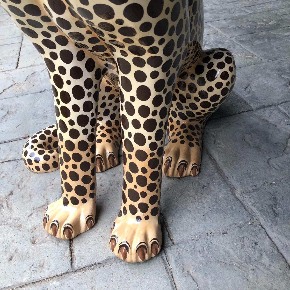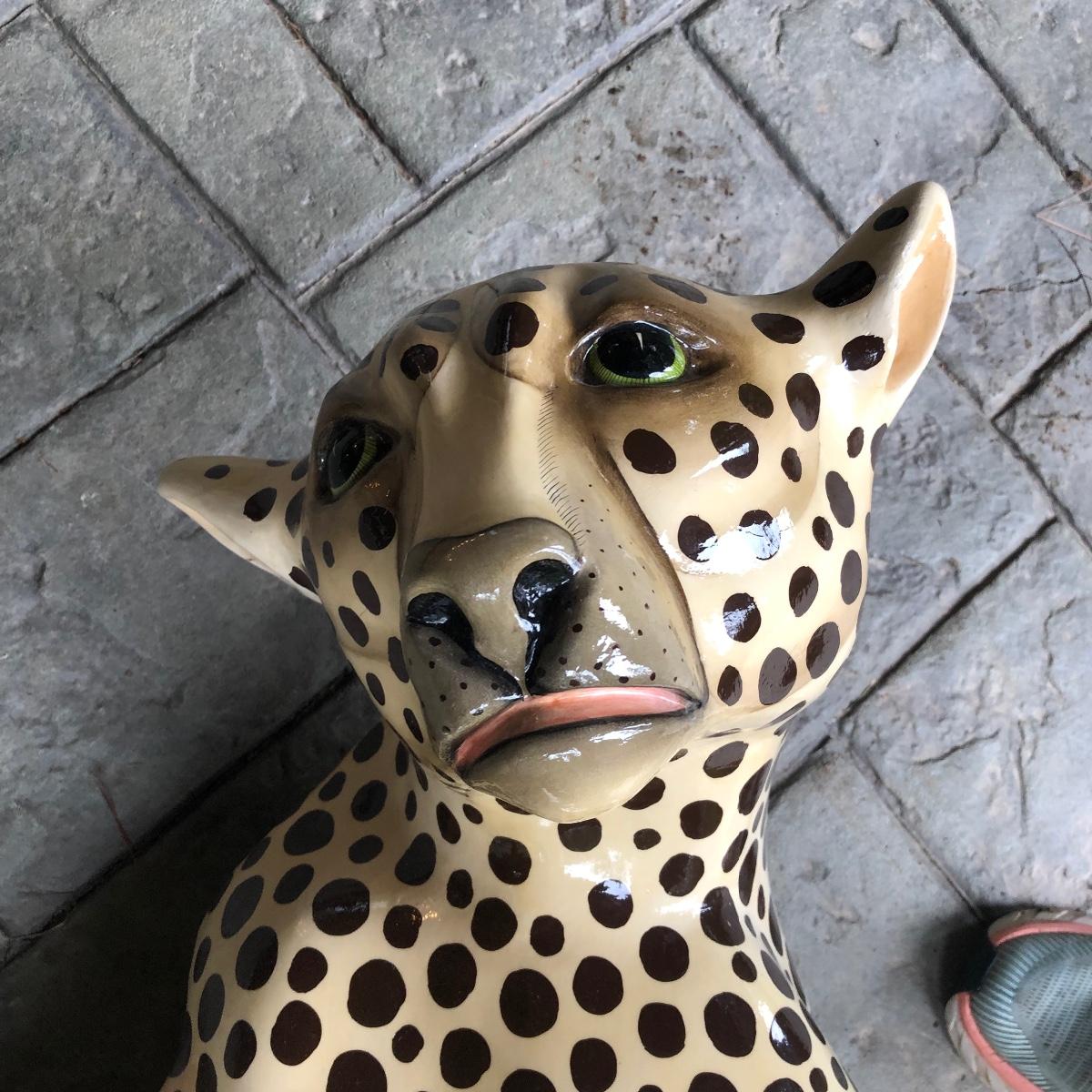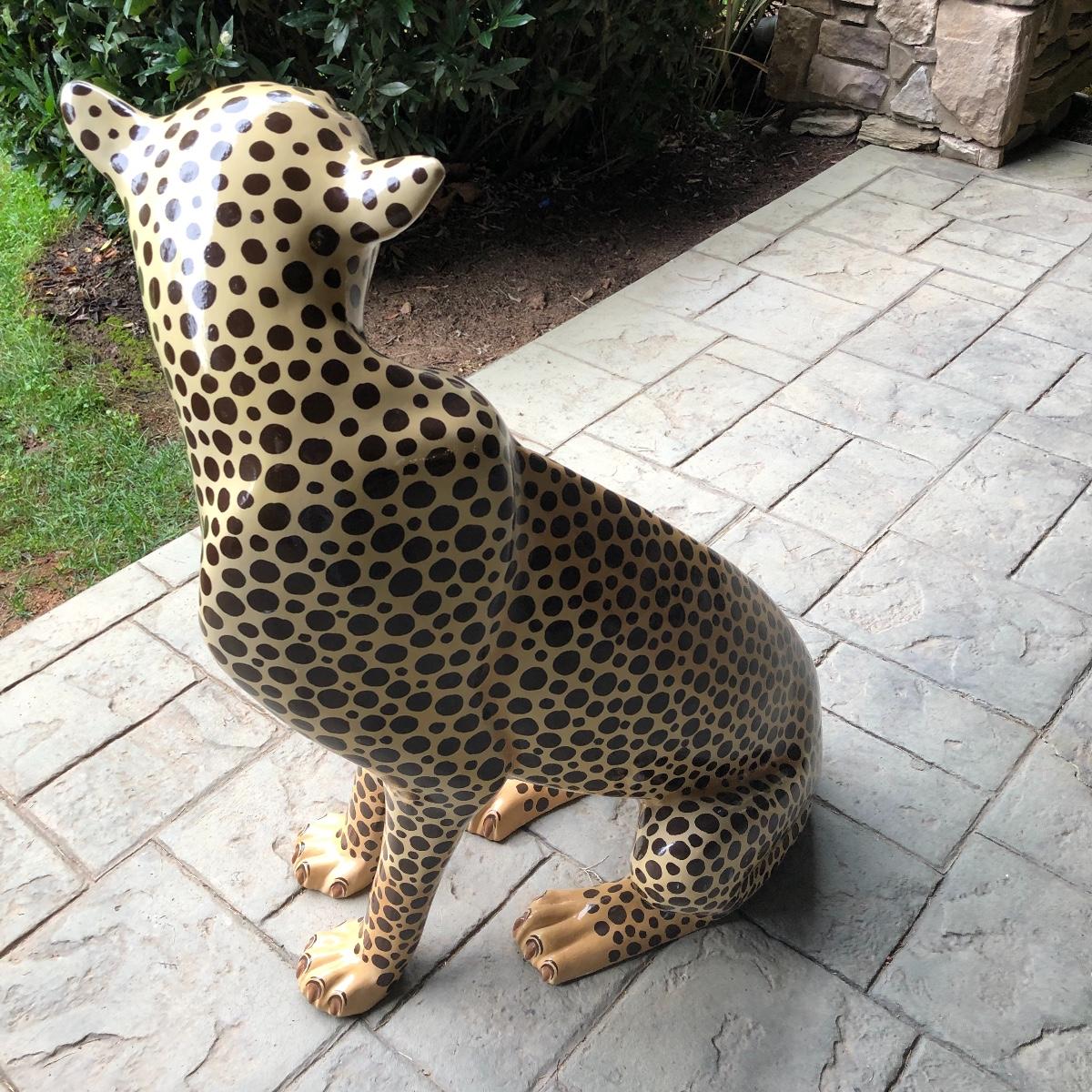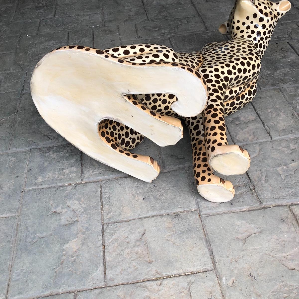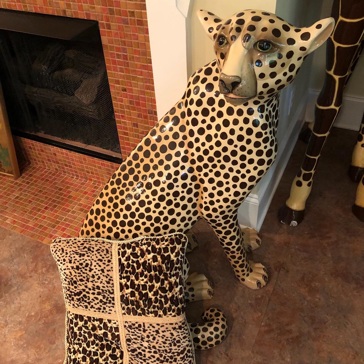 The cheetah is 38” tall and approximately 26.5” wide. It is made of fiberglass and not too heavy. Local pick up only.