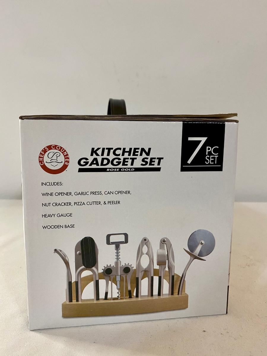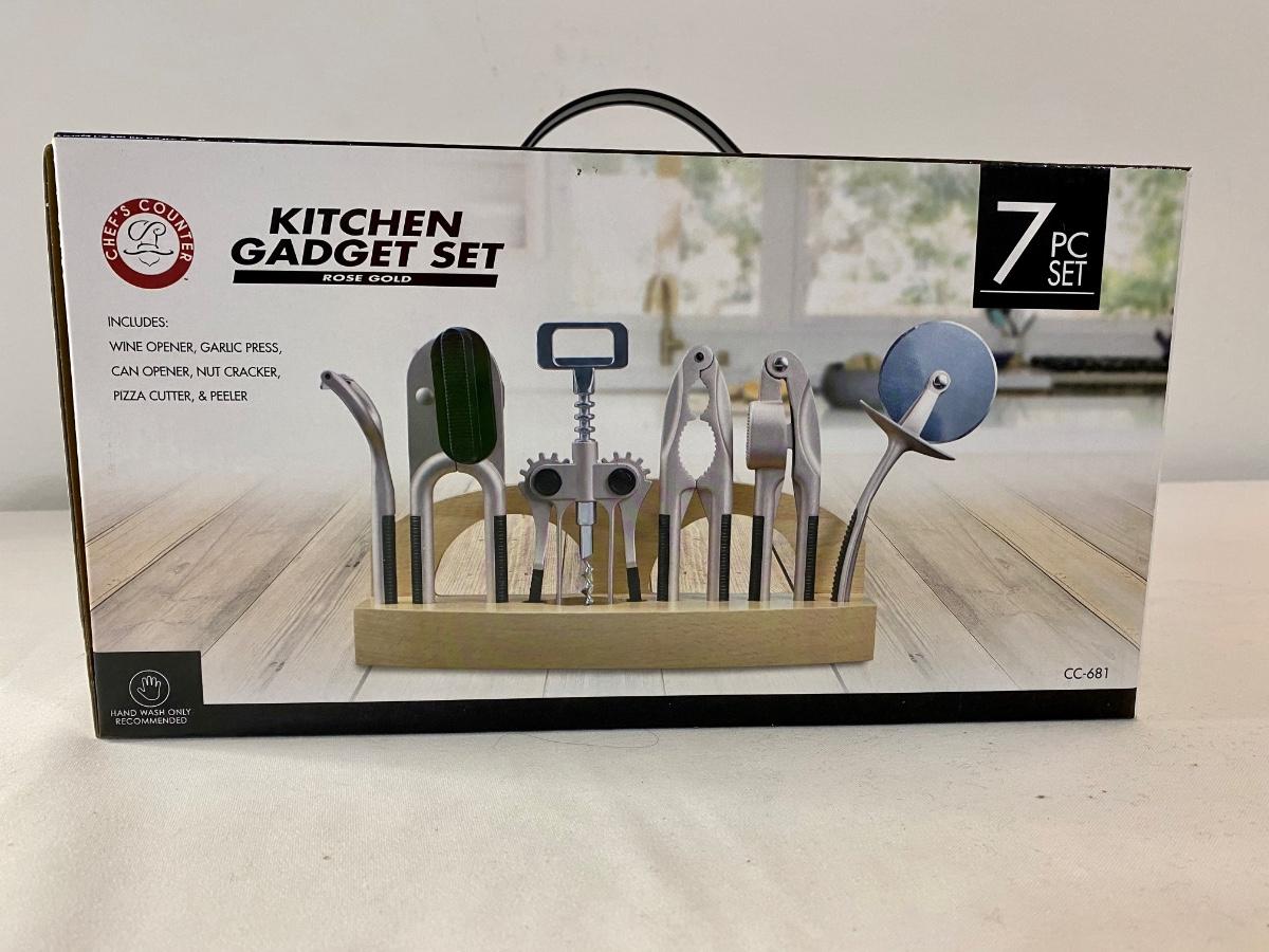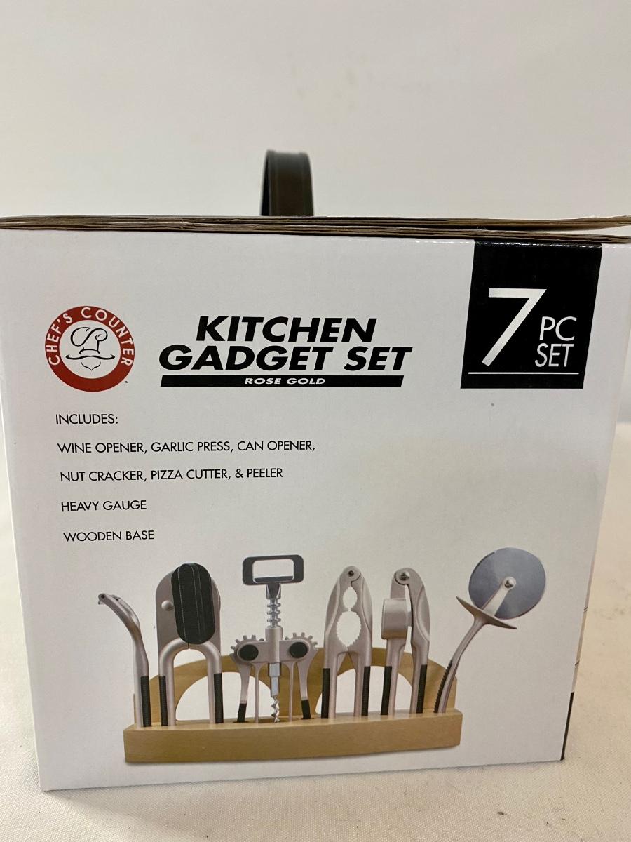 7 piece set includes wine opener, garlic press, can opener, nut cracker, pizza cutter and peeler. New in box.