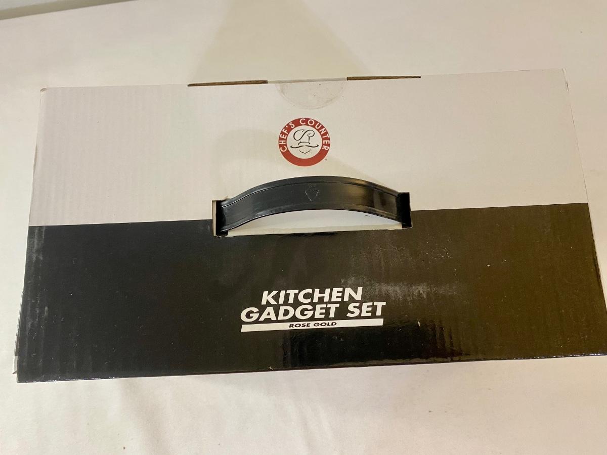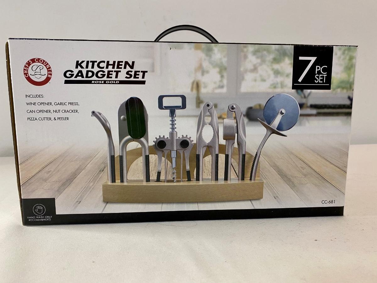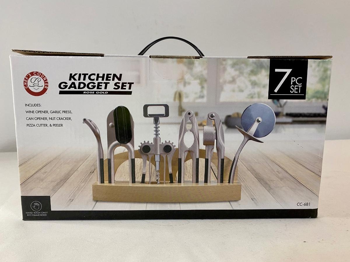 7 piece set includes wine opener, garlic press, can opener, nut cracker, pizza cutter and peeler. New in box.