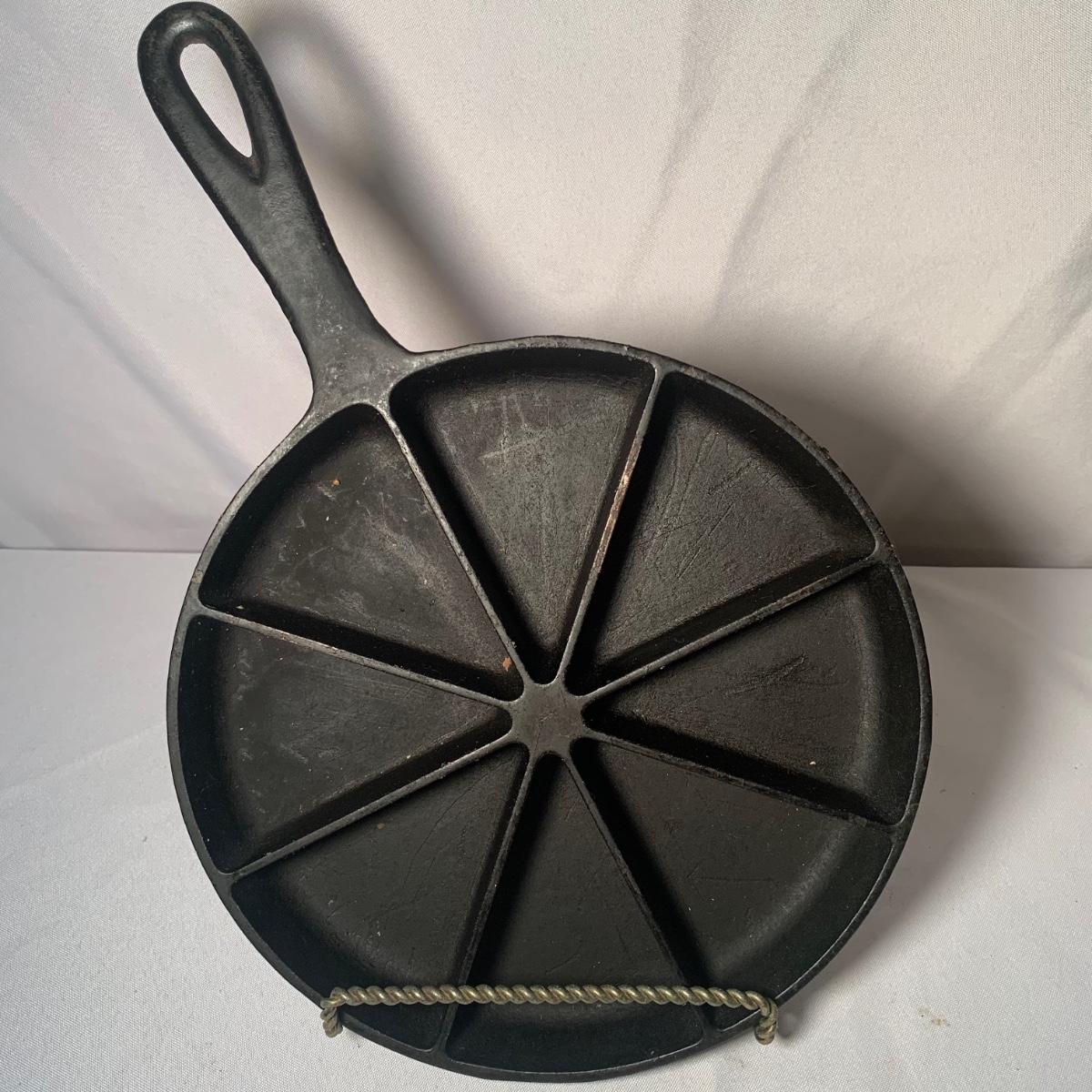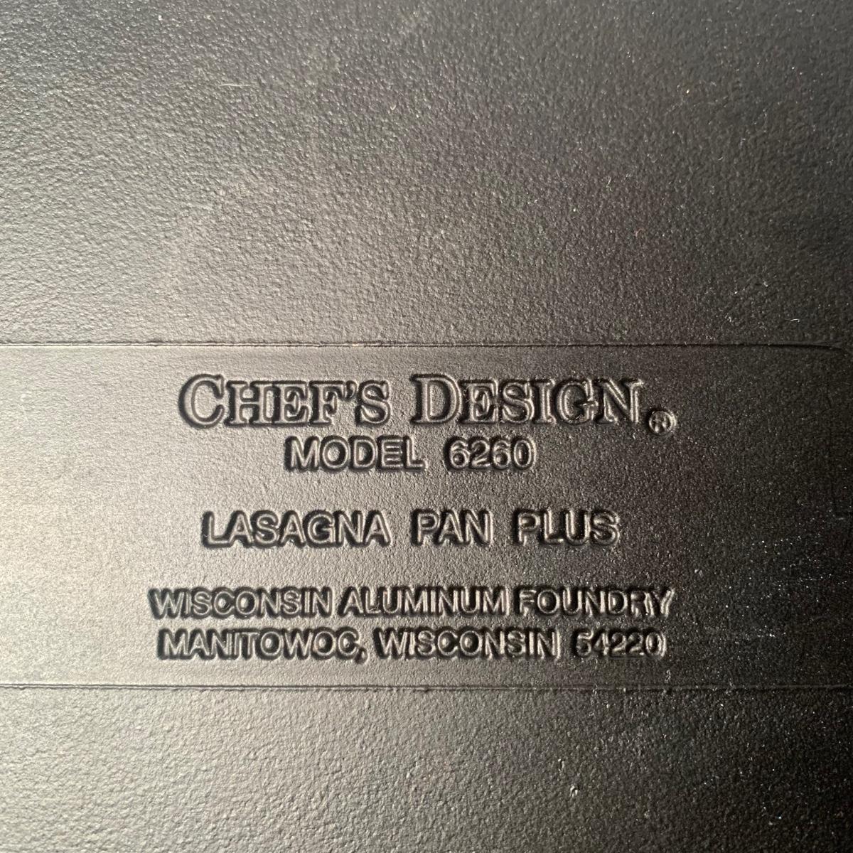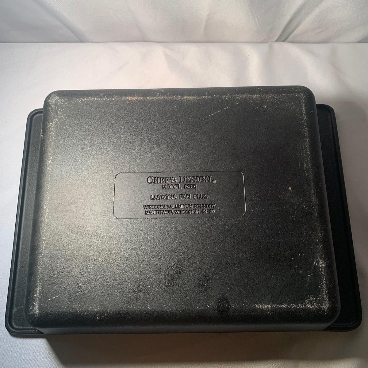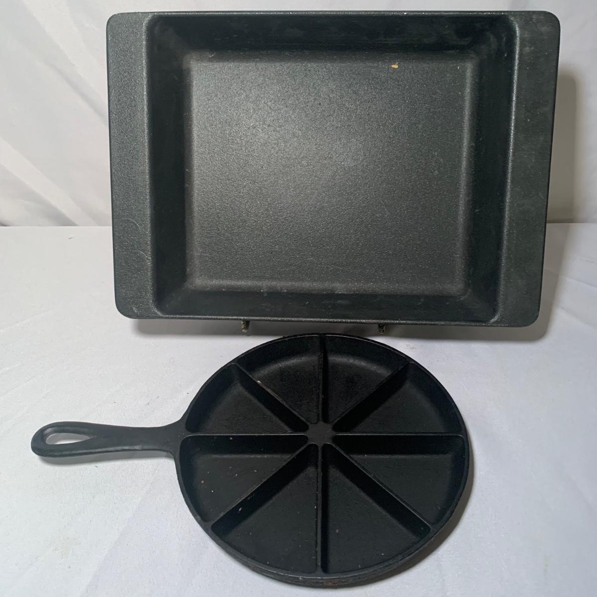 Lot includes 12”L x 10”W Chef’s Design Lasagna Pan Plus (model 6250). Made in Manitowoc, Wisconsin, it is made of heavyweight aluminum and has a non-stick finish. Pan has a few scratches but is in good condition. Lot also includes a 9” Cast iron wedge cornbread pan. Cast iron could use a good cleaning, but will still make delicious cornbread in single serve wedges! Wire stand not included.