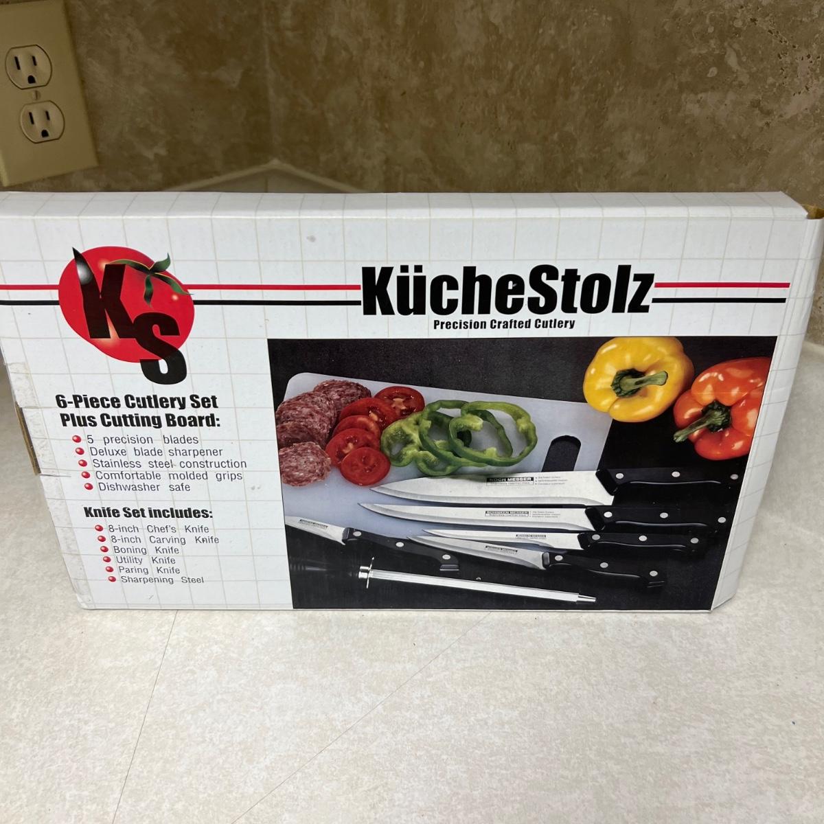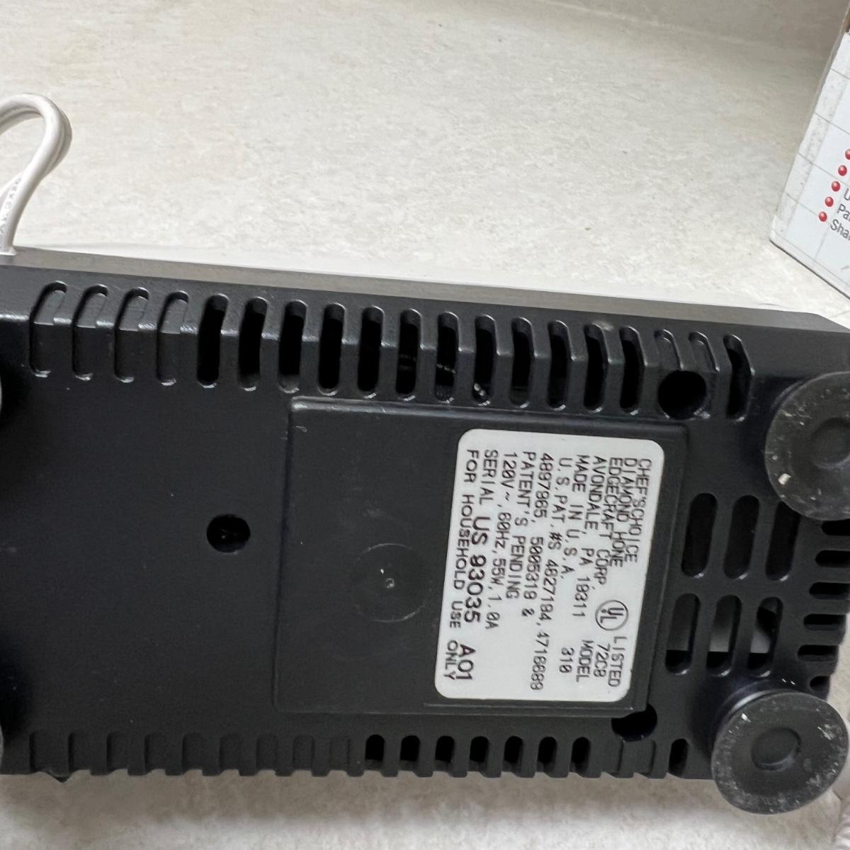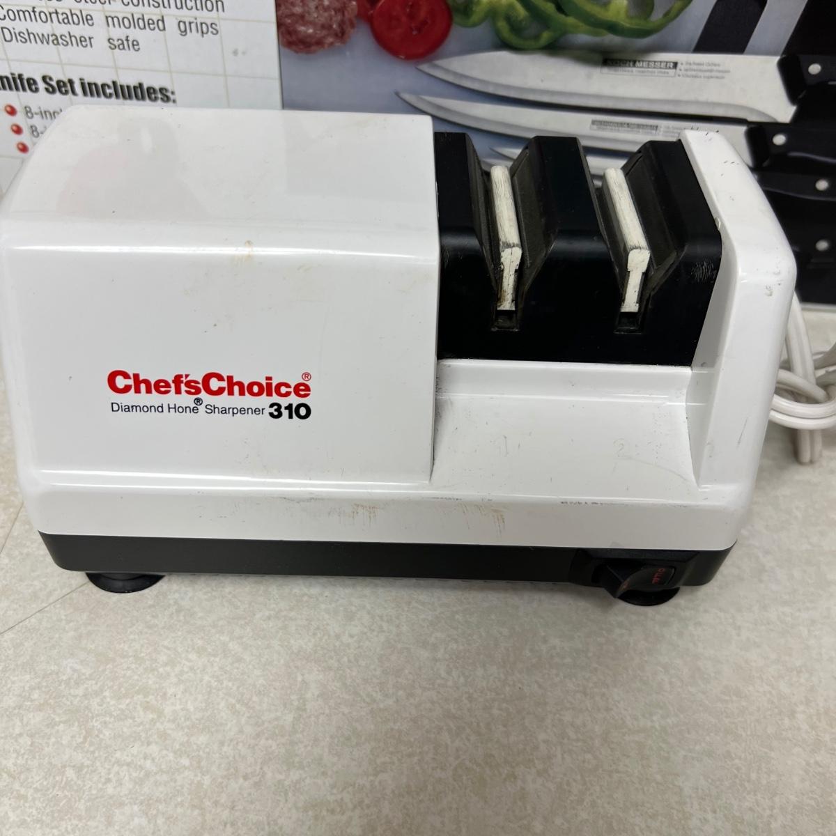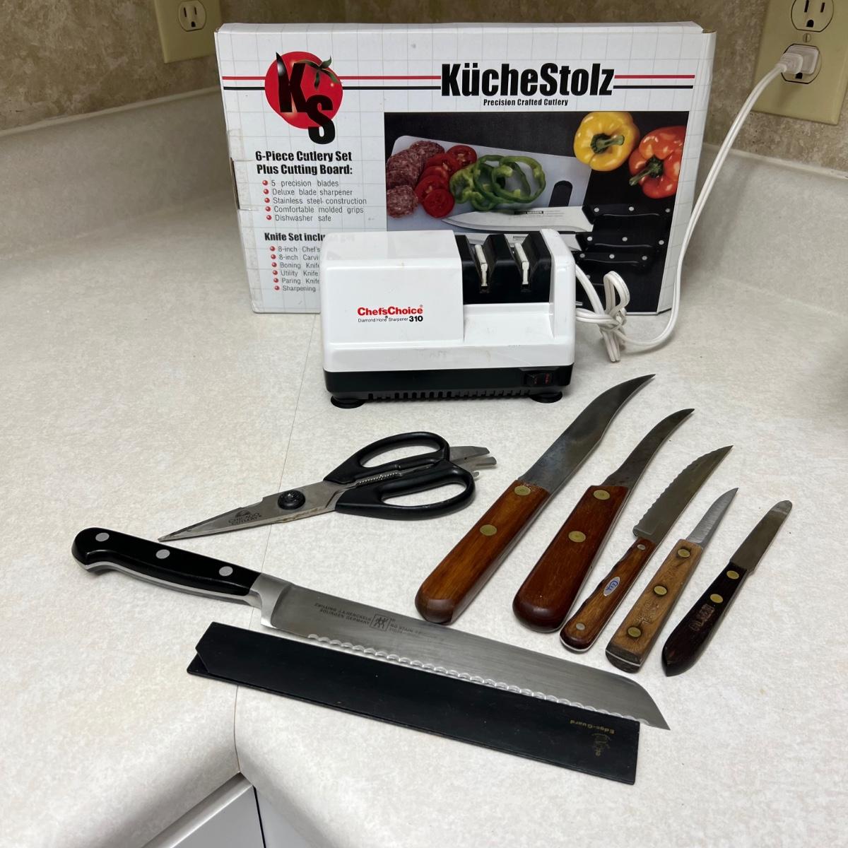 A great assortment of knives that includes NIB set of Kuchestolz and more. The Chef’s Choice electric sharpener powered on when plugged in.