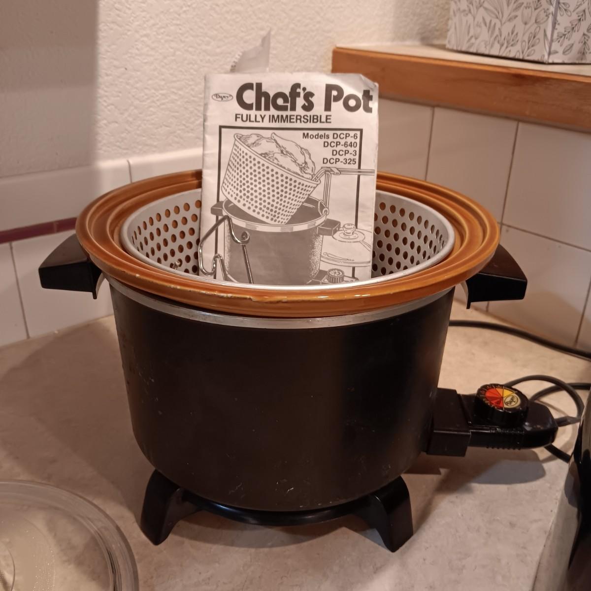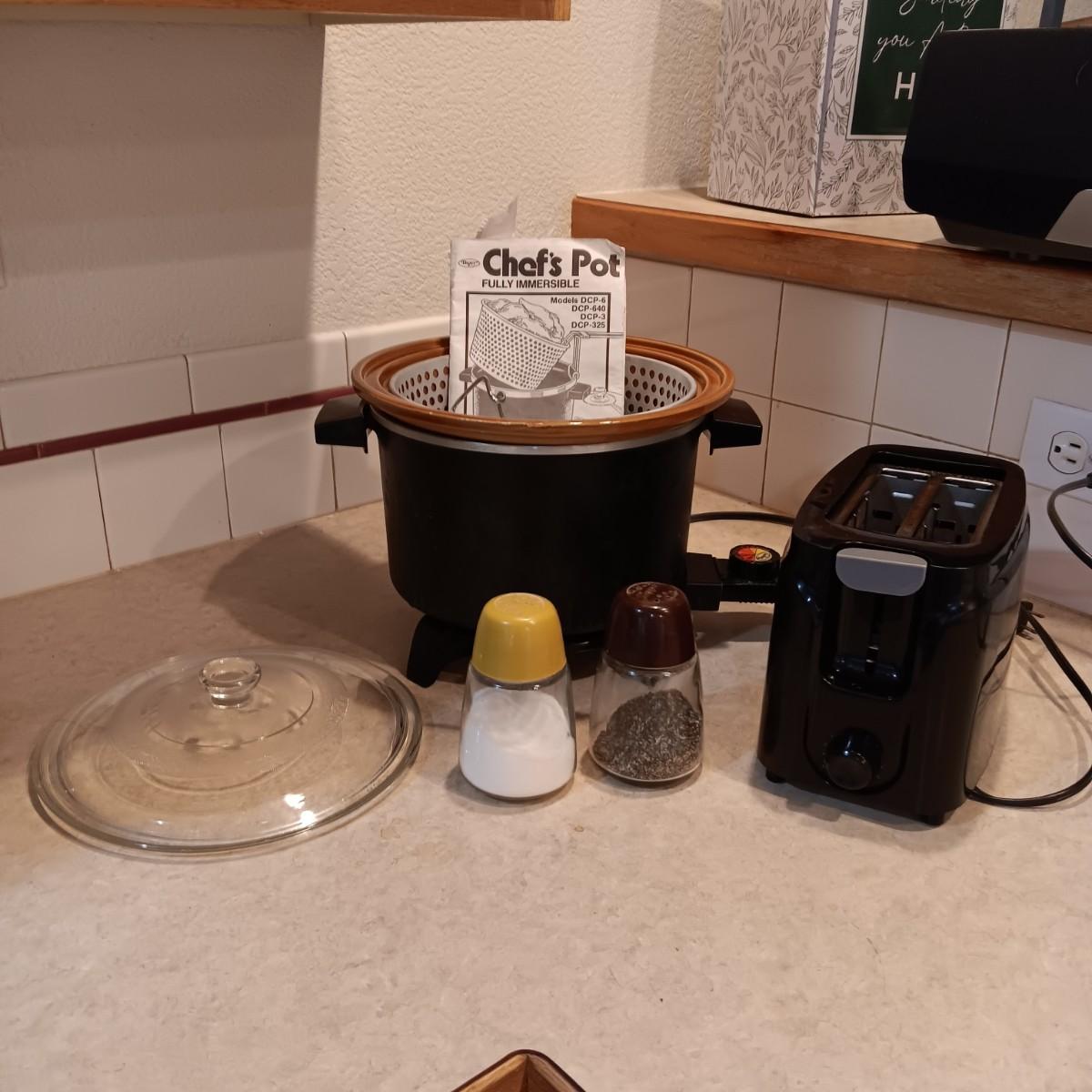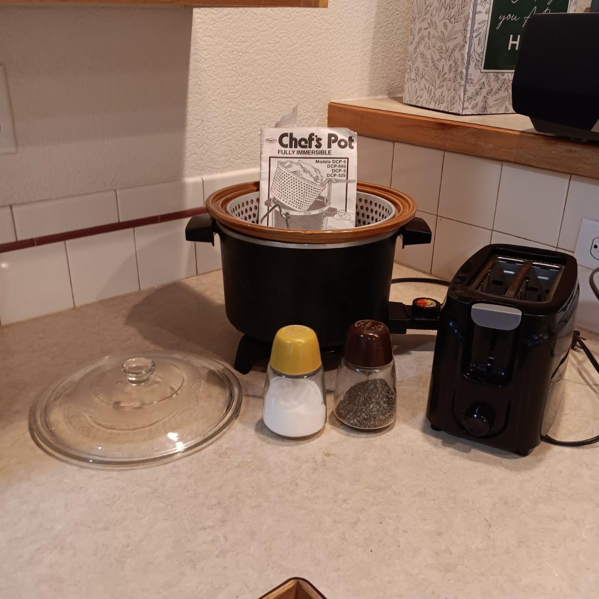 CHEF'S POT THAT FRIES/COOKS/STEAMS AND SLOW COOKS PLUS LARGE SHAKERS AND TOASTER