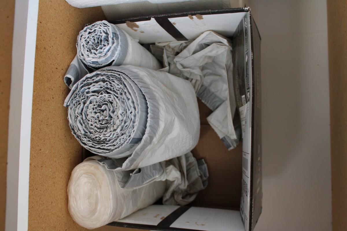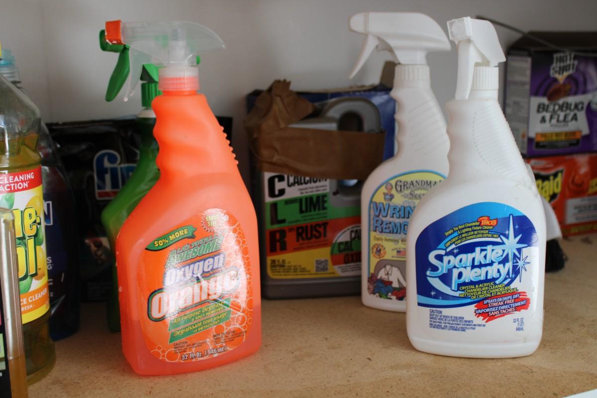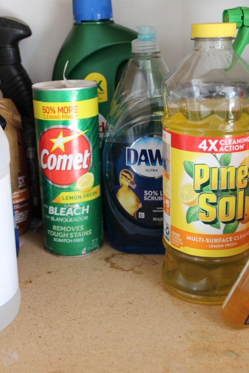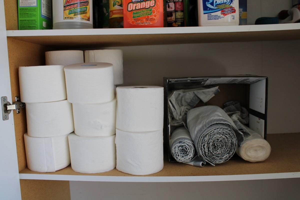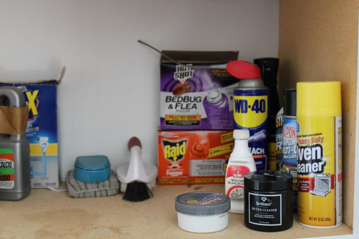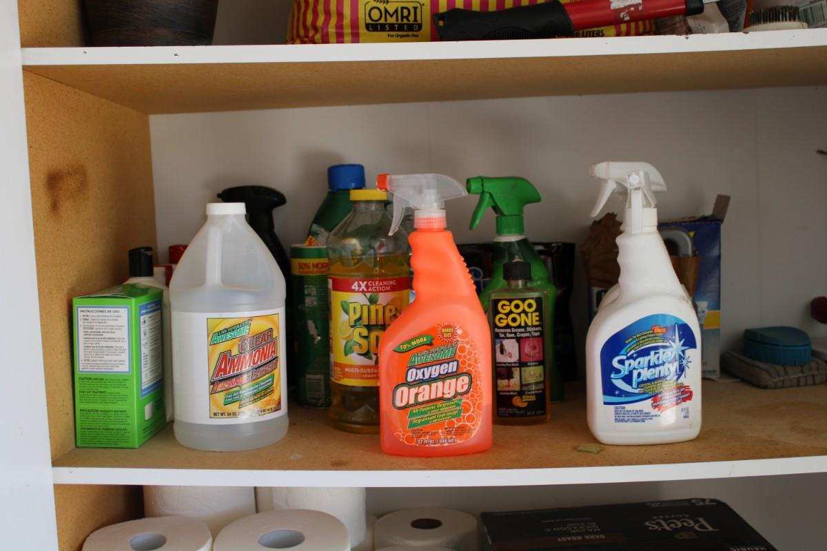 Dish soap, house cleaning supplies, metal polisher, chemicals, toilet paper and bags